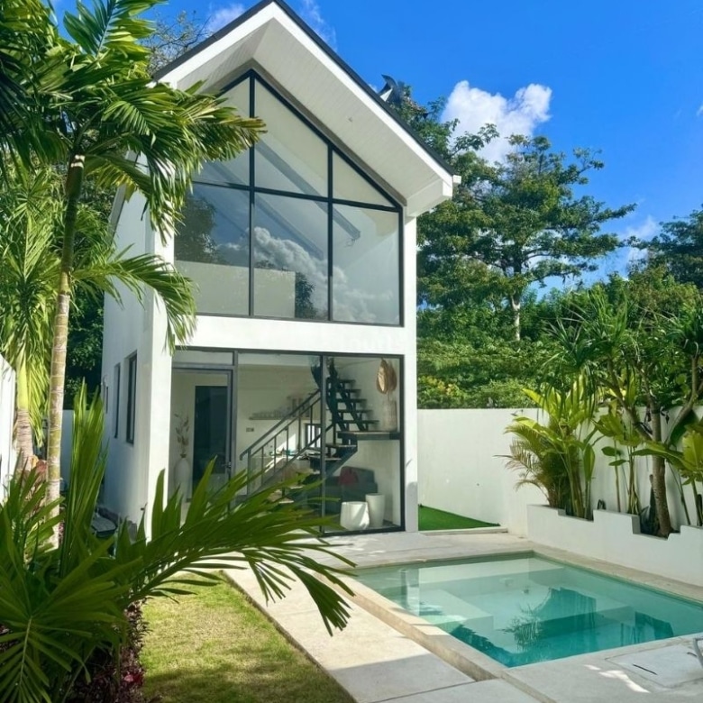 Spanning 180 square meters of land, the villa features a sleek two-level layout. The ground floor includes an enclosed living room, a simple kitchenette, and a spacious bedroom with an ensuite bathroom. The mezzanine serves as the second bedroom, also with its own ensuite, ensuring privacy and comfort for all.