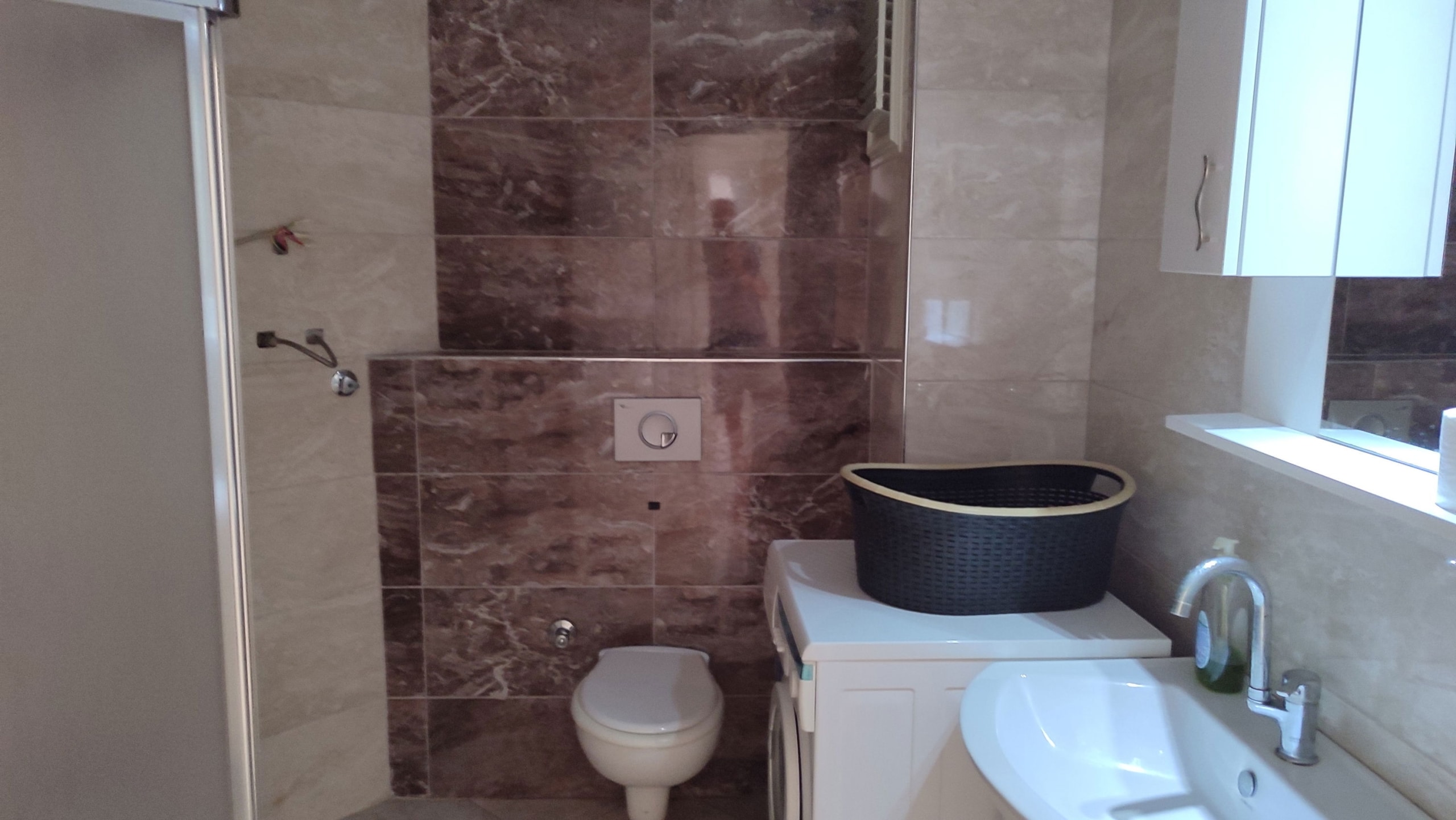 The villa includes multiple modern bathrooms. One is designed with white andnavy-bluetiles, glass shower cabin, and sleek fixtures. Another bathroom features a bathtub with warm-toned tiles, a modern vanity, and storage cabinets.