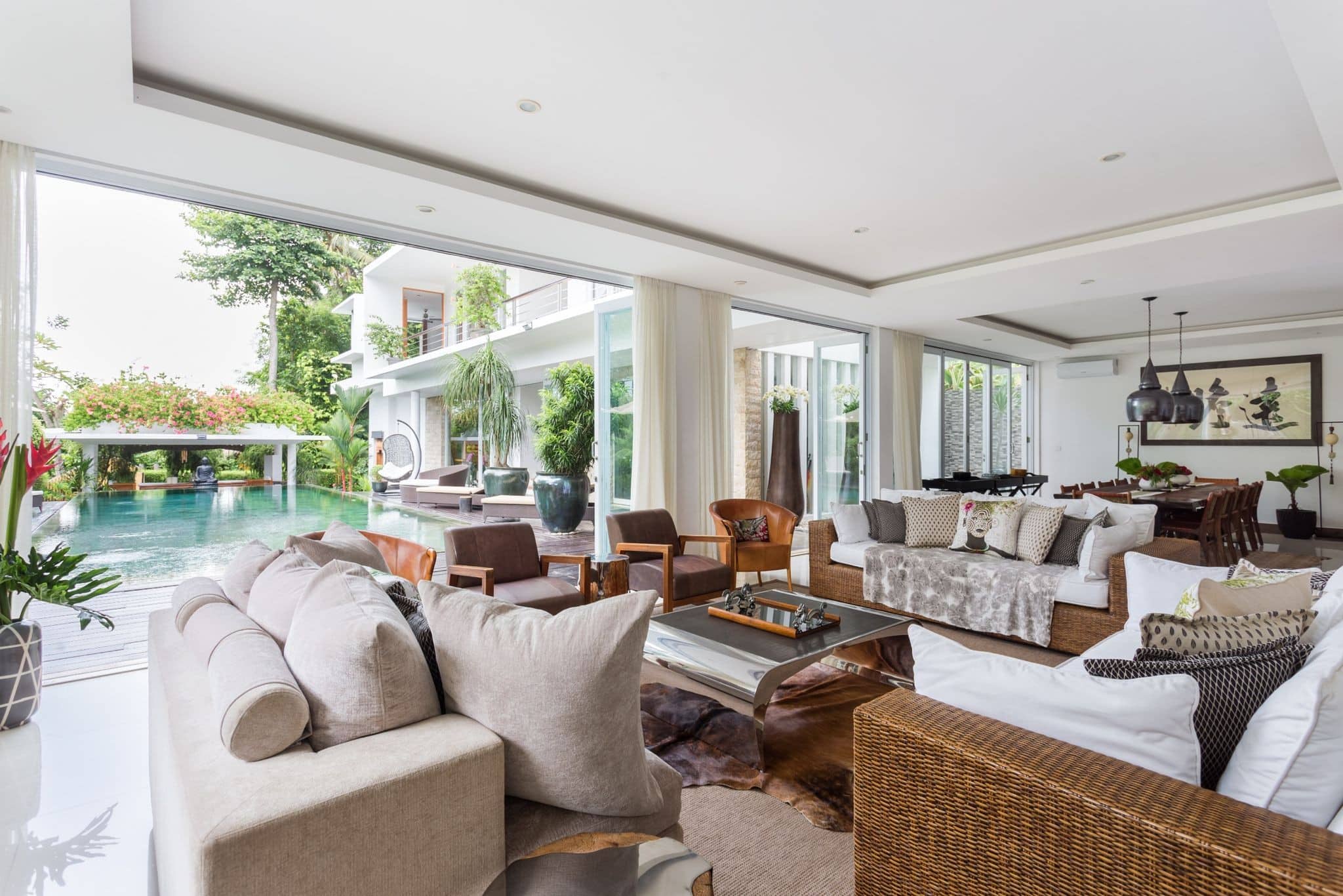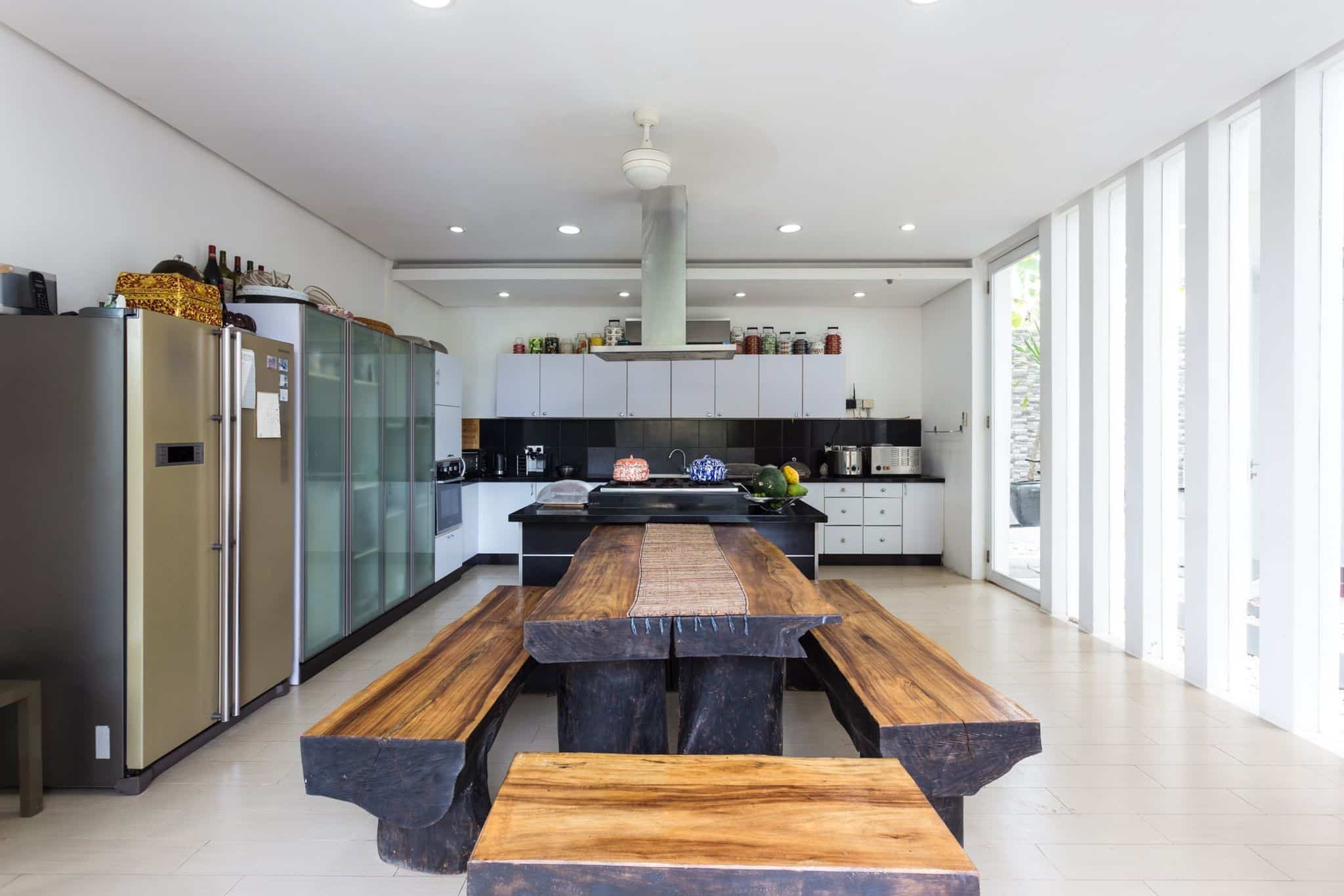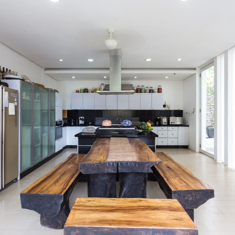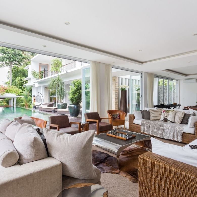 This beautifully designed contemporary villa is set around a large 15m x 5m swimming pool and gorgeous garden. The impeccably furnished indoor living space is extremely spacious with comfortable lounges and a long dining table that is great for dinner parties. Or dine alfresco on the terrace overlooking the gleaming pool. A fully equipped designer kitchen can be found in a separate room next to the living area. Enjoy special moments cooking together with family and friends gathered around the island.