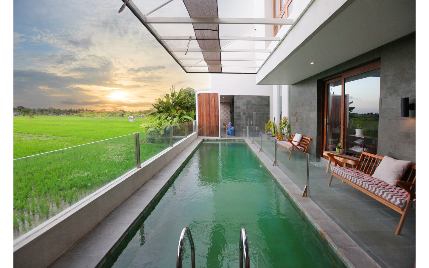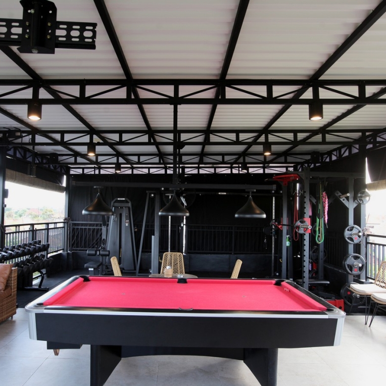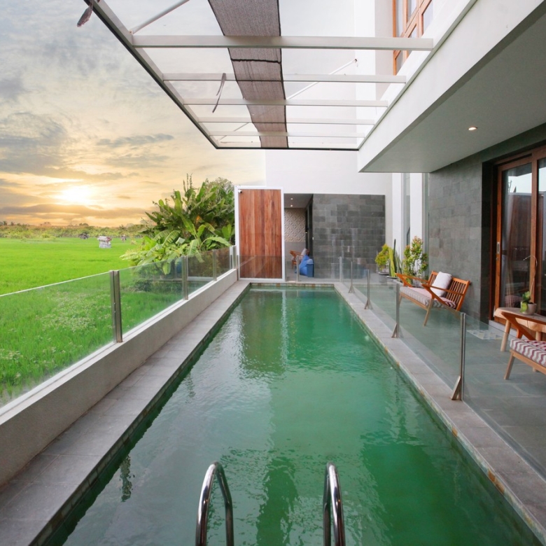 Step outside to discover the villa’s private oasis: a large, rectangular swimming pool (9 x 6 meters) surrounded by a beautifully landscaped tropical garden. This east-facing property ensures you enjoy the morning sun, with the tranquil rice fields offering a picturesque backdrop.
