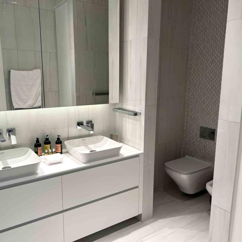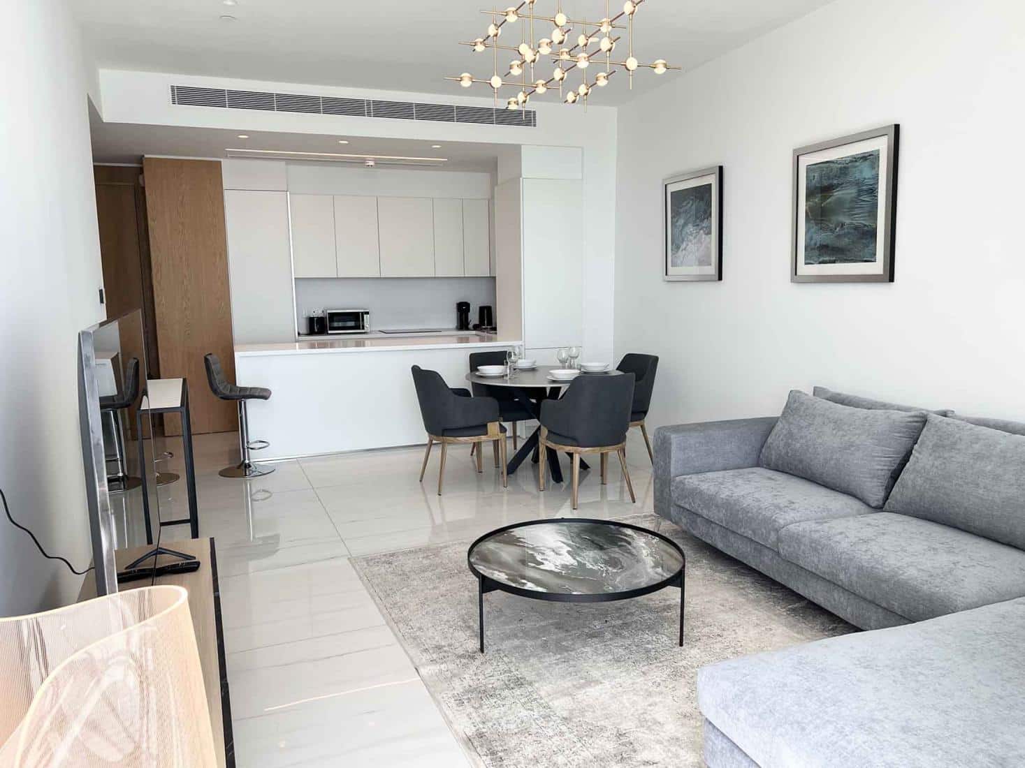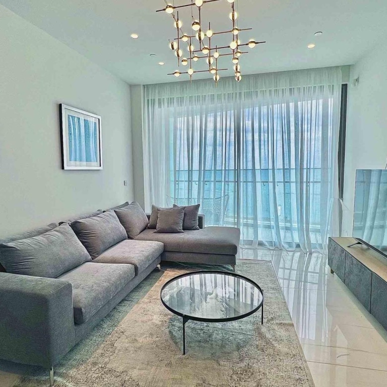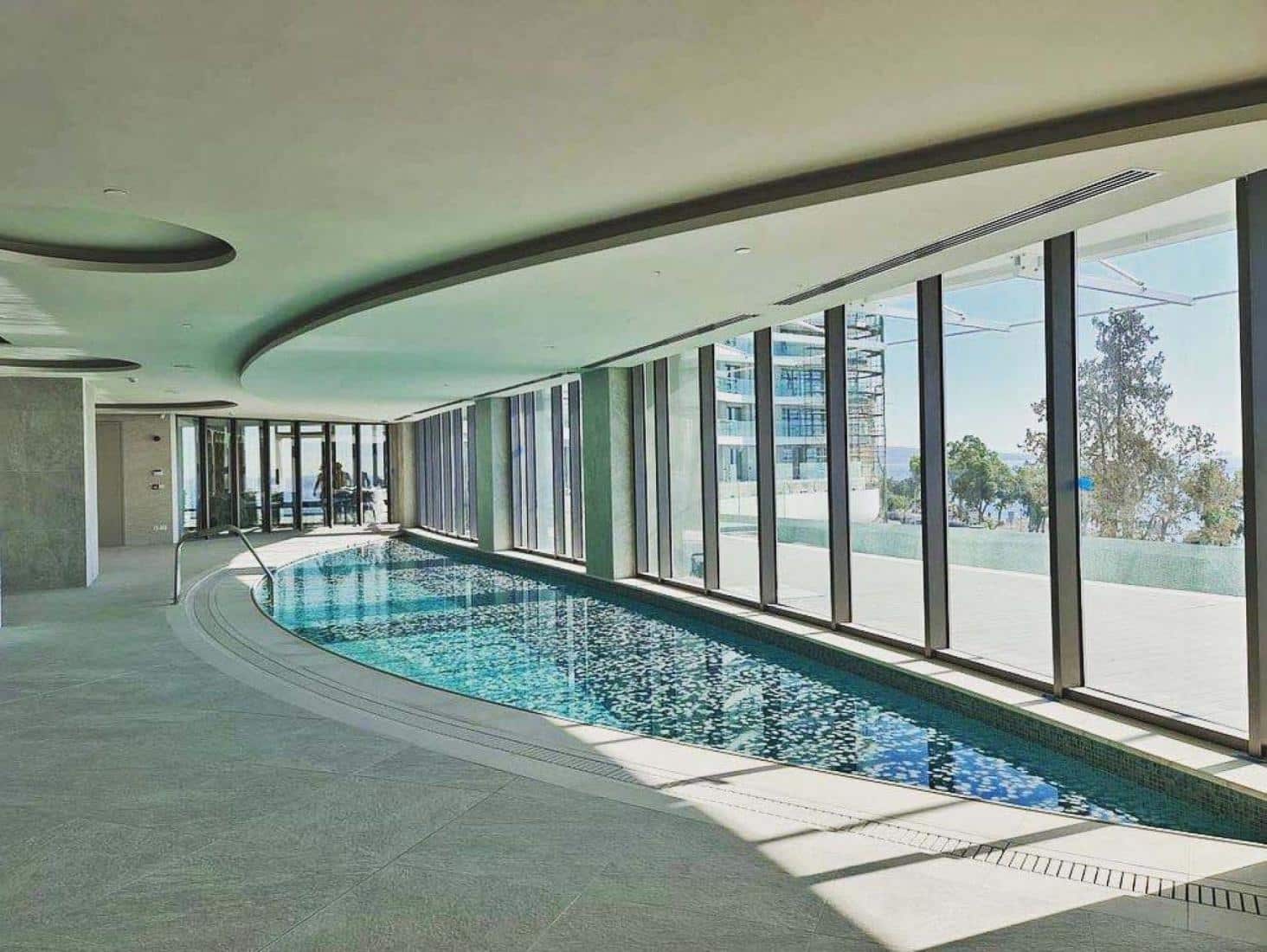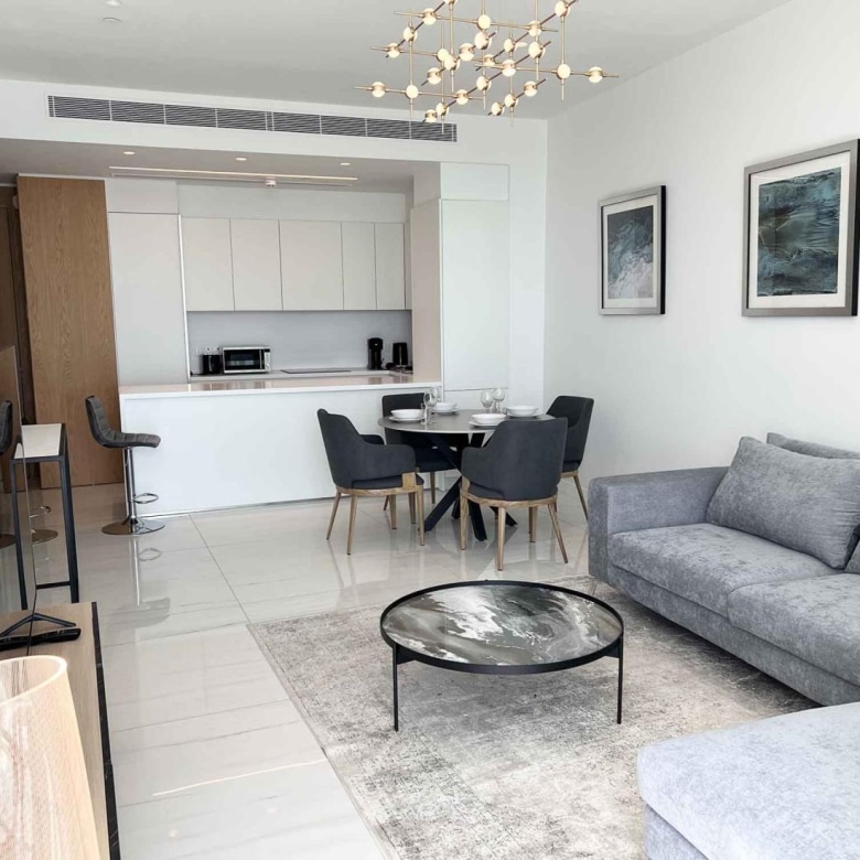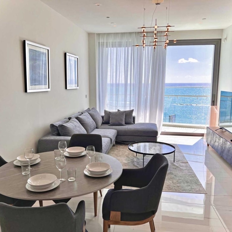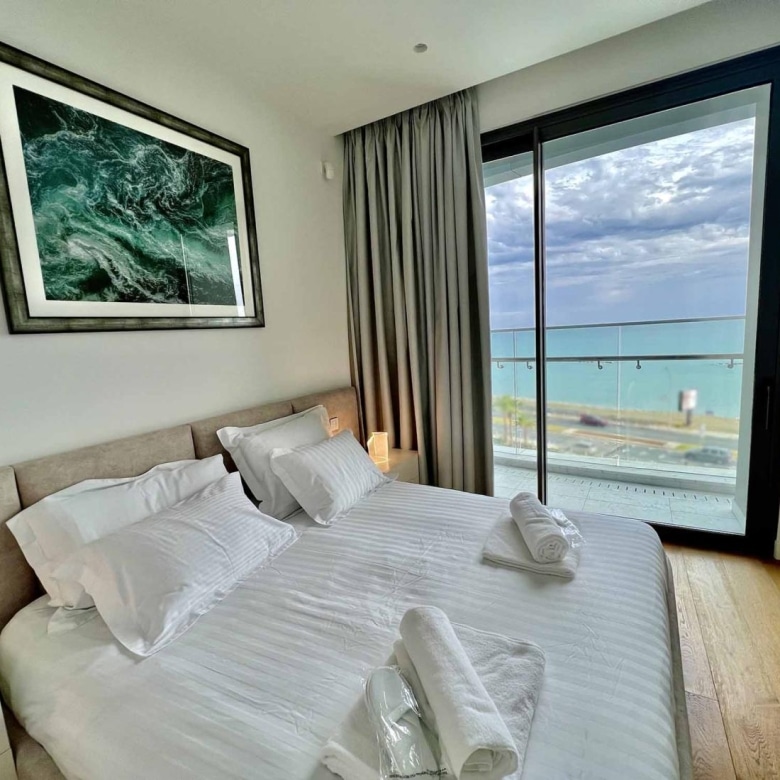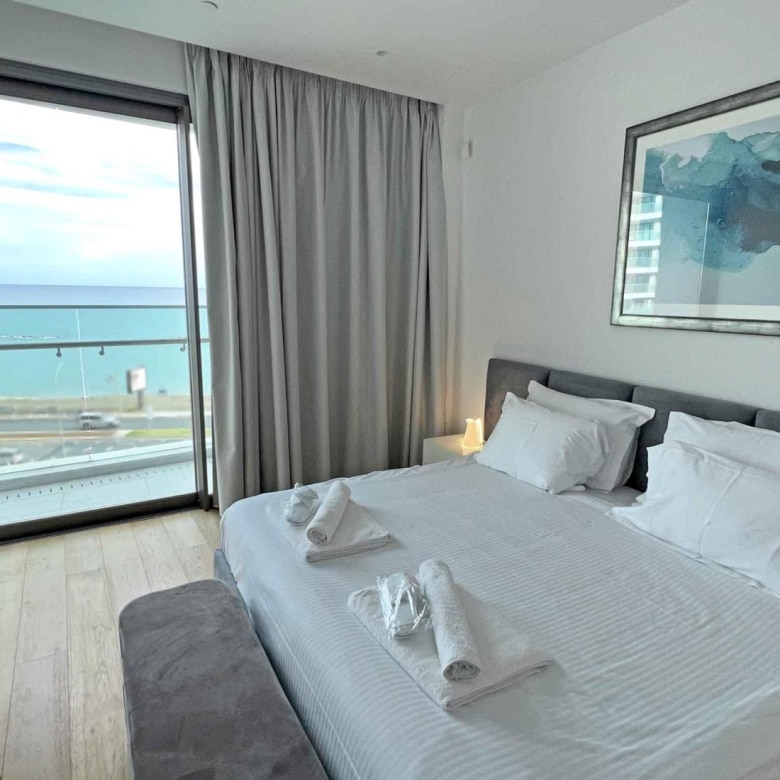 Luxurious two bedroom beachfront apartment in Limassol’s Germasogeia district, offering direct sea views. The apartment features an open-plan living, dining, and fully equipped kitchen area with a flat screen TV and WiFi. Both bedrooms have king size beds, wardrobes, AC, and ensuite bathrooms, with one also having a 50″ TV. The complex has high-quality finishes, a smart home system, and a range of amenities, including outdoor and indoor pools, a fitness center, sauna, and underground parking. There are also restaurants and branded stores in the commercial part of the complex.