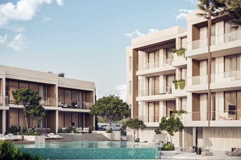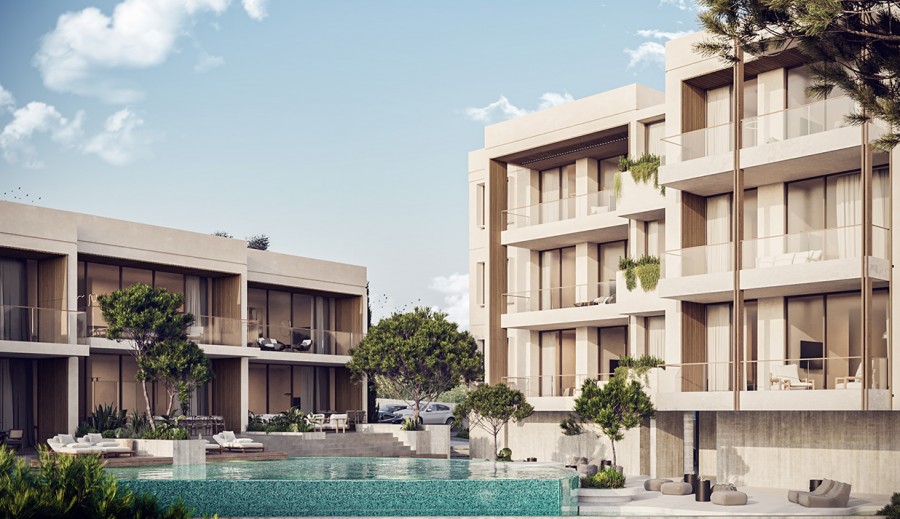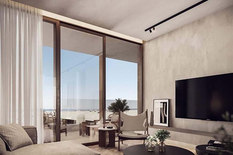 This stylish 1st-floor apartment offers 2 bedrooms and 2 bathrooms within an 86 m² covered area. The residence features a 16 m² veranda, perfect for soaking up the sun. Covered parking is included. All apartments are part of the exclusive development boasts a unique circular swimming pool surrounded by swim-up apartments, creating a distinctive living experience. Located near the picturesque coastal village of Kapparis, residents can enjoy charming cafes, delicious restaurants, and a vibrant nightlife. The development is scheduled for completion in May 2025, with some apartments already sold.