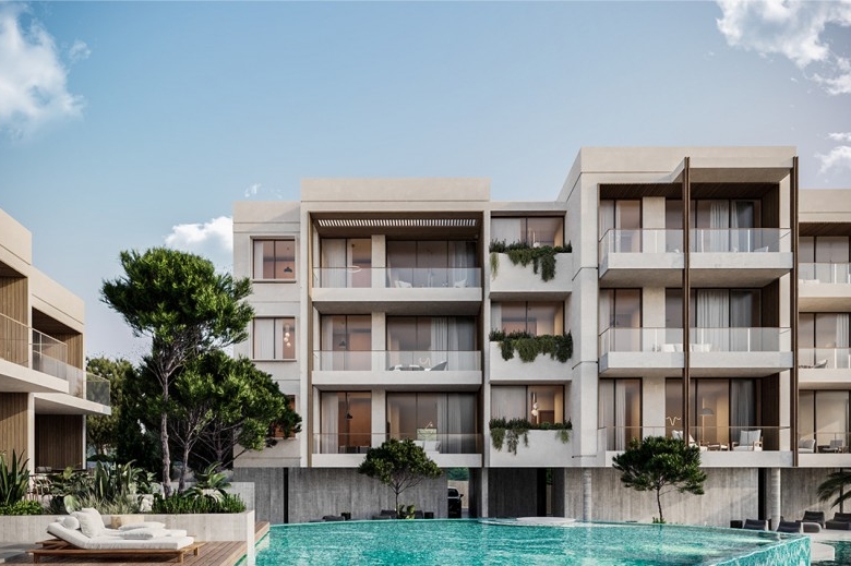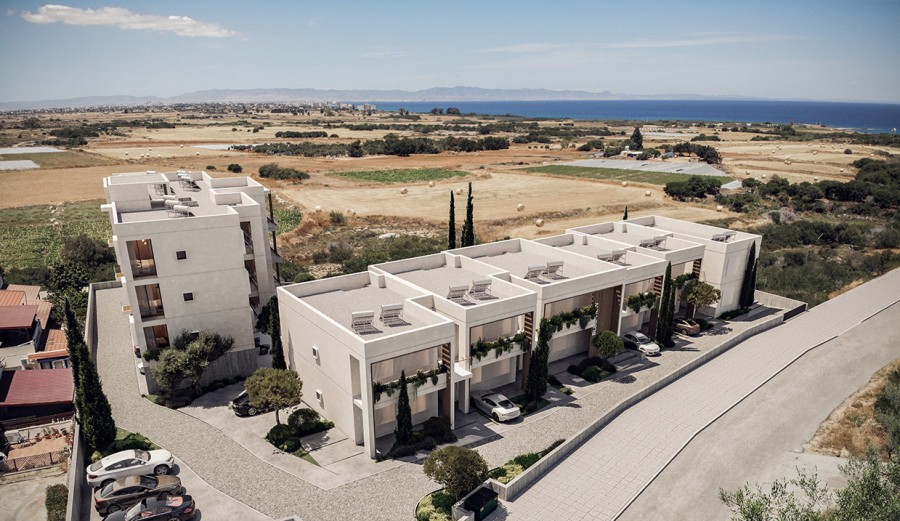 This premium 1st-floor apartment features 2 bedrooms and 2 bathrooms within an 86 m² covered area. The residence offers a 14 m² covered veranda and a 6 m² open veranda, perfect for alfresco dining and relaxation. Additional amenities include a private roof garden and covered parking. All apartments are part of the exclusive development boasts a unique circular swimming pool surrounded by swim-up apartments, creating a distinctive living experience. Located near the picturesque coastal village of Kapparis, residents can enjoy charming cafes, delicious restaurants, and a vibrant nightlife. The development is scheduled for completion in May 2025, with some apartments already sold.