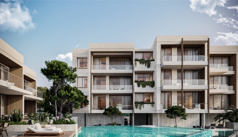 Located on the 1st floor, this 2-bedroom, 2-bathroom apartment encompasses a total covered area of 80 m². The property boasts an 11 m² covered veranda and a 7 m² open veranda, providing comfortable outdoor spaces. Enjoy the benefits of a private roof garden and covered parking. All apartments are part of the exclusive development boasts a unique circular swimming pool surrounded by swim-up apartments, creating a distinctive living experience. Located near the picturesque coastal village of Kapparis, residents can enjoy charming cafes, delicious restaurants, and a vibrant nightlife. The development is scheduled for completion in May 2025, with some apartments already sold.