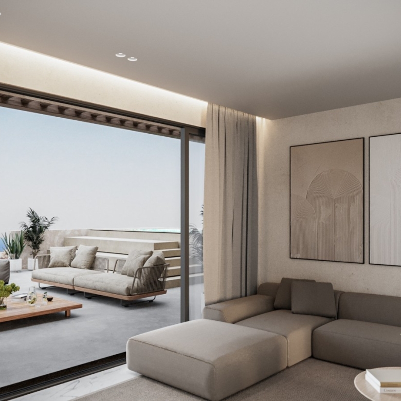 The Apartments are located in Protaras, in close proximity to the city of Paralimni, but also very close to the Kapparis area. One of the most popular regions of Protaras that is active throughout the year, providing dozens of amenities and entertainment options. The project is on a hill offering unobstructed sea views of Famagusta and Kapparis. The project consist of six blocks of apartments which provide a sense of privacy, comprising of 64 apartments with sea views or views of the communal swimming pool. They also include penthouses with a private pool and apartments with a private garden. Built in such a way as to convey the sense of a summer resort, the apartments stand out for their bohemian minimalist flair, their clear-cut lines and the quality of materials. It’s a project that accentuates design, while satisfying all contemporary lifestyle needs. The spacious common areas give a sense of openness to the residents, thus making it not only a holiday haven, but also the ideal permanent residence. Located between Paralimni and Kapparis, it gives the advantage to each resident to enjoy the magical sea view throughout the year. Apart from that, it offers quick access to the amenities located in the city of Paralimni, while being only a few minutes away from some of the finest beaches in Cyprus, located in Protaras