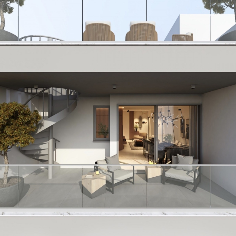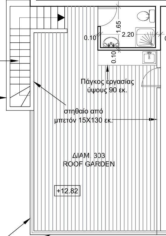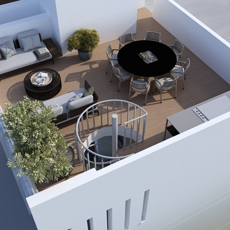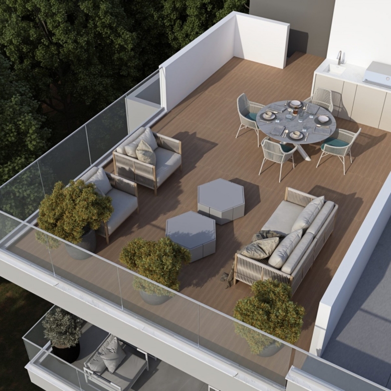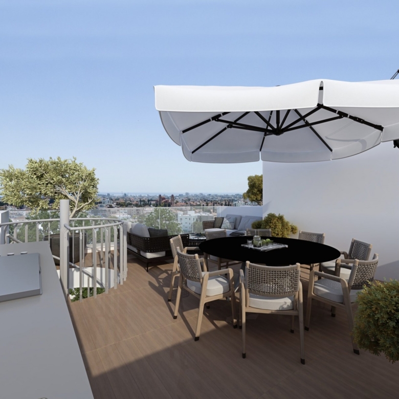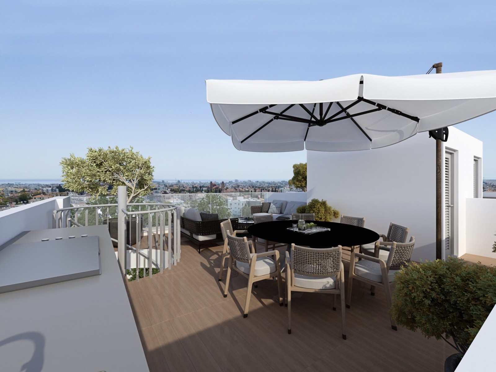 Featuring three floors of luxury two-bedroom and three-bedroom apartments, each with two bathrooms, large covered terraces, and private parking. Designed with a minimal, contemporary approach, every apartment offers a spacious, comfortable environment. Open-plan kitchens and living rooms seamlessly connect with large terraces, while the highest quality materials ensure an exceptional living experience. Situated in a central yet quiet area of Aradippou near the Townhall. This unit has a roof garden area of 45 square meters.