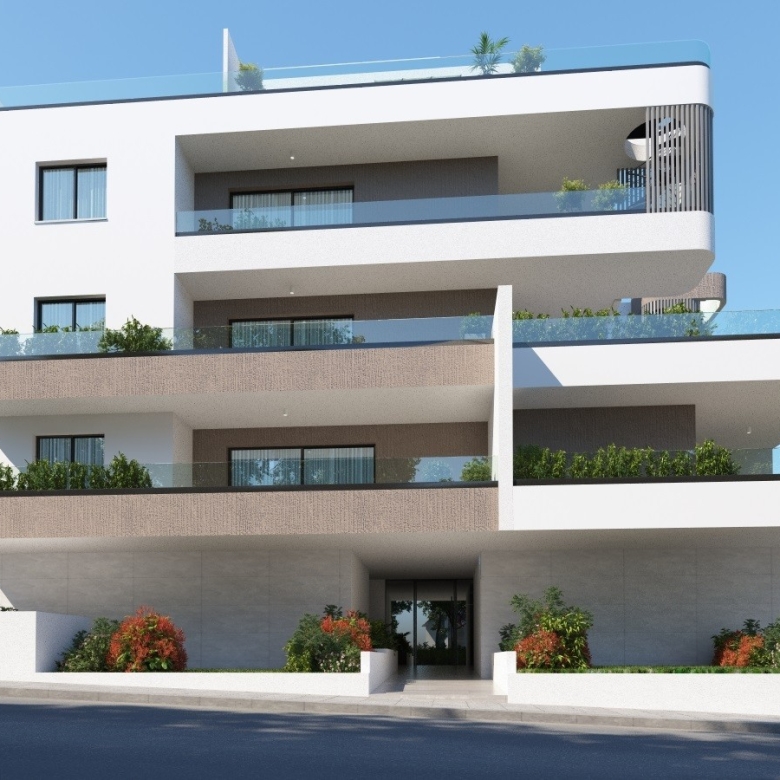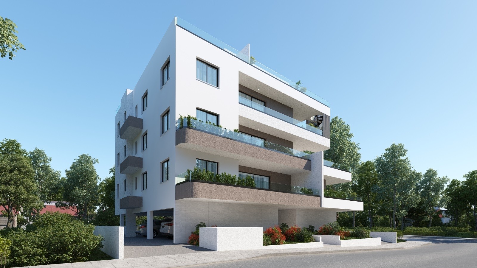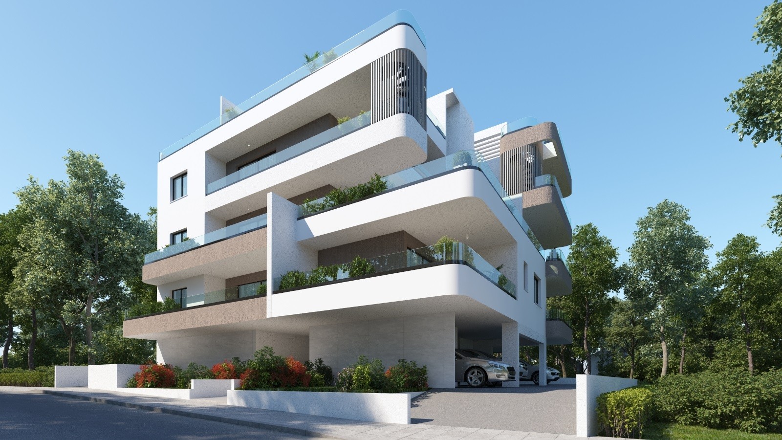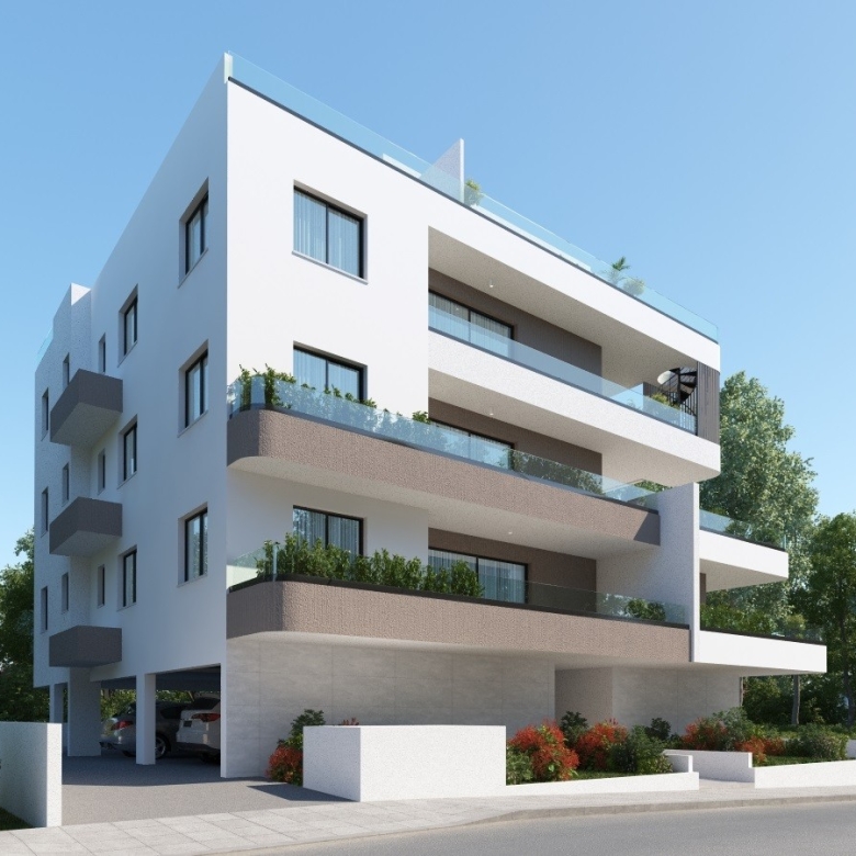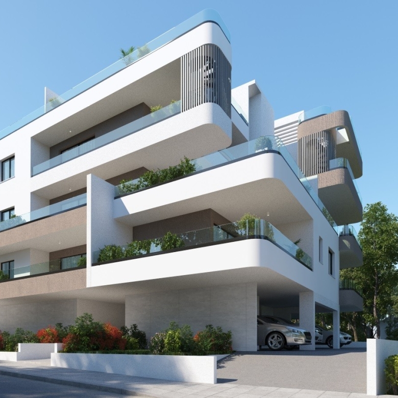 New project located in Aradippou. The modern design of the apartment building emphasizes the detail and ensures the privacy of the residents. It is a three-story building apartment building with seven comfortable and modern apartments. There is sheltered
