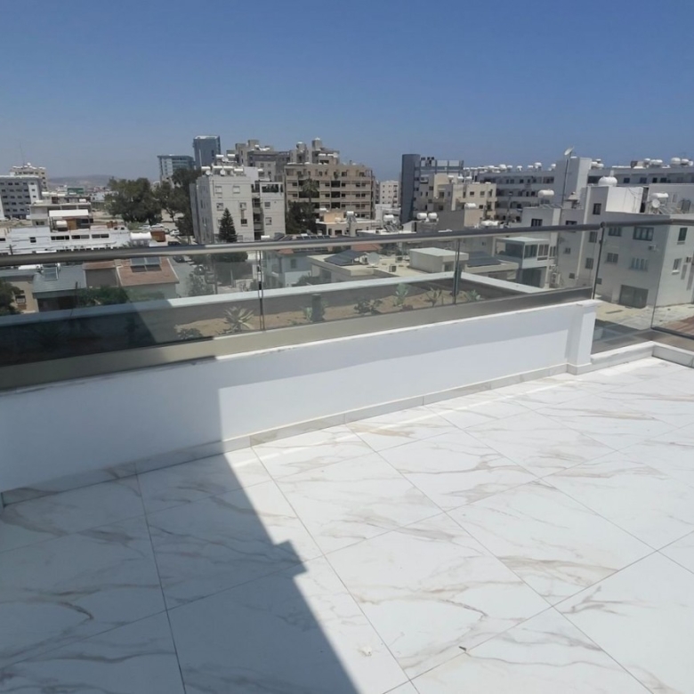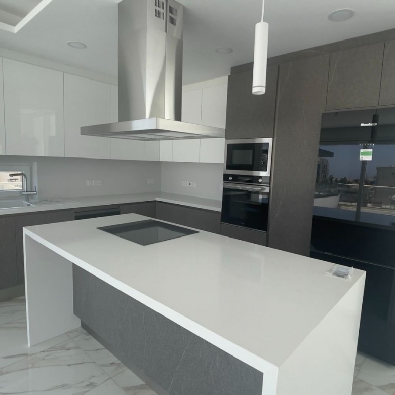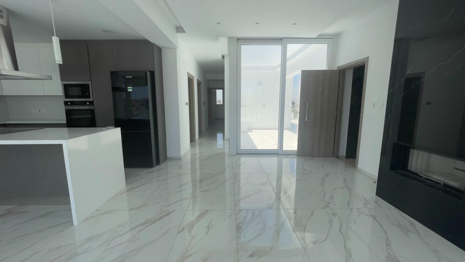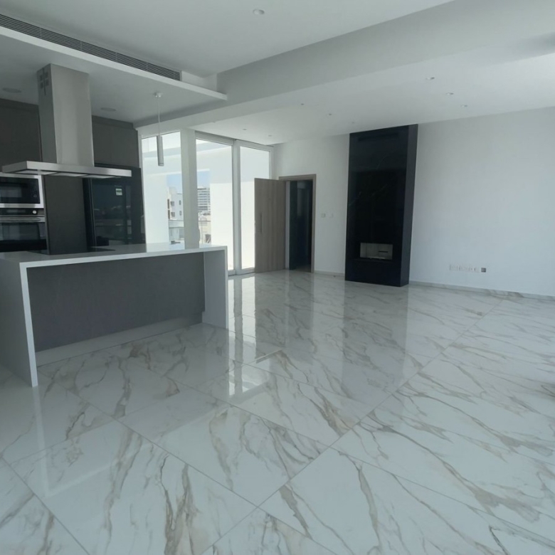 Luxurious 4th-floor apartment with 3 bedrooms, 2 bathrooms, guest WC, spacious living room, and sleek Italian kitchen. Features include marble flooring, indoor fireplace, high ceilings, double glazing, modern design, and a large balcony with stunning city views. Conveniently located near bus routes, amenities, and main roads. Modern facilities include central air-conditioning, underfloor heating, solar photovoltaic panels (5kVA), smart home technology, elevator access, and 2 covered parking spaces.