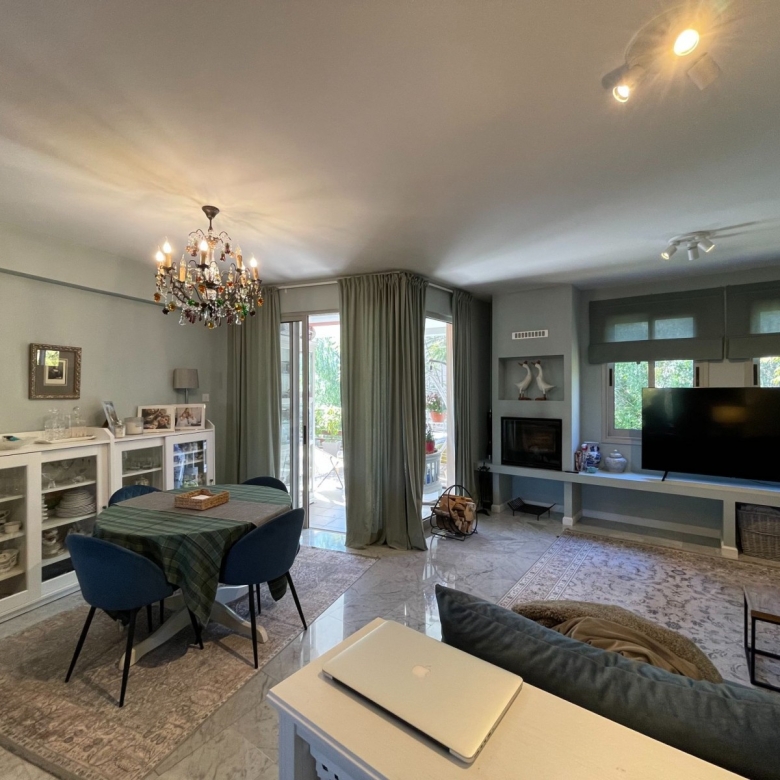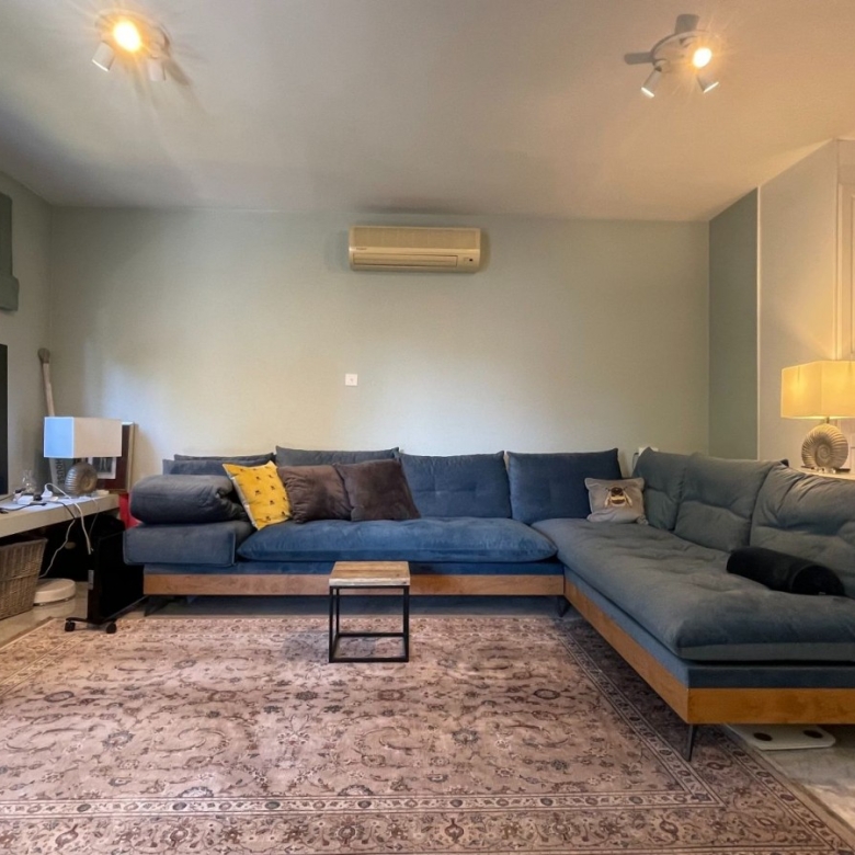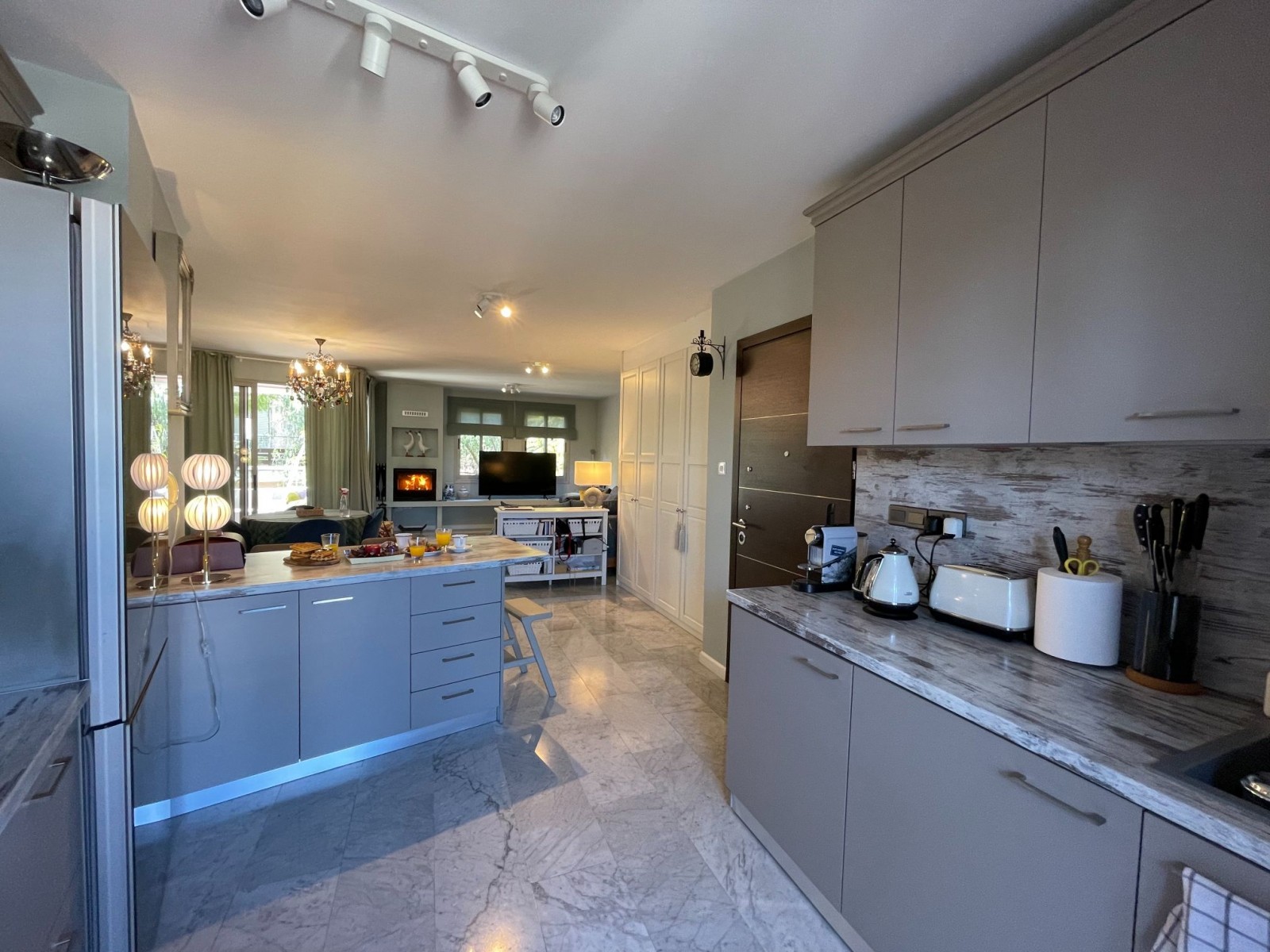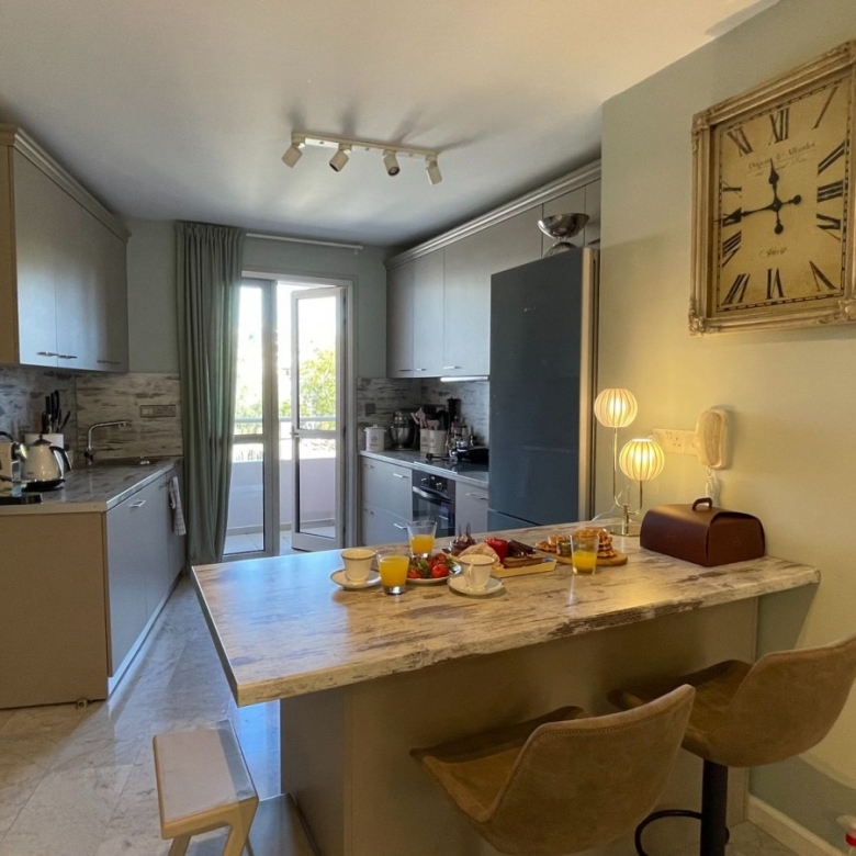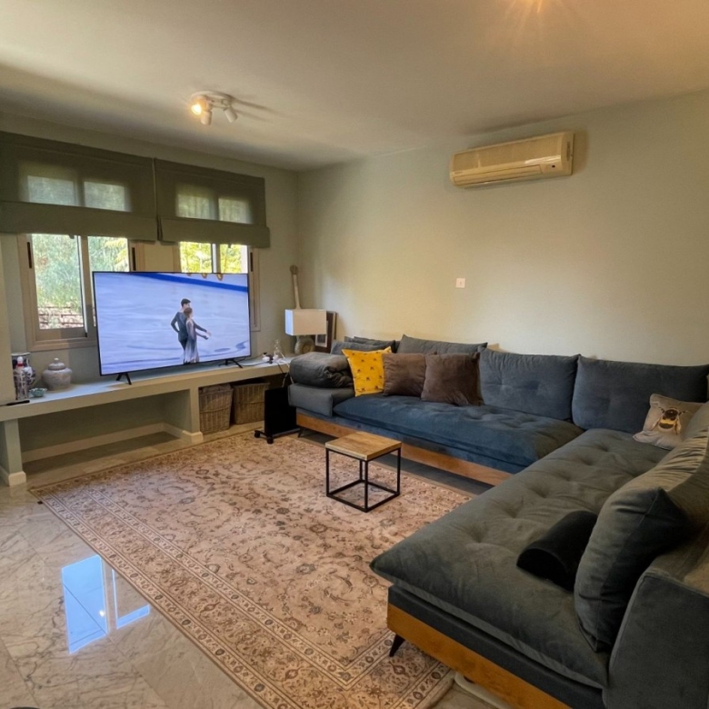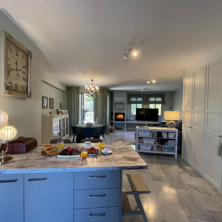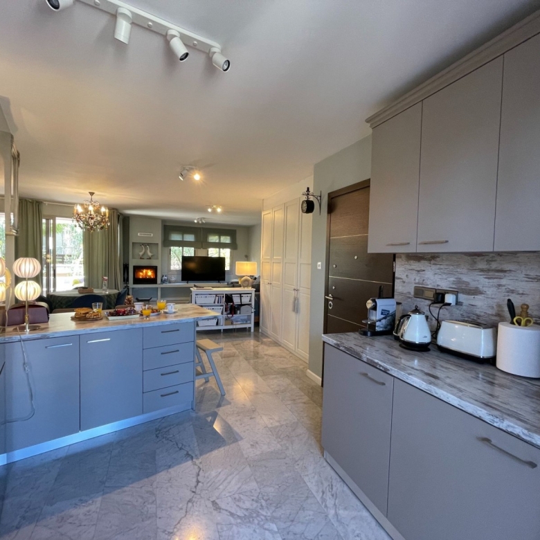 A modern two-bedroom apartment is located on the second floor in a private gated complex, 150 m walking distance to the beach, and all kinds of amenities. The total area is around 122 sq. m, and it consists of an open-plan kitchen connected with a dining and living area, 2 bedrooms, a family bathroom, and a covered veranda. The apartment is fully furnished and equipped, with air conditions, a real fireplace (for wood), parquet in bedrooms, double-glazed windows. Also, there is storage and covered parking. The complex is gated with 24h CCTV camera surveillance, has 2 common swimming pools, a gym, sauna, landscaped gardens, children’s playground, electric gate with the code, and guest parking.