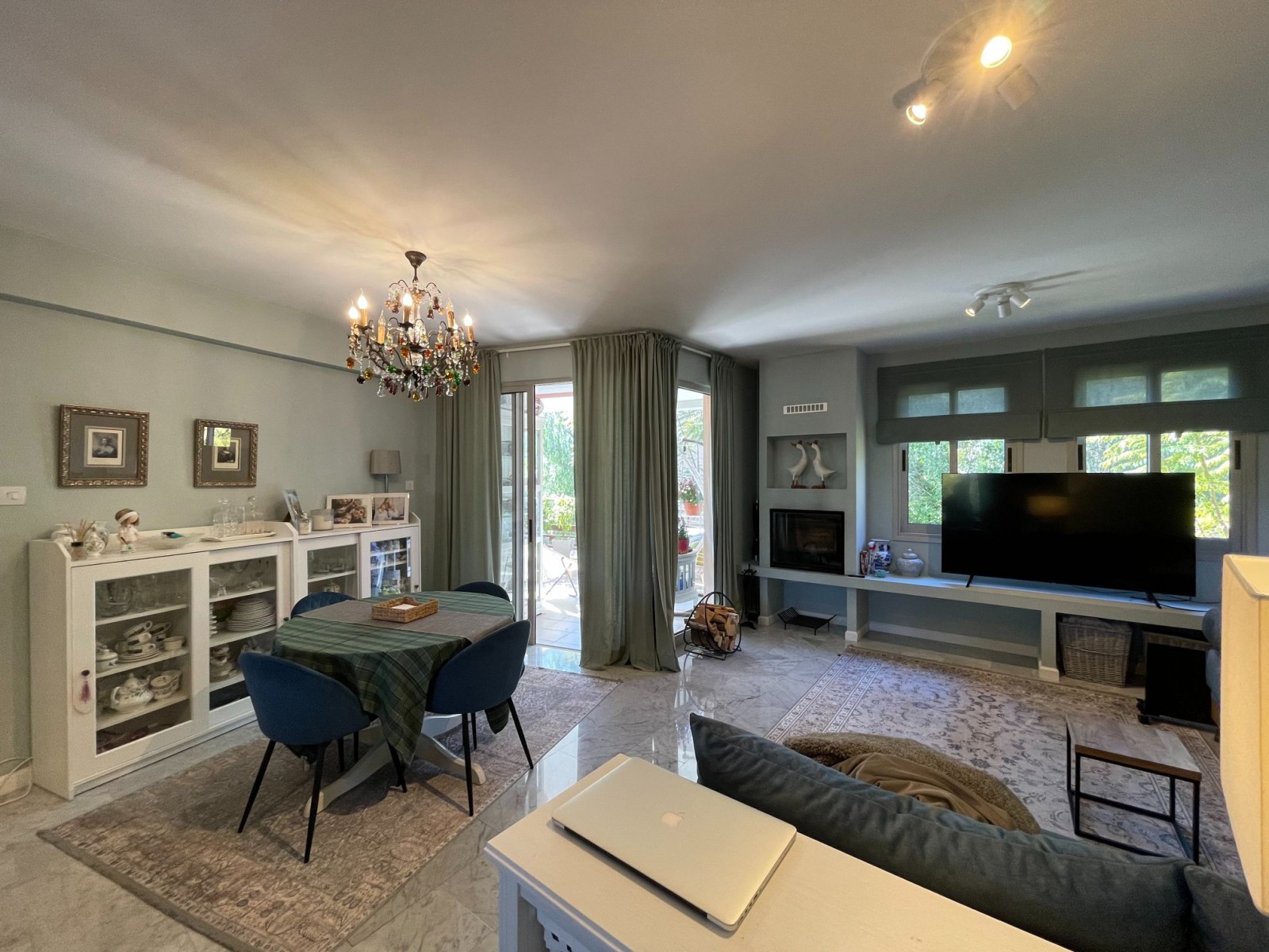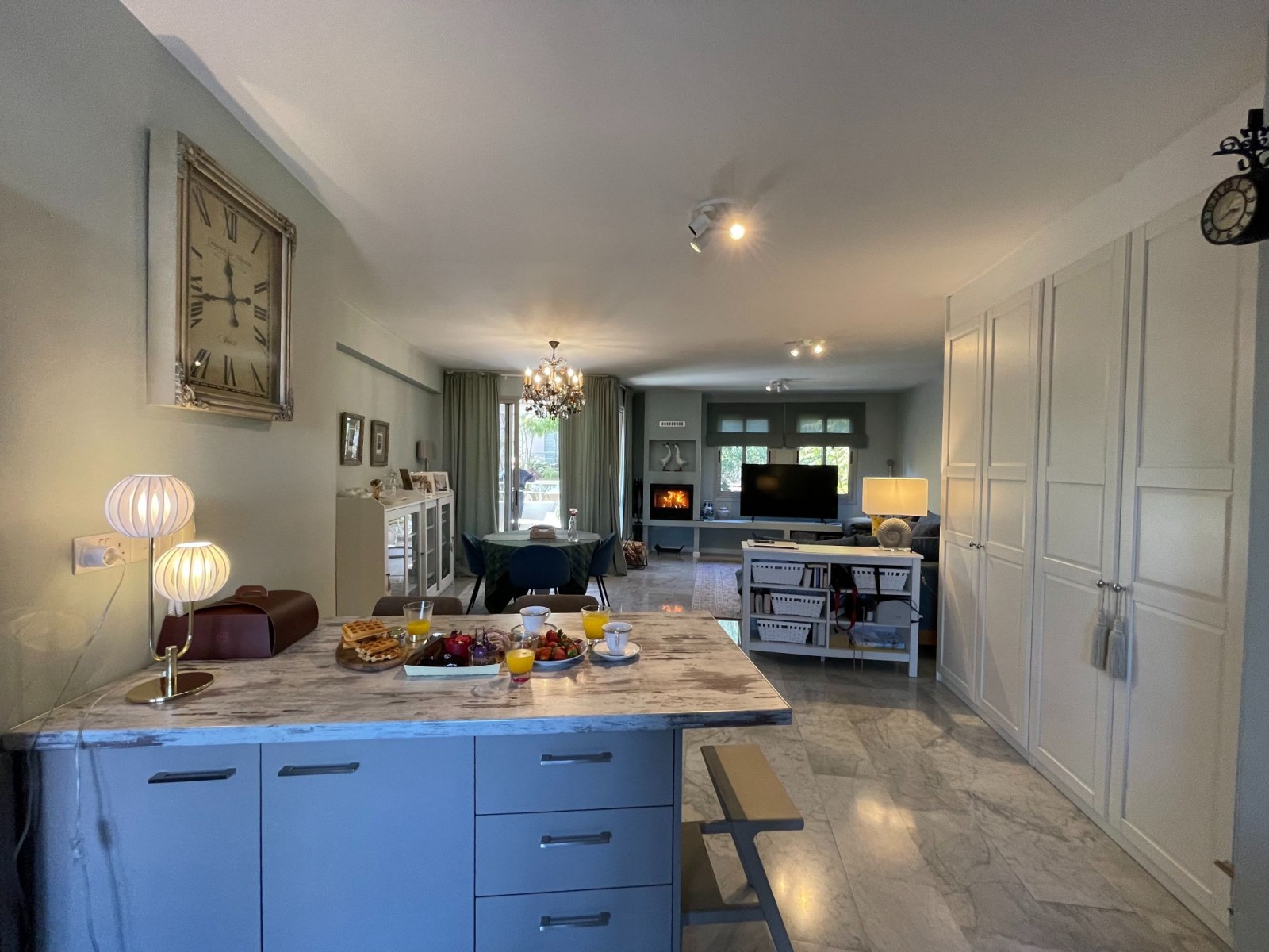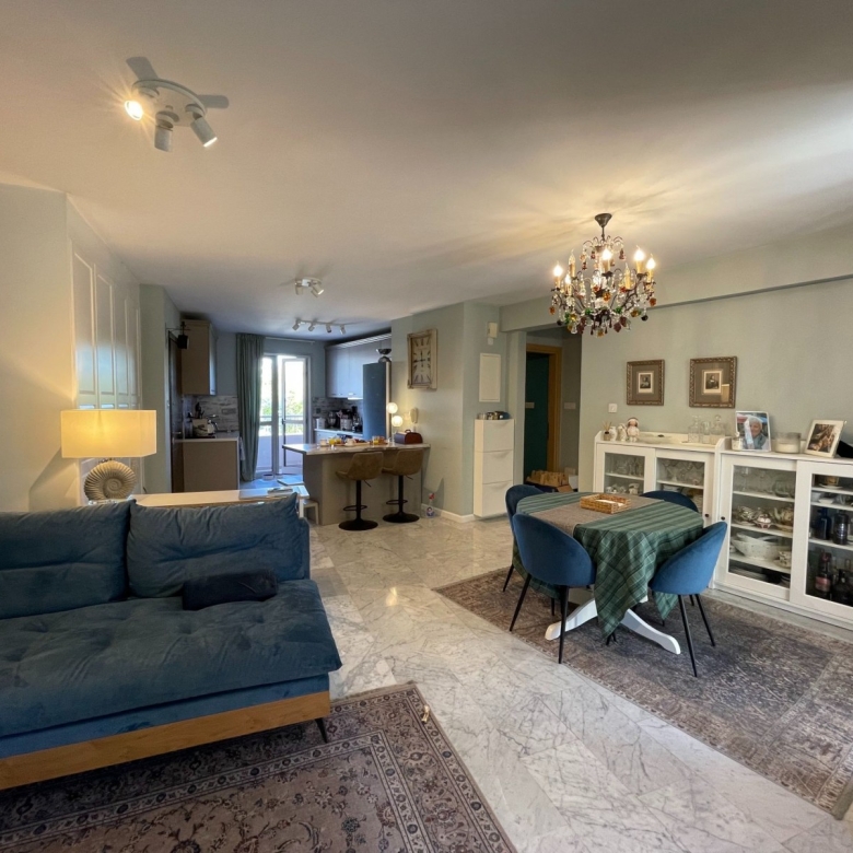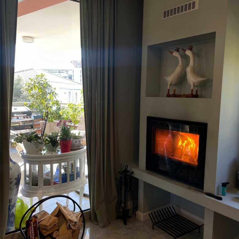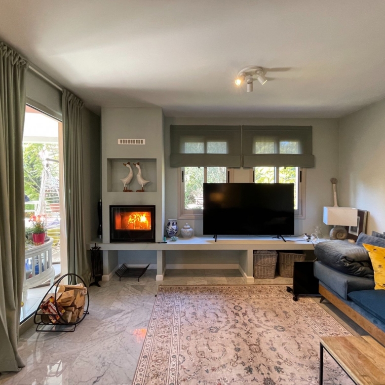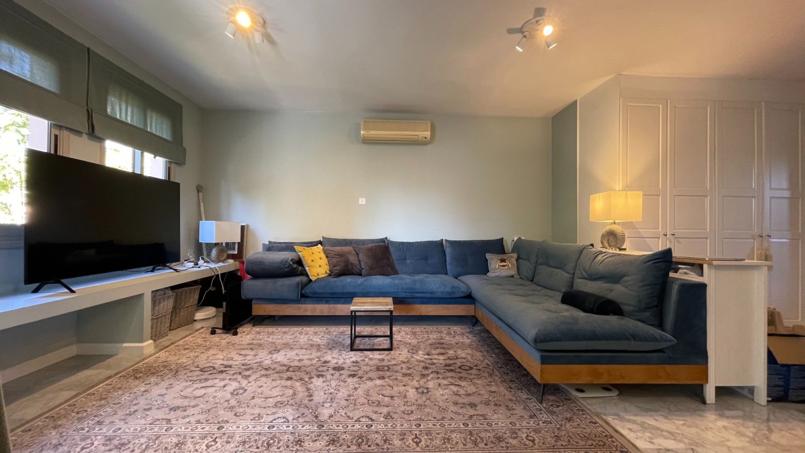 A modern two-bedroom apartment is located on the second floor in a private gated complex, 150 m walking distance to the beach, and all kinds of amenities. The total area is around 122 sq. m, and it consists of an open-plan kitchen connected with a dining and living area, 2 bedrooms, a family bathroom, and a covered veranda. The apartment is fully furnished and equipped, with air conditions, a real fireplace (for wood), parquet in bedrooms, double-glazed windows. Also, there is storage and covered parking. The complex is gated with 24h CCTV camera surveillance, has 2 common swimming pools, a gym, sauna, landscaped gardens, children’s playground, electric gate with the code, and guest parking.