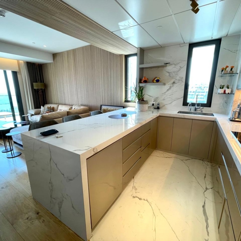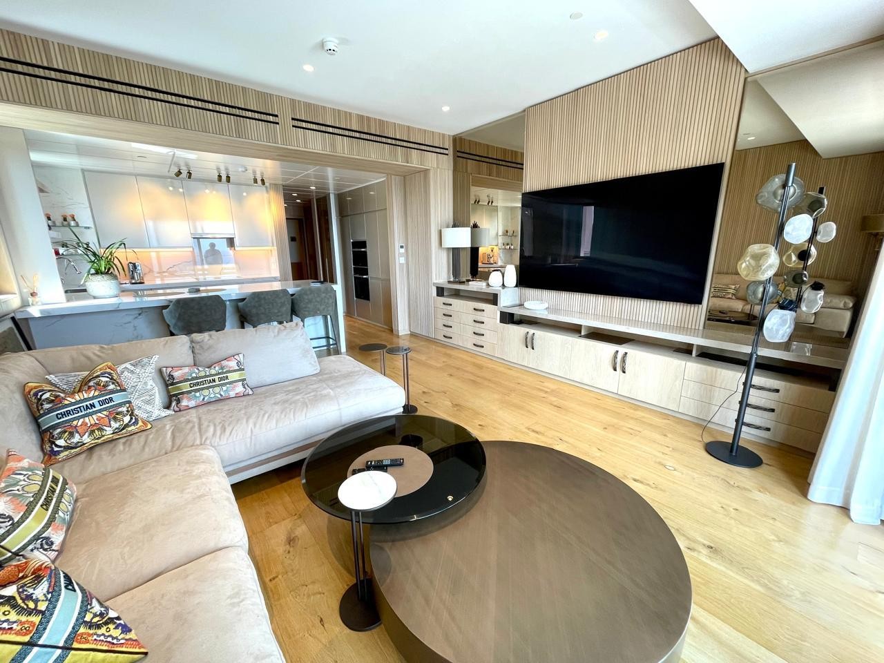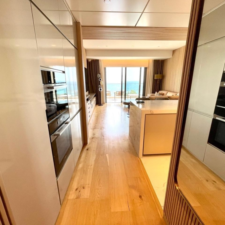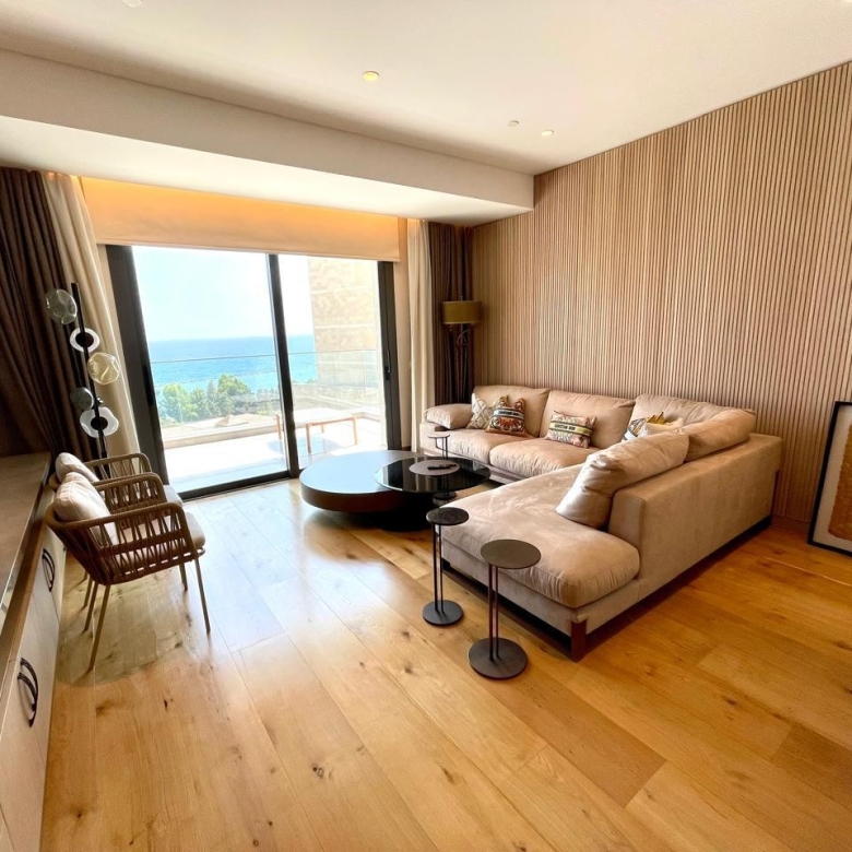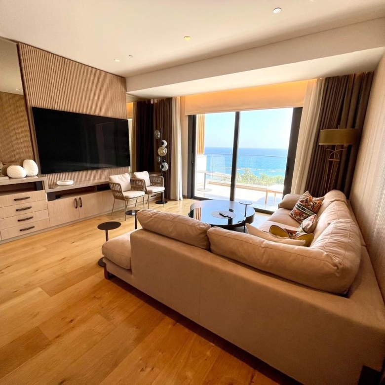 Exquisitely designed, it combines premium aesthetics with elevated comfort and functionality. Large, floor-to-ceiling windows allow an abundance of natural light to stream in, with the azure blue waters of the Mediterranean acting as a picture-perfect backdrop against the warm elements of the interiors.
