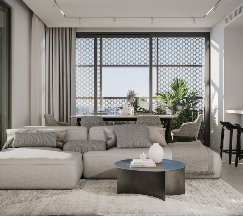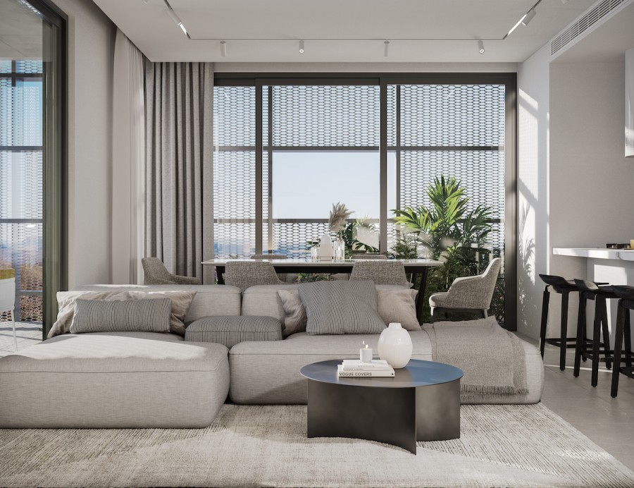 While this protects each apartment from the sun without restricting the view from the inside, it provides an unparallel
