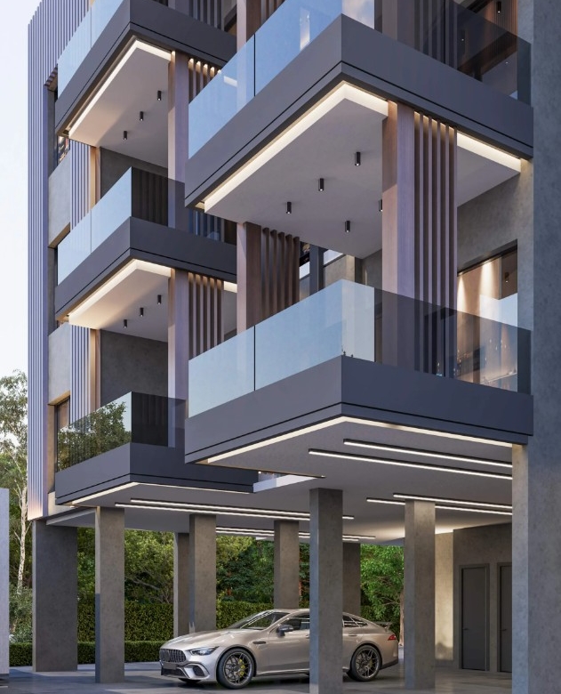 The sleek lines and minimalist aesthetic create a striking visual presence that harmonizes with the surrounding landscape. The use of high-quality materials, including textured panels and glass elements, enhances its modern appeal, offering a timeless yet forward-thinking design.