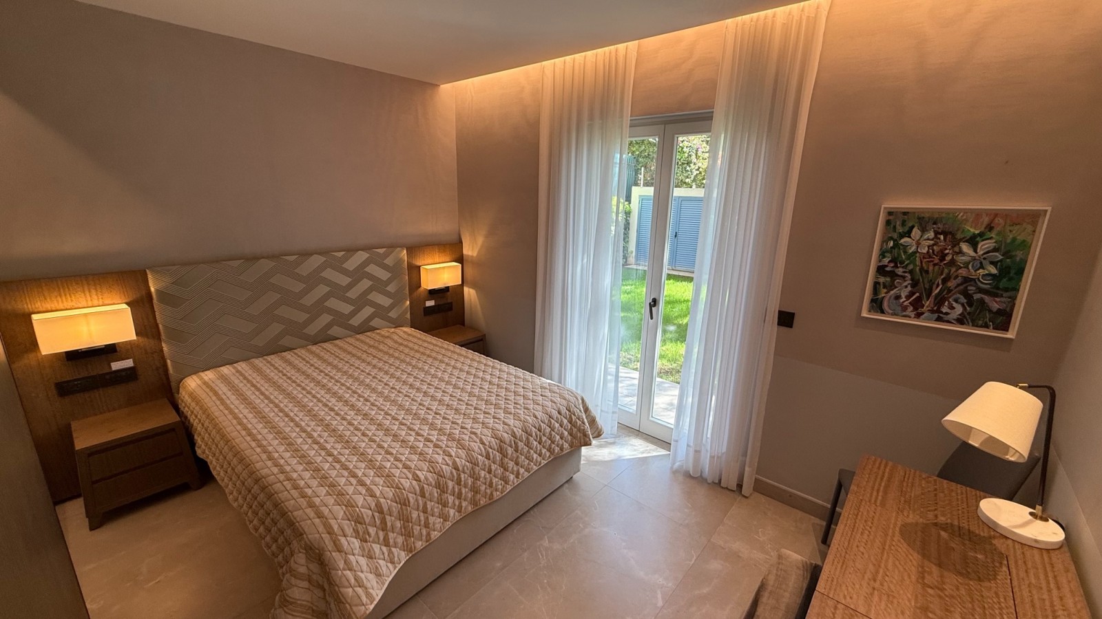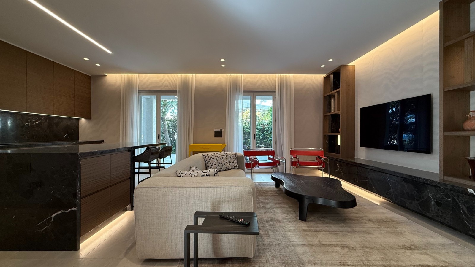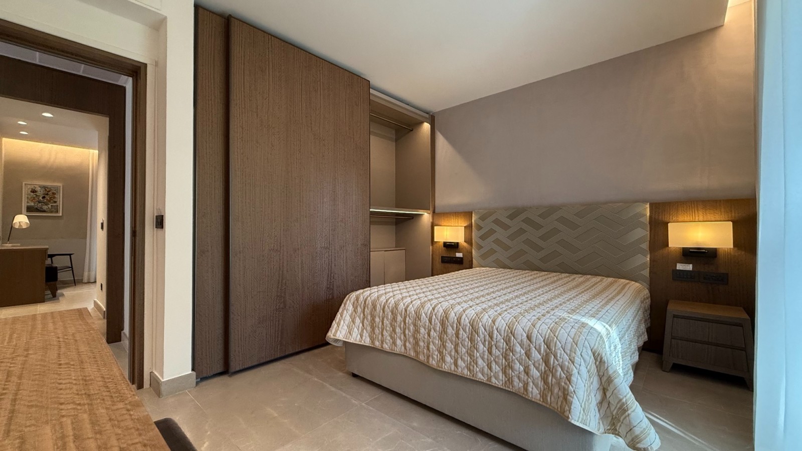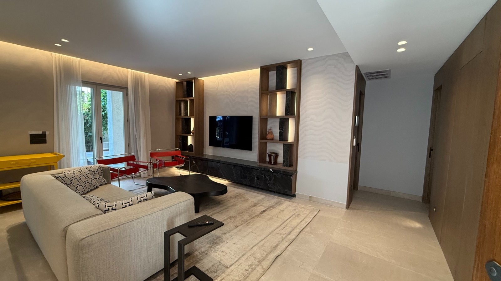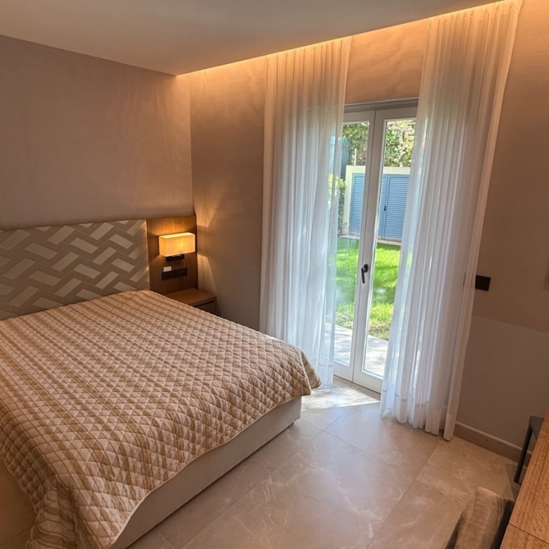 The first line, fully renovated to the highest standard 2-bedroom ground floor apartment, is located in the most impressive gated complex near the beach.The complex has security 24/7, a large swimming pool, a gym area, private access to the beach, and beautiful, well-maintained mature gardens. The apartment is located 100 meters from the Mediterranean Sea. The covered area is 102sq.m, covered veranda is 16sq.m and plot 185sq.m. The property is fully furnished and equipped with electrical appliances. It has 2 bathrooms (showers), 2 spacious bedrooms with built-in wardrobes, a living room and dining areas, a laundry room, an open-plan kitchen, and windows (manual) shutters. Water pressure system, photovoltaic, underfloor heating(water), and VRV air-conditioning system (hot/cold). Also, there is a BBQ outside. Title deeds are available.