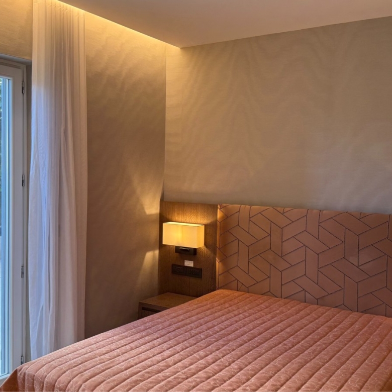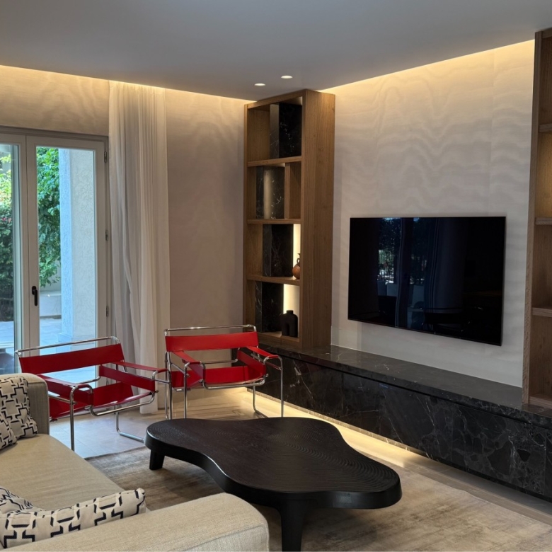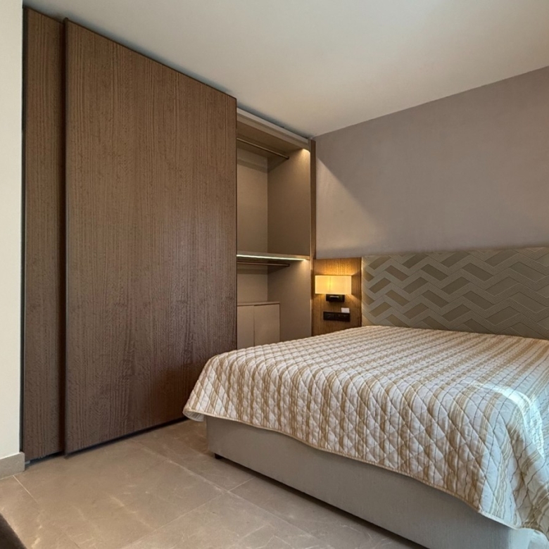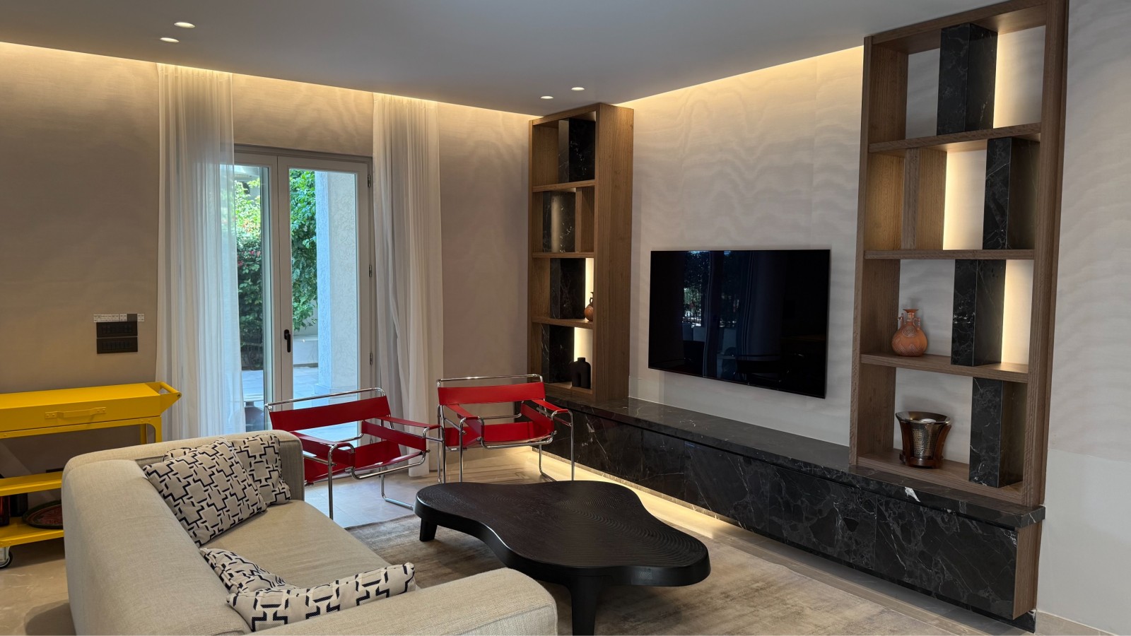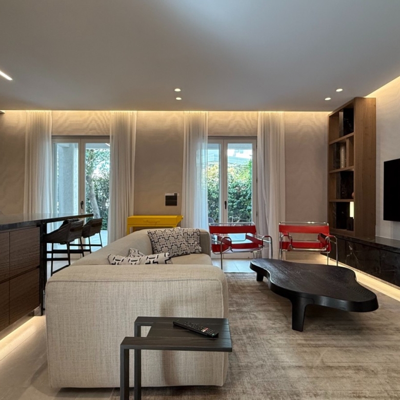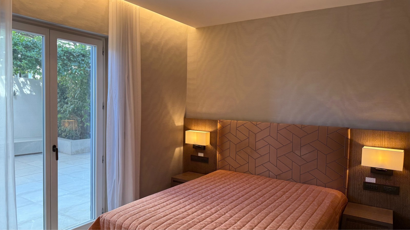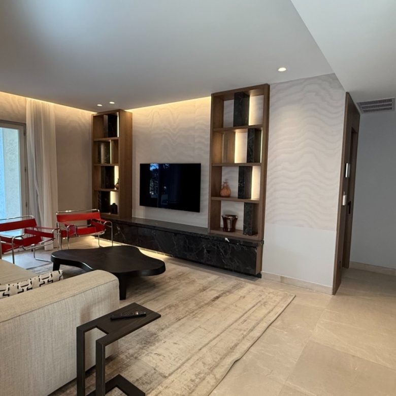 The first line, fully renovated to the highest standard 2-bedroom ground floor apartment, is located in the most impressive gated complex near the beach.The complex has security 24/7, a large swimming pool, a gym area, private access to the beach, and beautiful, well-maintained mature gardens. The apartment is located 100 meters from the Mediterranean Sea. The covered area is 102sq.m, covered veranda is 16sq.m and plot 185sq.m. The property is fully furnished and equipped with electrical appliances. It has 2 bathrooms (showers), 2 spacious bedrooms with built-in wardrobes, a living room and dining areas, a laundry room, an open-plan kitchen, and windows (manual) shutters. Water pressure system, photovoltaic, underfloor heating(water), and VRV air-conditioning system (hot/cold). Also, there is a BBQ outside. Title deeds are available.