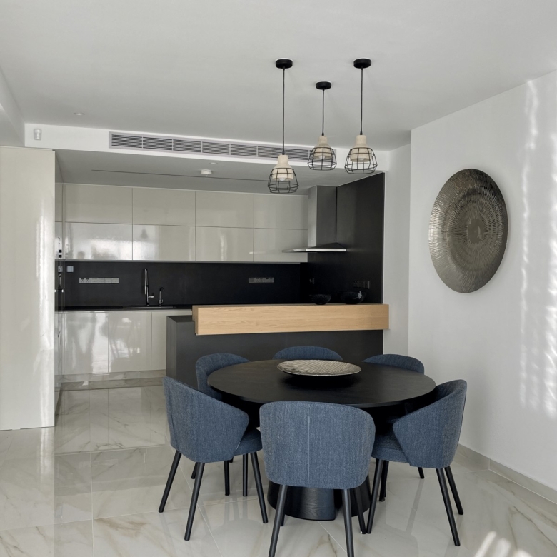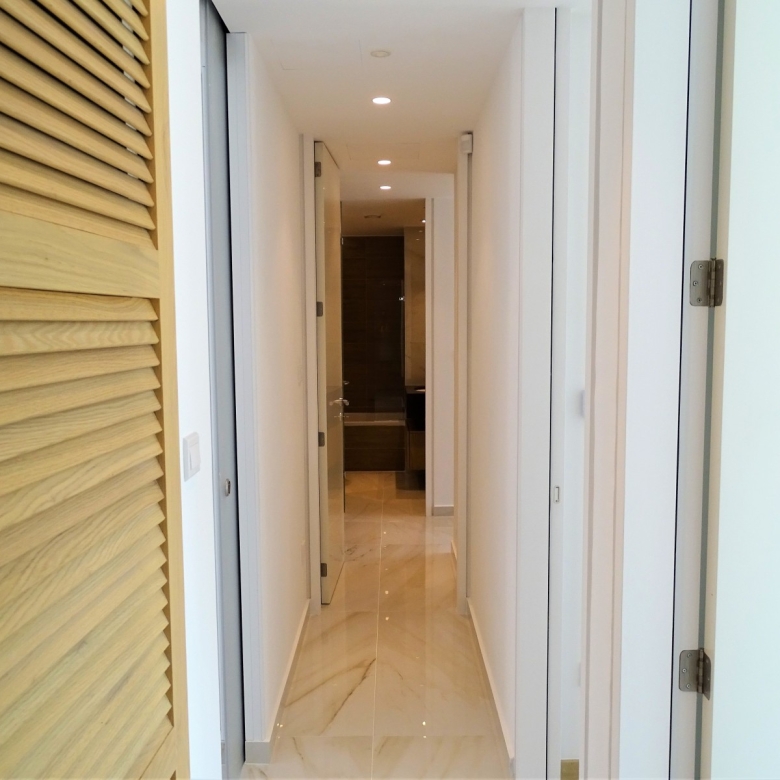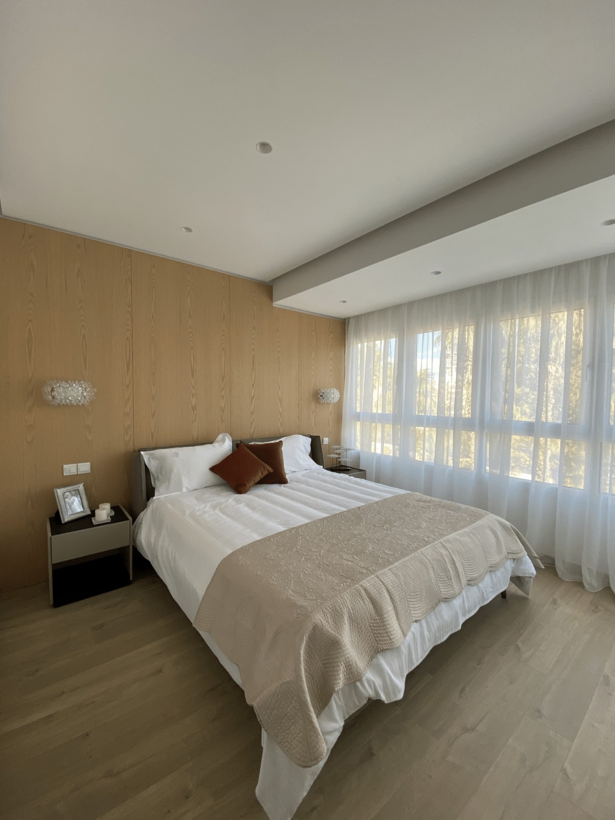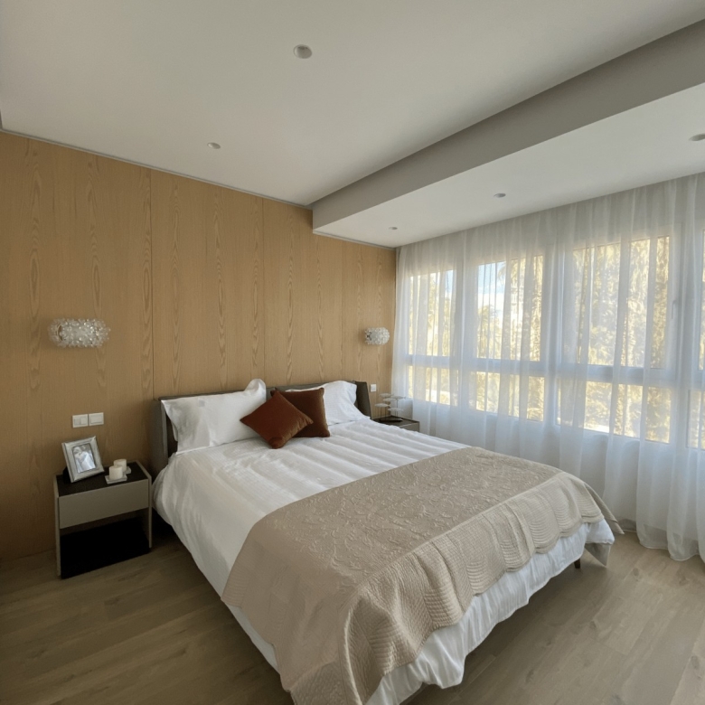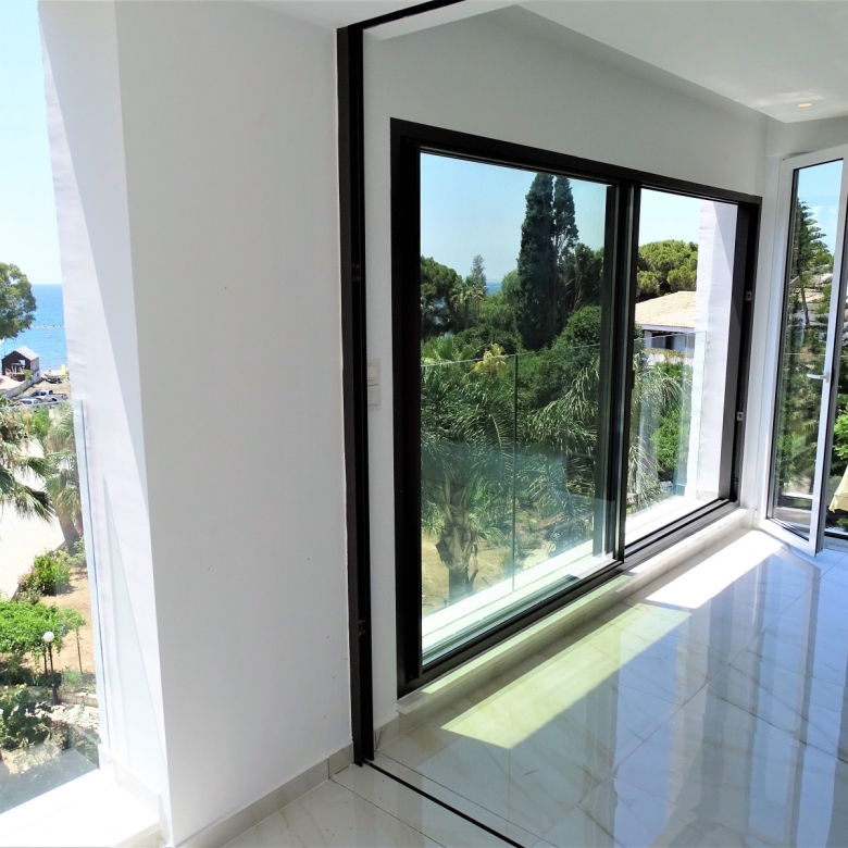 Modern 3 bedroom apartment front line has been completely transformed into a great living space equipped with the latest amenities and features such as solar panels for energy saving, walk-in closet, and built in closets. The open plan shared living space is fitted with a contemporary kitchen, that also encompasses the dining and living areas, it also features a home office space. The living room is fitted with seamless glass windows providing an unobstructed panoramic view. It boasts sweeping views overlooking the sea and beach with a corner view of a seasonal flowing river to the sea and is surrounded by landscaped gardens. The whole building has been renovated within 2021 year.