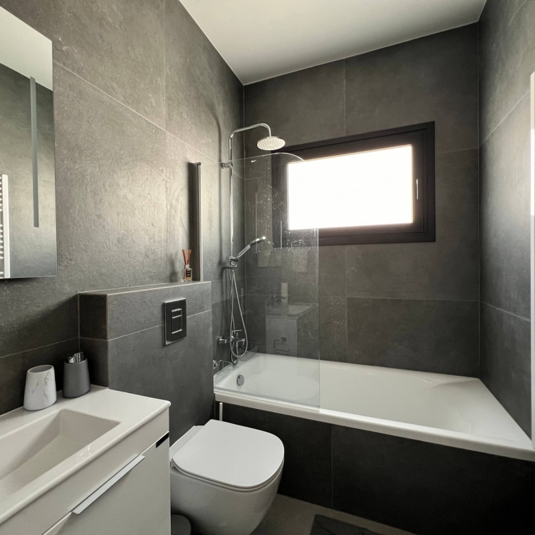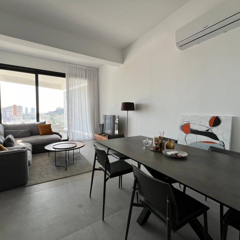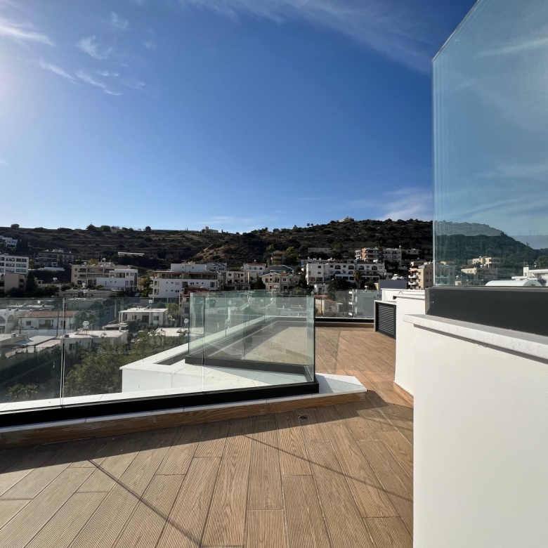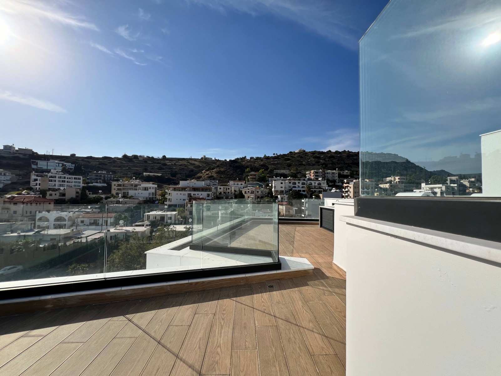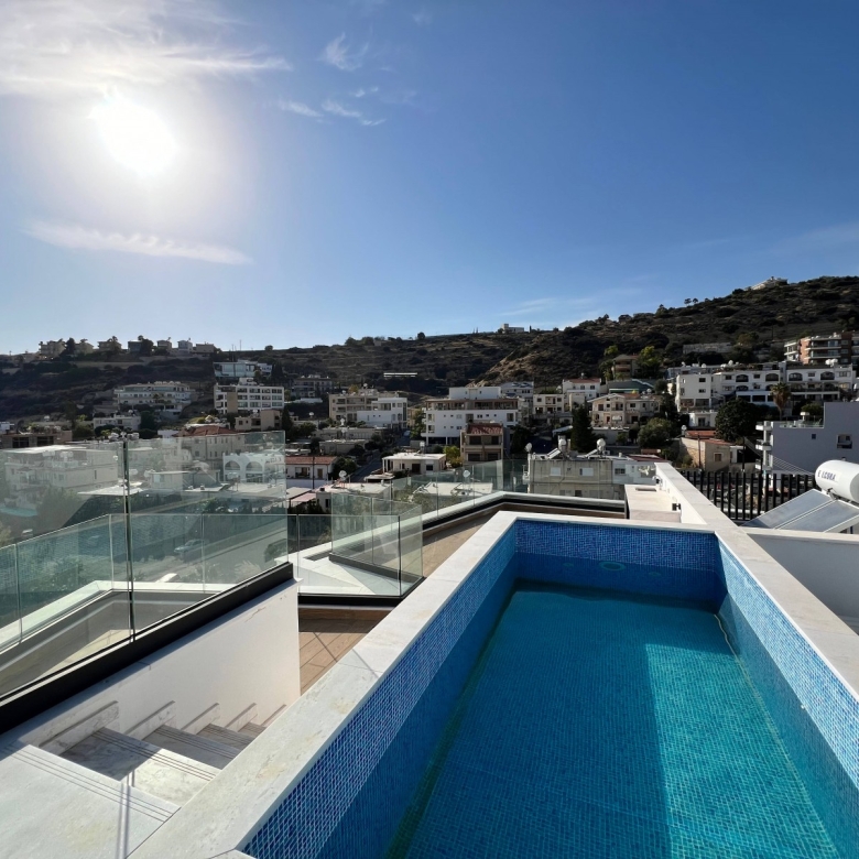 An incredible 3-bedroom penthouse on the fourth floor with a private roof garden and swimming pool offering stunning views. This penthouse, also located in Germasoyia, provides easy access to the highway, proximity to amenities, and a 5-minute drive to the beach. The contemporary design includes an open-plan kitchen and living room, a master bedroom with an en-suite bathroom, a main bathroom, and spacious covered verandas. The private roof garden with a swimming pool provides a perfect space to relax and enjoy the view. The penthouse comes fully furnished with high-end furniture, Bosch electrical appliances, a Samsung smart TV, and Samsung air conditioning units. It includes private covered parking and a storage room. The building features a large common swimming pool and a playground. This unit has a roof garden of 67 square meters.