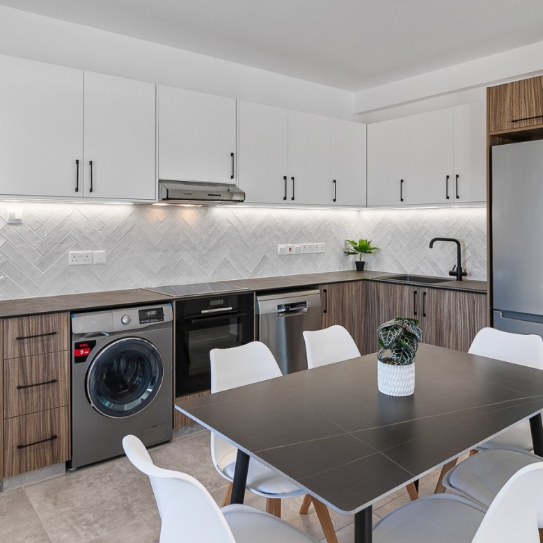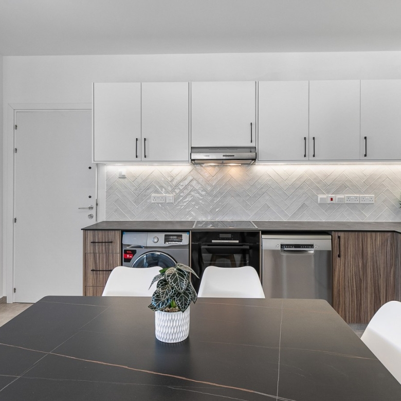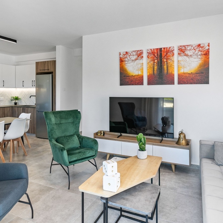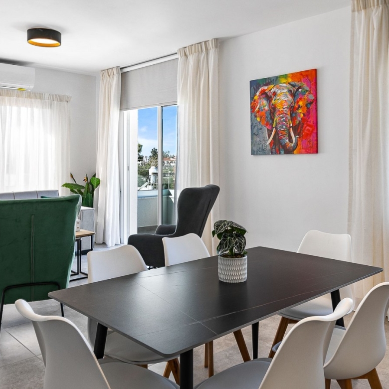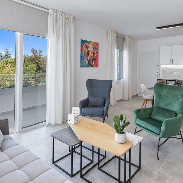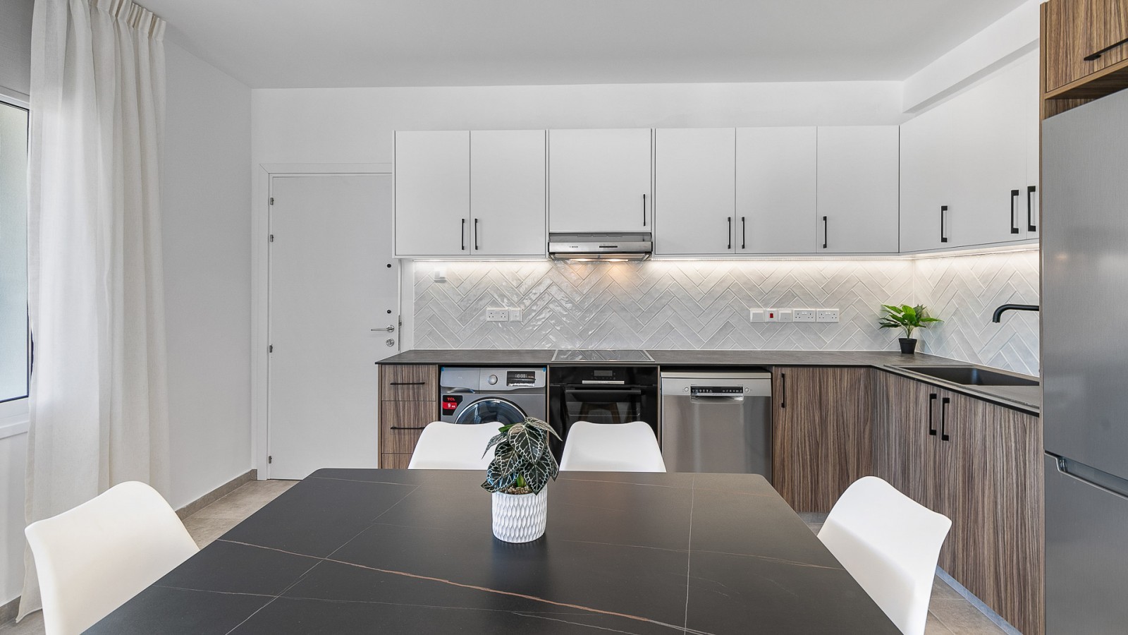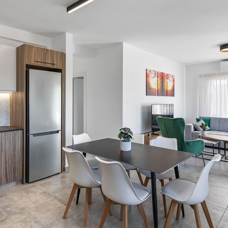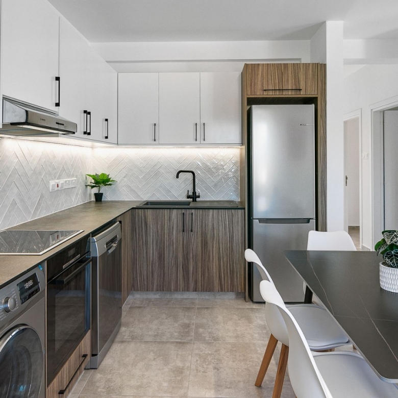 Fully modernized and renovated 3 bedroom apartment in Geroskipou. A modern façade leads to you a well-maintained hallway, flooded with natural light. You enter the apartment into a large open plan living area with double aspect patio door and window flooding the area with natural light. There is a large terrace spanning the length of the living area with nice views to the street. The three double sized bedrooms are located off from a hallway. They are all superbly renovated. The Master Bedroom with en-suite benefits from a large private terrace. This apartment is a real find in this area and priced to sell. An allocated parking space completes this superb offer.