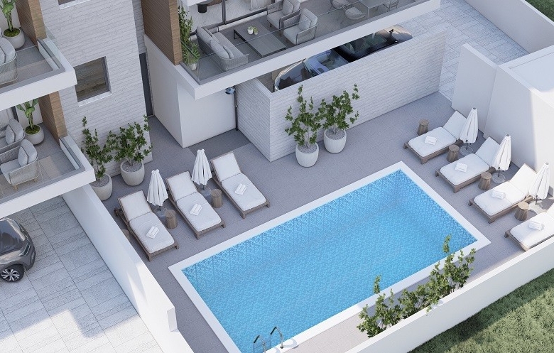 KRONOS Residences– a new project, consisting of 8 apartments and located in the popular tourist area of Universal in Paphos. It is strategically located in very close proximity to the beach and to educational and entertainment facilities, offering convenience and accessibility, as well as the potential for great return on investment as a rental property. Beaches, the harbour, hotels, King’s Avenue Shopping Mall, supermarkets, schools and universities, gym, pharmacies, medical clinics, shops are with in walking distance. For the residents of the project swimming pool with lounge area is available. Each apartment provides a spacious layout with premium quality finishes, large balcony spaces, and high-end features. Open-plan layouts are adaptable during the construction stage. Furniture & appliances packages and heating options are available upon request for extra price.
