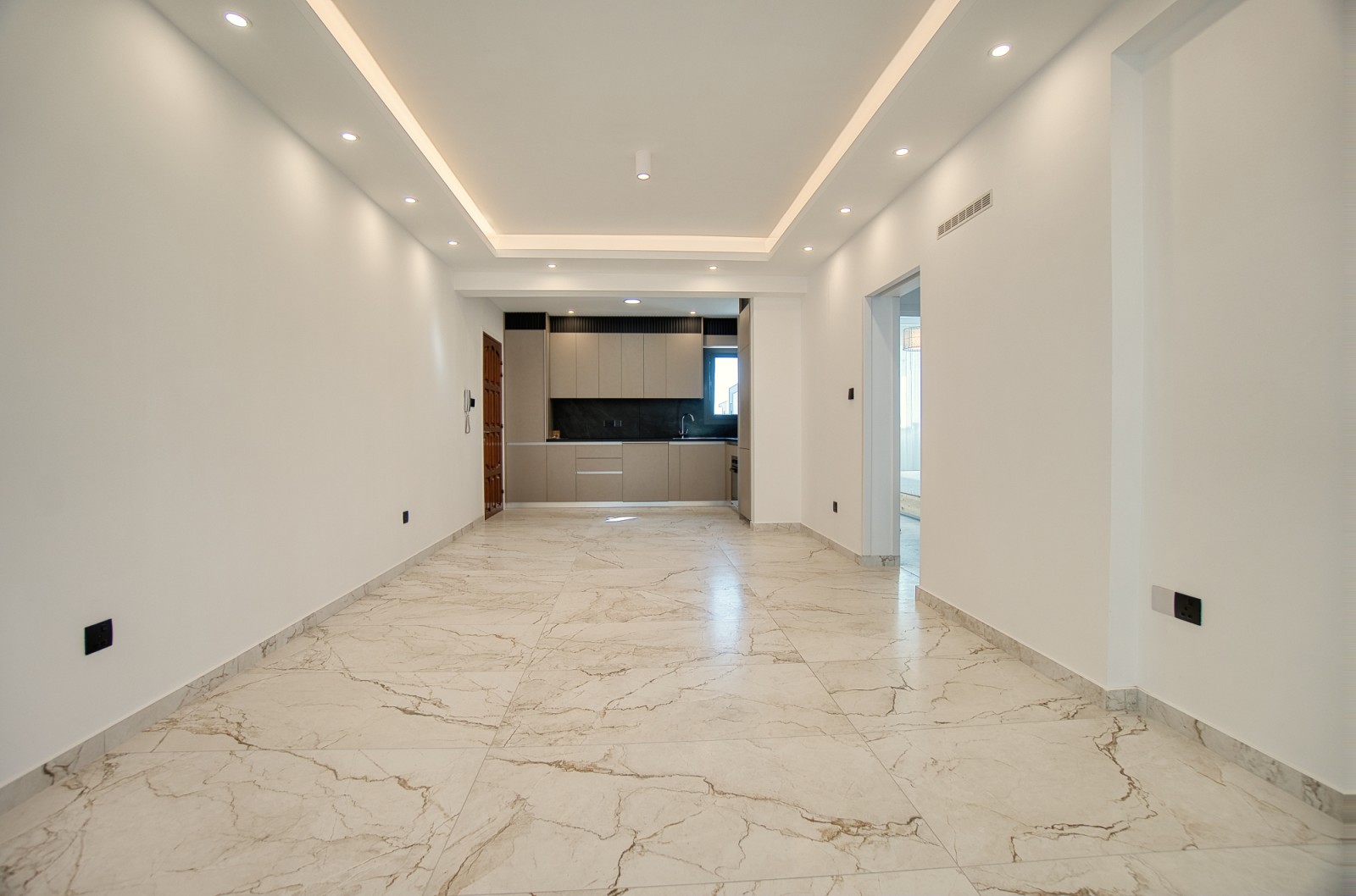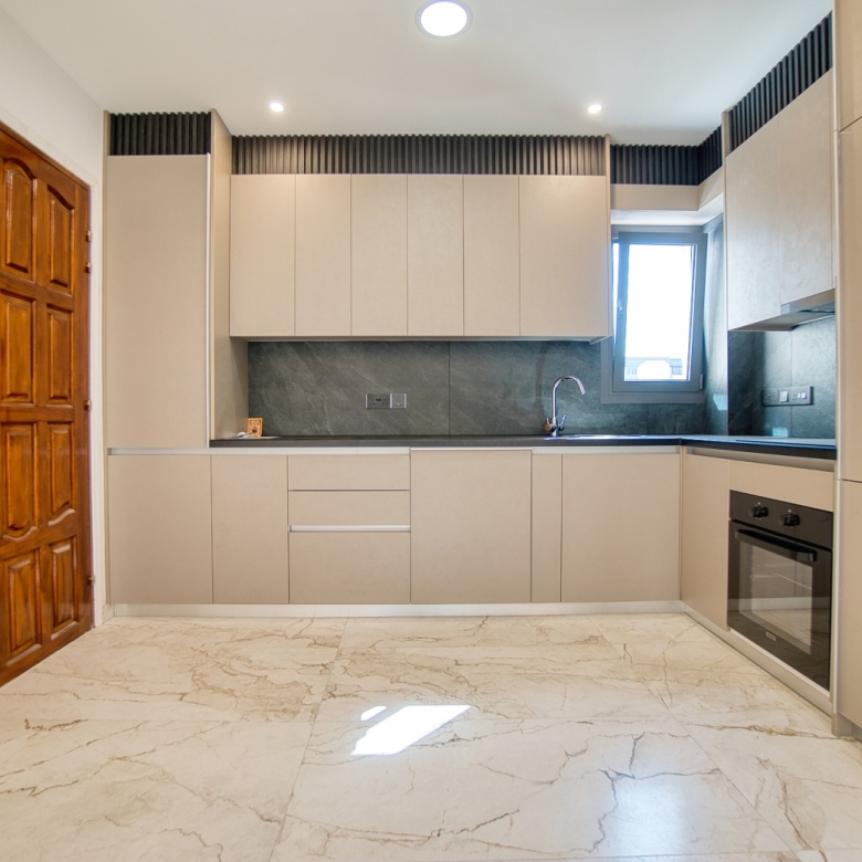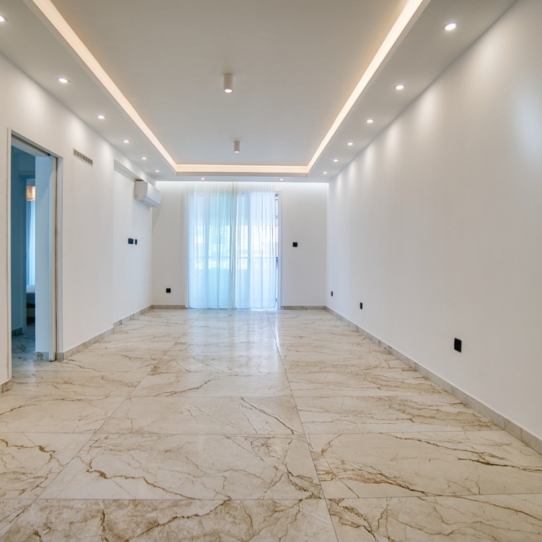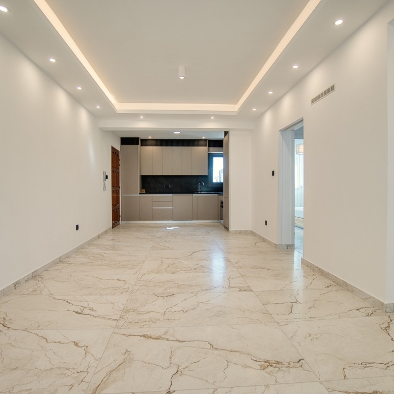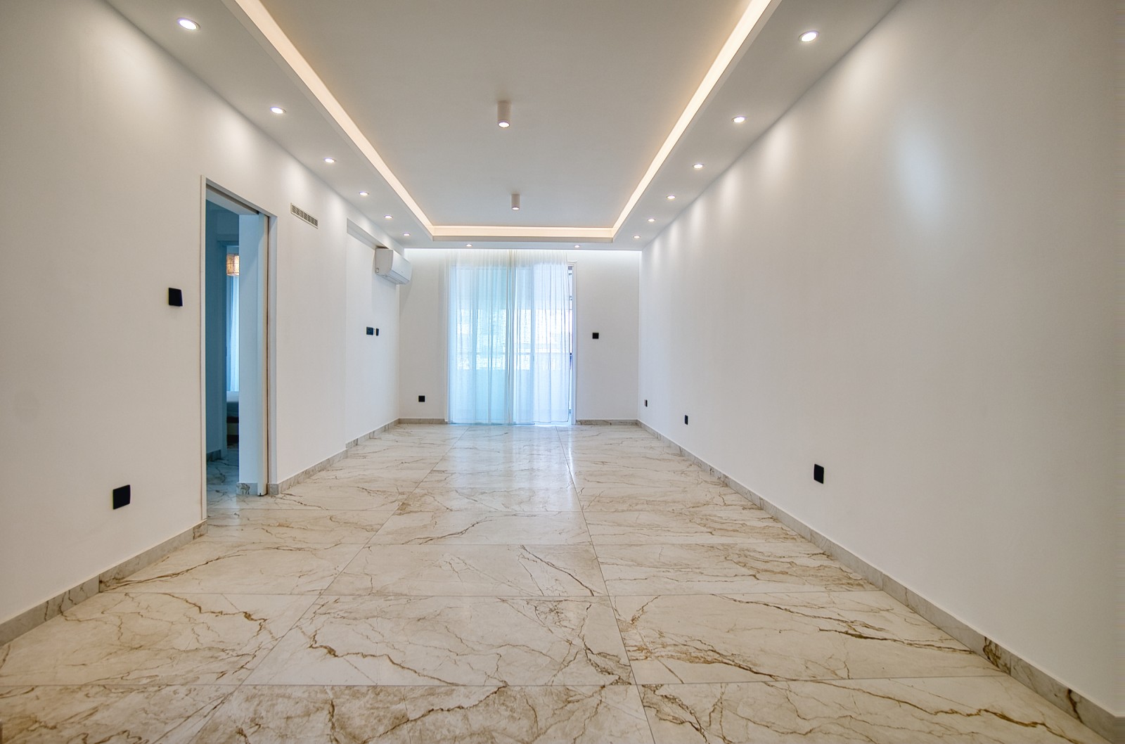 Beautiful two bedroom apartment with excellent and quality renovation in a quiet residential area of Universal Area, close to Kings Avenue Mall and New American University of Beirut. The property is part of a well maintained and established complex on the ground floor with elevator. As you enter the apartment on the left is the kitchen and open plan living/dining area and veranda. Sliding patio doors from the living room lead out to a covered balcony with outdoor seating area. The living room leads to two double bedrooms and a family bathroom. Both bedrooms have built in wardrobes. Fully renovated with high quality finishes such as marble, stone, porcelain stoneware etc. Fully fitted kitchen with appliances. Partially furnished. The roof has been recently insulated. 75 covered area 10 covered verandas.