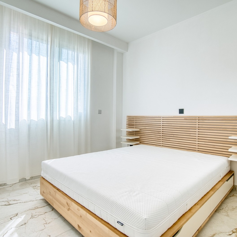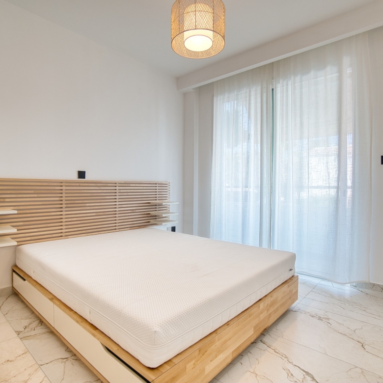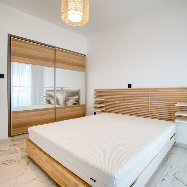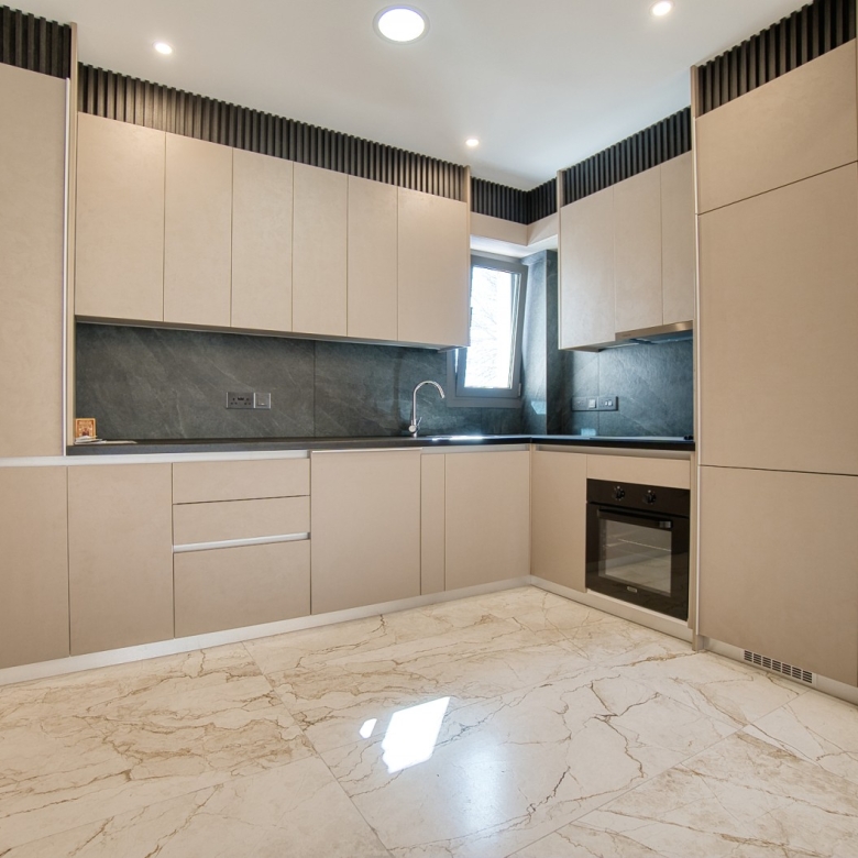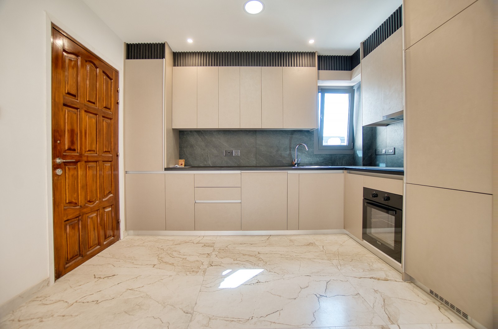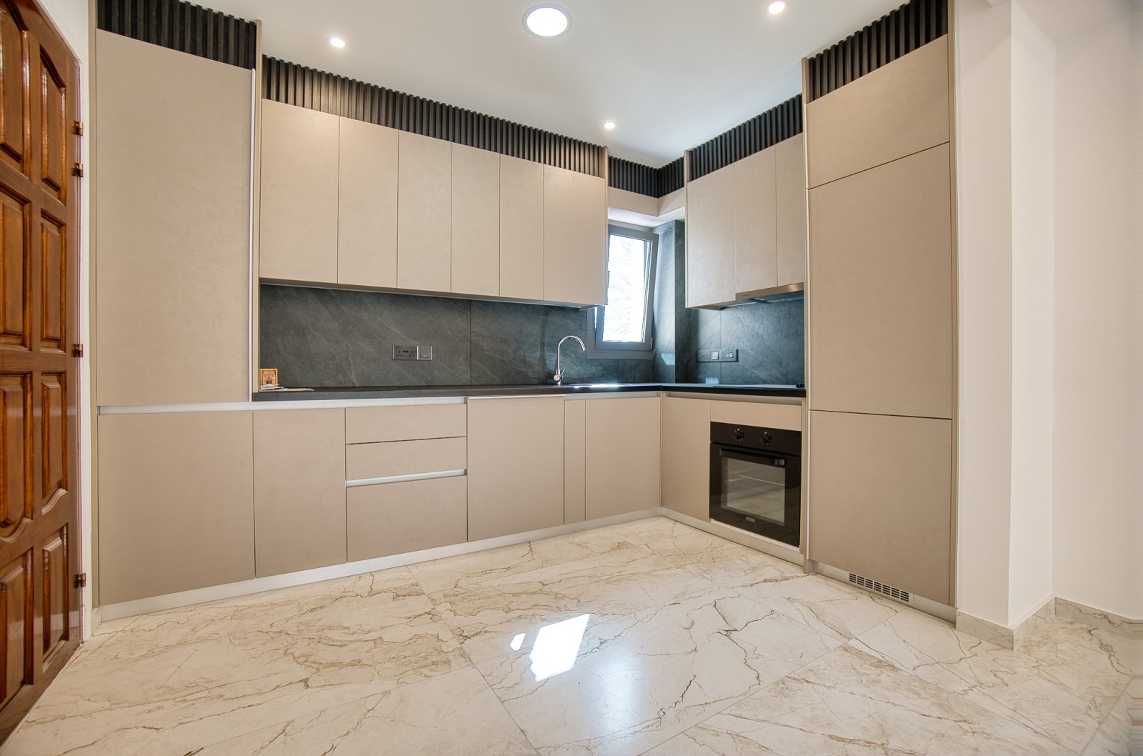 Beautiful two bedroom apartment with excellent and quality renovation in a quiet residential area of Universal Area, close to Kings Avenue Mall and New American University of Beirut. The property is part of a well maintained and established complex on the ground floor with elevator. As you enter the apartment on the left is the kitchen and open plan living/dining area and veranda. Sliding patio doors from the living room lead out to a covered balcony with outdoor seating area. The living room leads to two double bedrooms and a family bathroom. Both bedrooms have built in wardrobes. Fully renovated with high quality finishes such as marble, stone, porcelain stoneware etc. Fully fitted kitchen with appliances. Partially furnished. The roof has been recently insulated. 75 covered area 10 covered verandas.