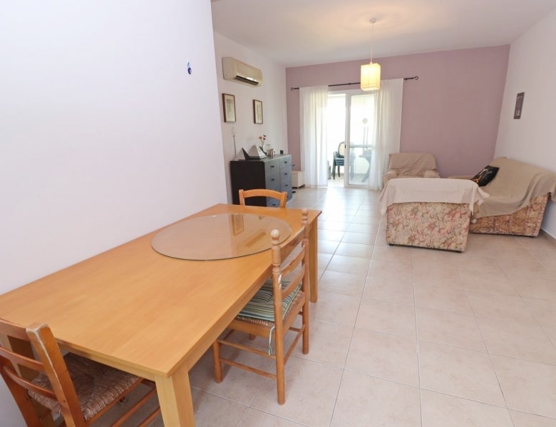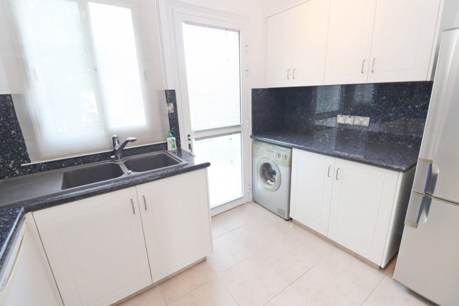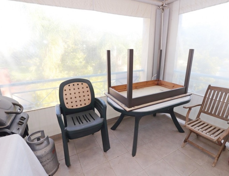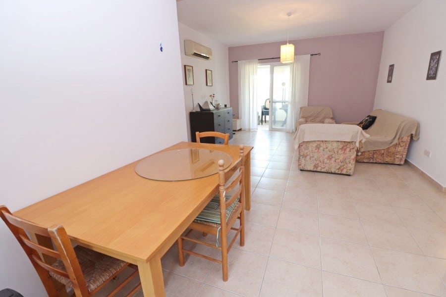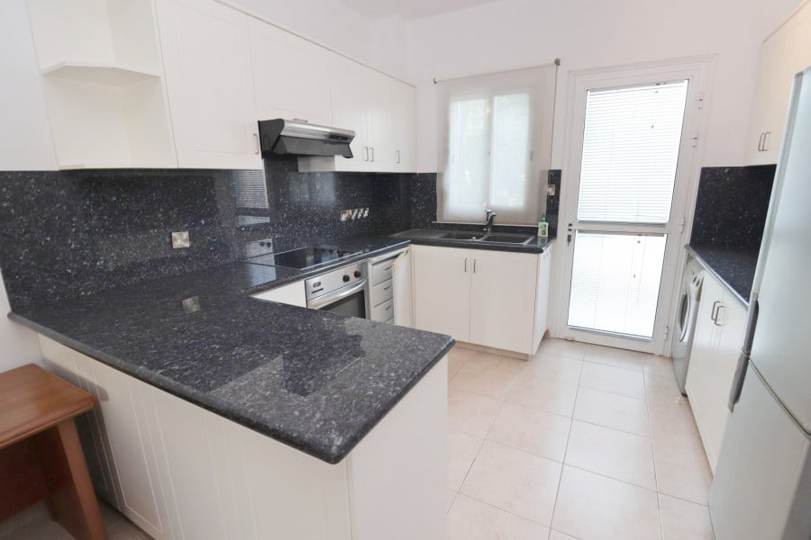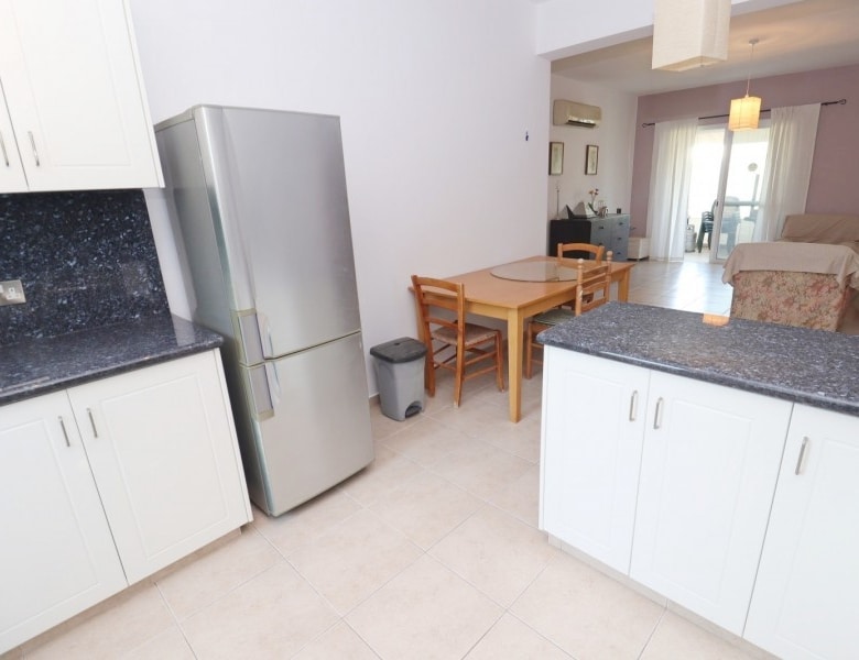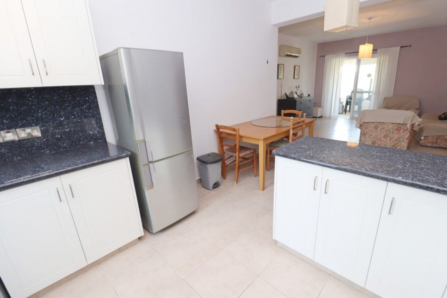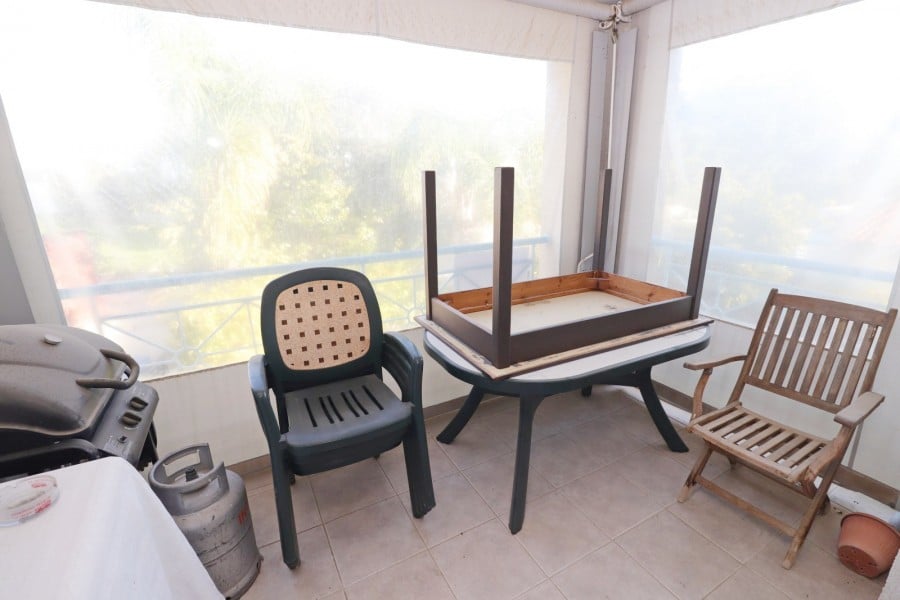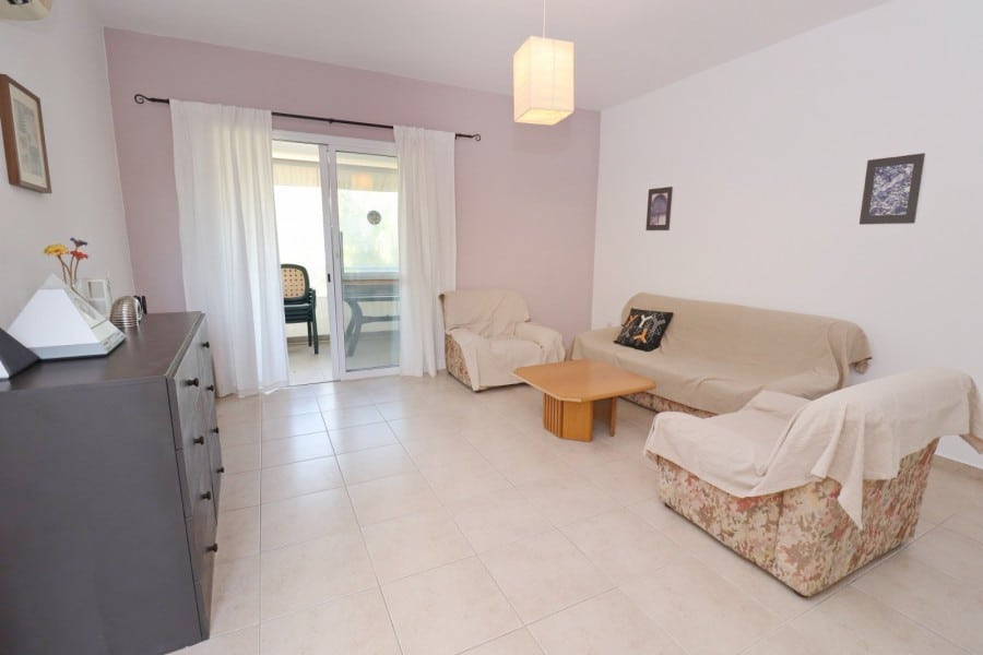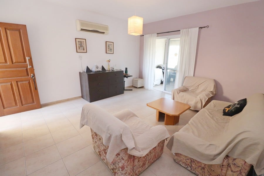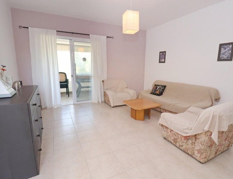 The living room area is spacious and sliding windows lead you to the covered balcony with a relaxation / sitting area. The kitchen is fully equipped with granite worktops and a door taking you to another balcony. A short corridor takes you to the two double bedrooms and the family bathroom.