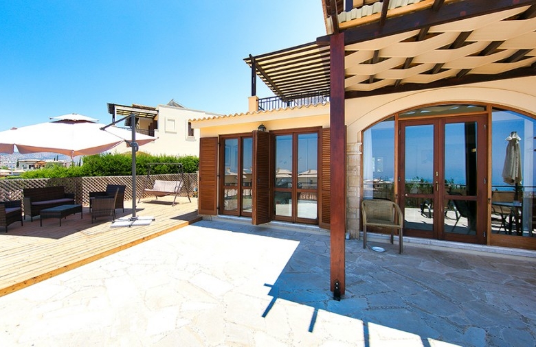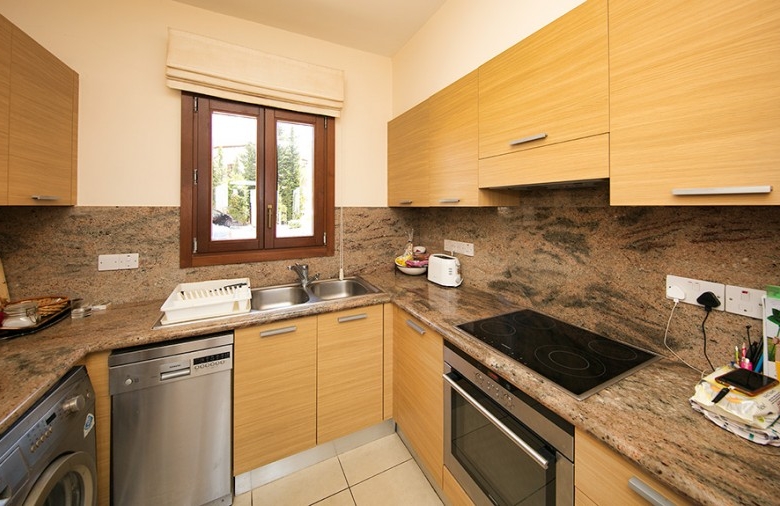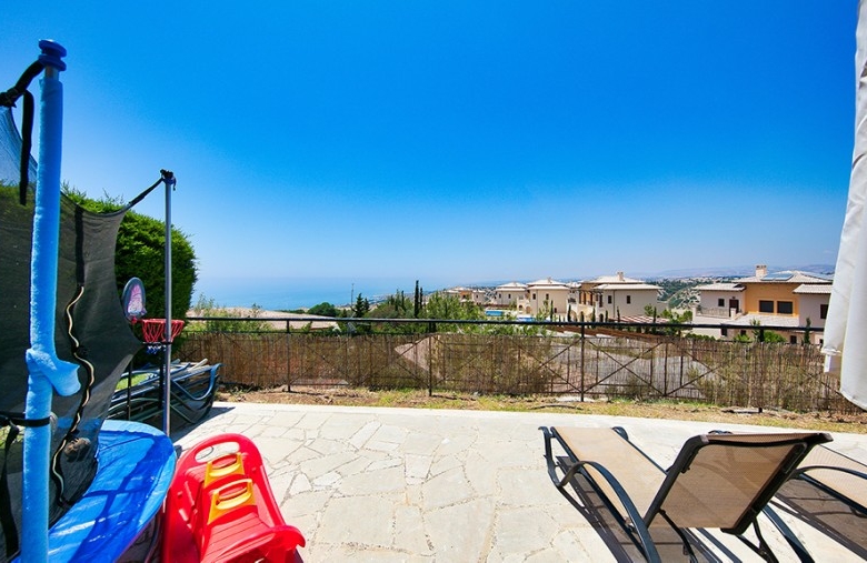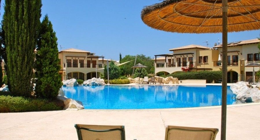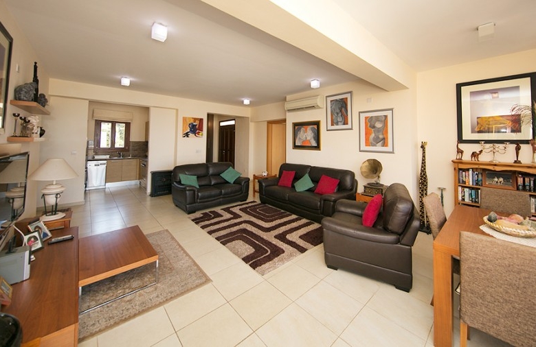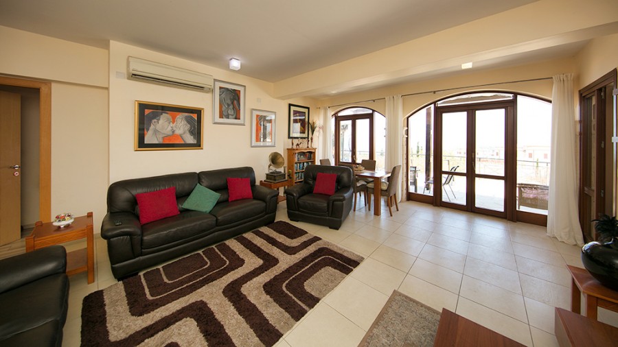 Perfectly placed for wonderful sunset views, this 3 bedroom apartment on the edge of Theseus Village is a spacious family property. With full air conditioning, allocated parking and the choice of two lovely communal swimming pool areas, this is a very desirable property for both permanent living and investment. The apartment is on a corner location and has an unusually generous plot. The grounds consist of an area of paving, some decking and space for planting if desired. The property has recently been extended to include a third bedroom and additional space in the master bedroom and living area. Entry to the property is via the short footpath from the parking area. The front door opens into an entrance area with ample storage. The enlarged living room has patio doors leading out to the terrace and facing the glorious sunset views beyond. The modern, fully fitted kitchen has granite work tops and splash backs. The electrical goods include a hob, oven, extractor hood, stainless steel fridge freezer, washing machine and dish washer. The apartment has three good sized bedrooms, two of which open onto the rear sunset terrace. There are two modern bathrooms, each comprising wash hand basins with units under, a WC and shower. Outside at the rear there is scope for personalizing the garden where currently the main focus is the fabulous sea and sunset view. To the front, the smaller of the Theseus Village pool areas is about fifty yards away. There is space to sit around the pool and enjoy the mature communal gardens and take in the fabulous Cyprus sunshine.