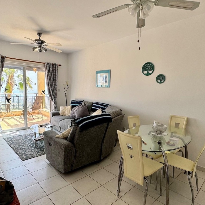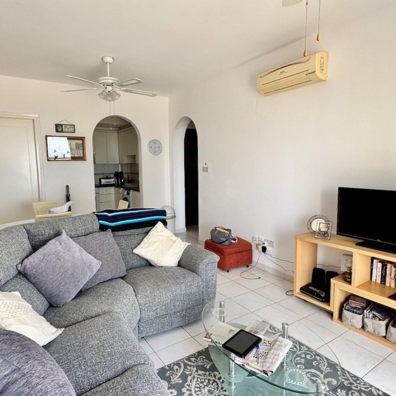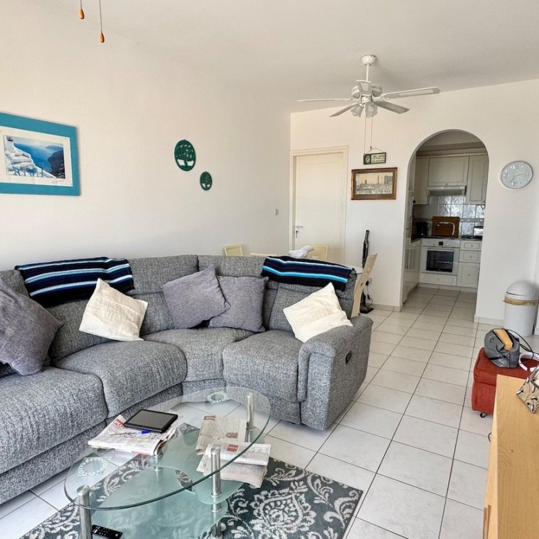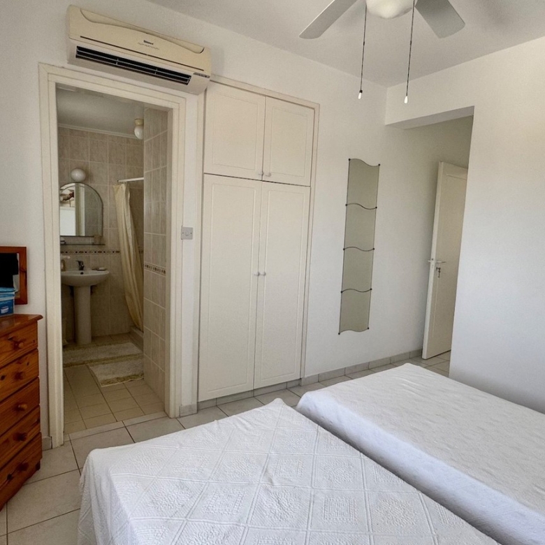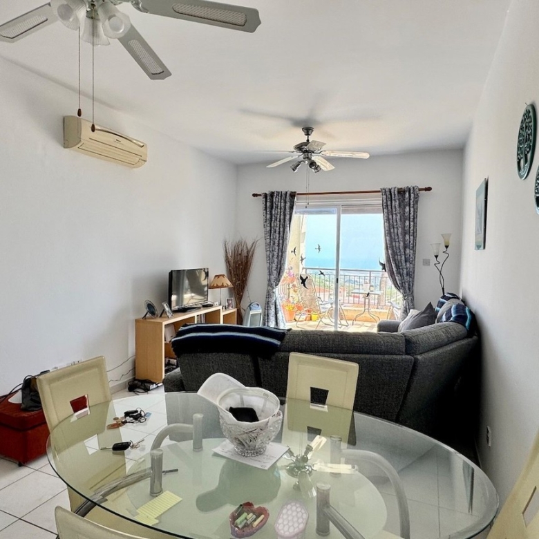 This charming two bedroom penthouse in a well-maintained and highly sought-after complex in Tsada. Upon entering, you’re welcomed into a bright open-plan living and dining area with patio doors that open onto a generously sized balcony. From here, you can enjoy beautiful views of the communal pool and breathtaking panoramic sea views—perfect for relaxing or entertaining. At the opposite end of the living area, the fully fitted kitchen comes complete with white goods and ample storage space. To the left of the kitchen is a comfortable twin bedroom featuring floor-to-ceiling fitted wardrobes and an en-suite shower room. On the opposite side of the kitchen, you’ll find the family bathroom and the spacious master bedroom, also with fitted wardrobes.