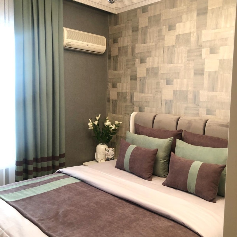 Bothbedroomsare inviting in their own way. One features soft gray wall accents with bedding in shades of purple and turquoise, creating a calm and stylish retreat. The other uses bright touches like orange-and-white striped linens for a more energetic, cheerful feel. Built-in mirrored wardrobes not only provide generous storage but also make the rooms feel larger and brighter.