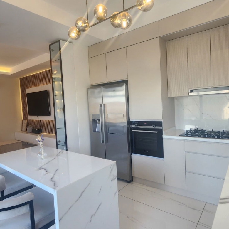 The kitchen cabinets are designed in aminimalist and modern style, with light-colored glossy finishes that complement the room’s airy feel. Once installed, the kitchen will reflect both function and contemporary elegance.