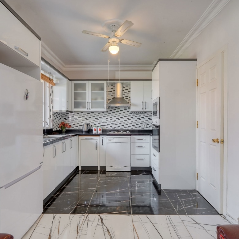 The kitchen design combines navy blue lacquered lower cabinets with crisp white upper units. This contrast gives the room a modern aesthetic. The black granite countertop and marble-look backsplash tie the design together, adding sophistication. With extensive cabinet space, the kitchen is both stylish and highly functional.