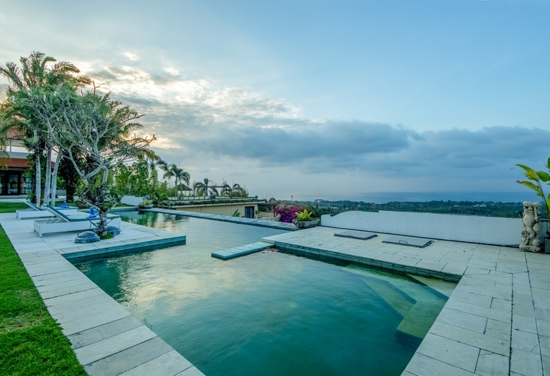 Unique and elegantly multi-level 422 sqm villa within separate 5 large fully air-conditioned ensuite bedrooms, yet designed in the finest traditional ornamental style, complete with separate full-service modern kitchen, spacious lush tropical gardens, terraces, ornamental ponds, and Stunning 11-metre infinity-edge lap pool that juts out dramatically over the most coveted ocean views in Bali – Jimbaran Bay, Bali’s magnificent mountain range and enjoy Bali’s magical sunset.