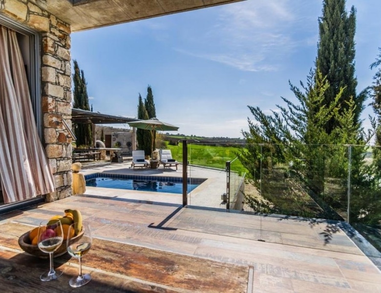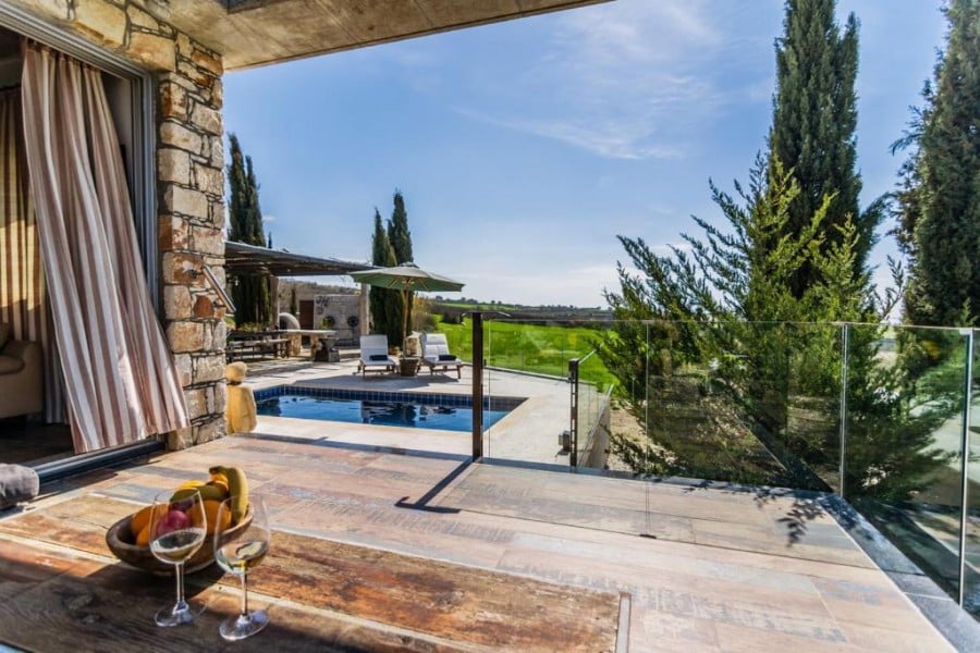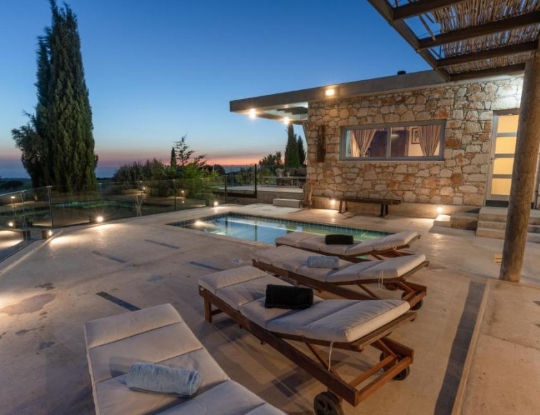 Step into through the main door, entering a hallway that guides you to the open-plan lounge, kitchen, and dining area. This space not only offers modern comfort but also provides picturesque views, creating a seamless connection to the front covered patio. The bedrooms, generously sized and situated in a separate wing, share two large bathrooms, combining practicality with elegance. The beautifully landscaped garden surrounds the property, offering a serene escape. From flooring to finishing, the attention to detail in this property is of the highest order. The craftsmanship reflects a commitment to quality, ensuring that every corner of the home exudes a sense of luxury and refinement. This bungalow is more than just a home it’s a statement of timeless elegance. Immerse yourself in the tranquil charm of Kathikas Village while enjoying the modern comforts this property has to offer.