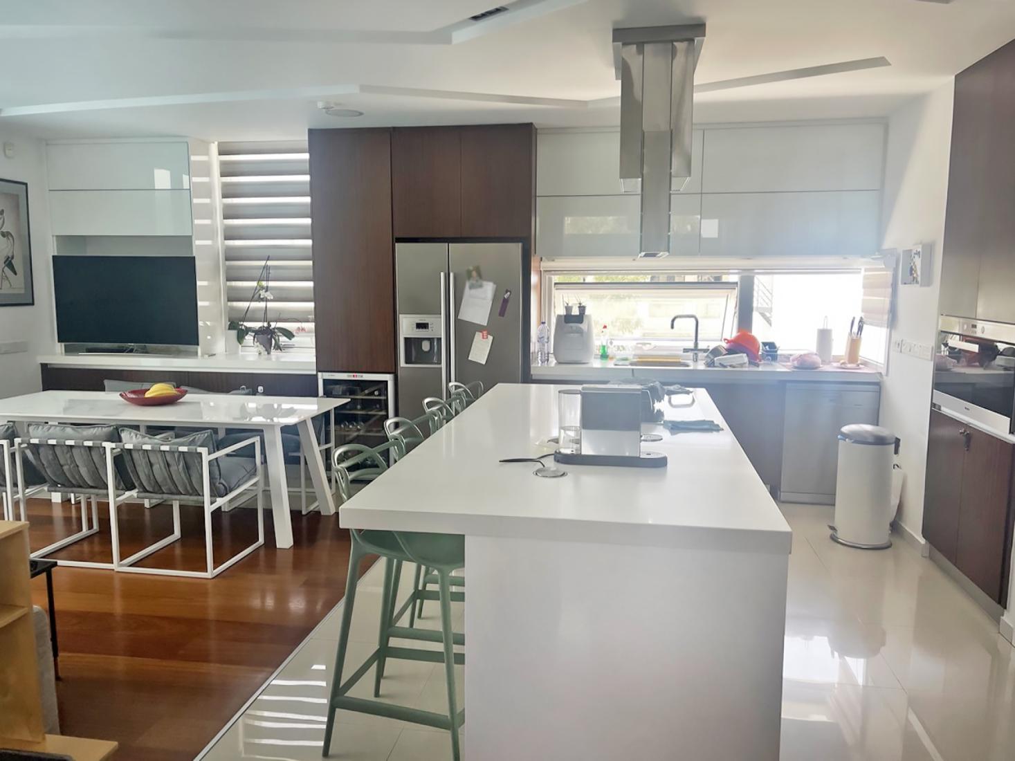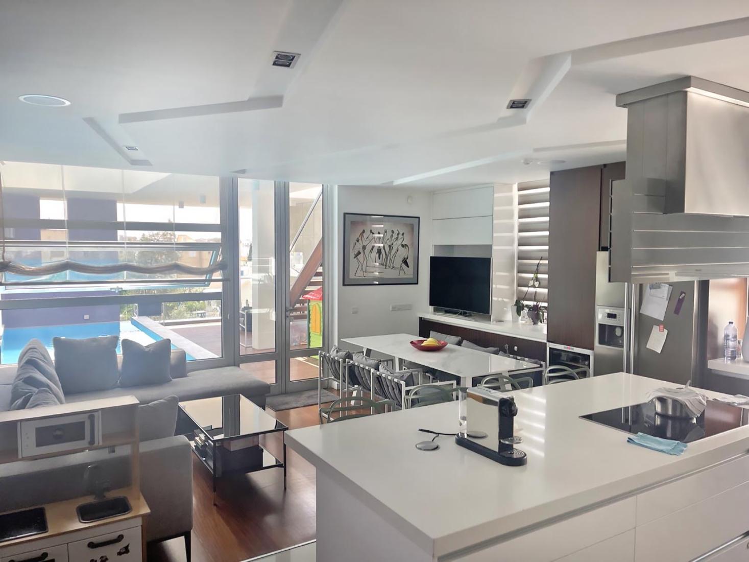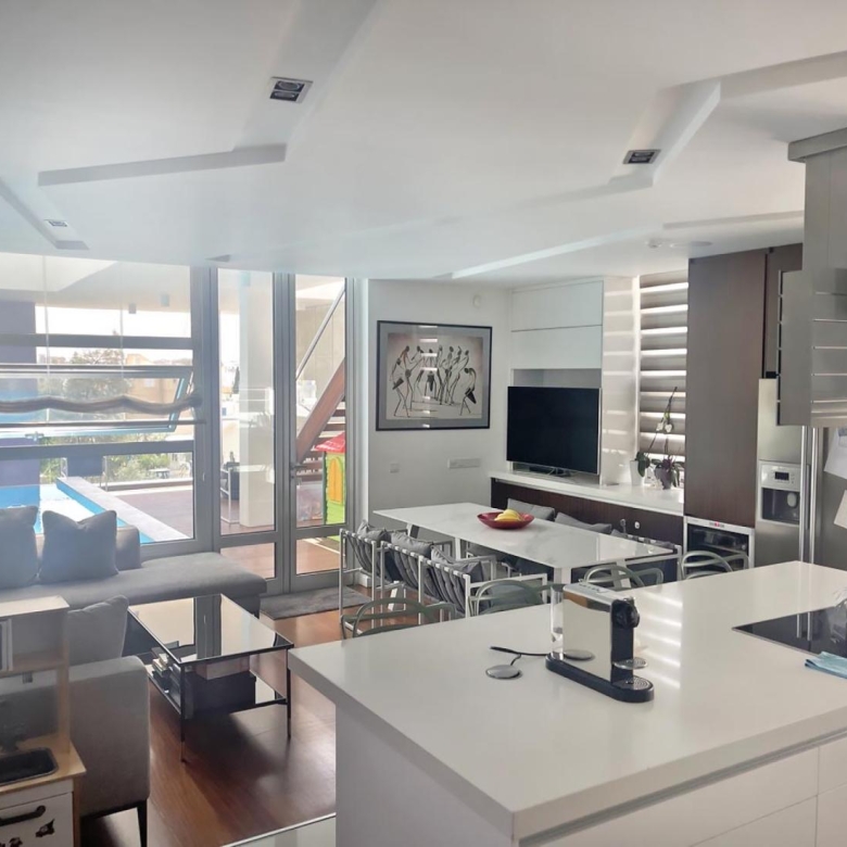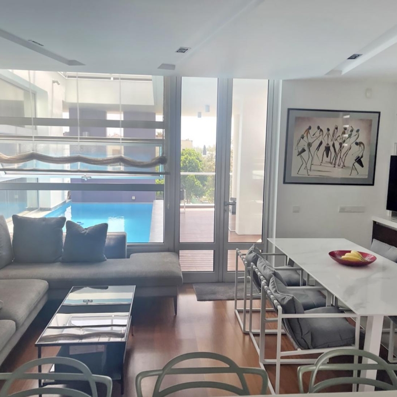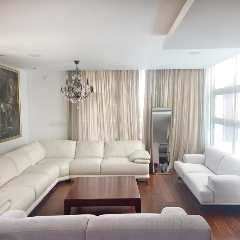 One of a kind, luxurious whole floor penthouse with roof garden . Easy access to GC school, European University and English school, American and Russian embassies. Very large modern kitchen with separate laundry room, family room, large dining room and double main lounge with two – sided wood-fireplace and wooden floors. 3 large bedrooms all en-suite plus guest toilet plus maid’s quarters (with bathroom and kitchenette). All bedrooms windows with electric shutters, fully a/c and underfloor c/h, alarm, WiFi and sound system throughout, infinity swimming pool covered with sliding glass roof with solid wood decking on main floor plus roof garden with BBQ area. All electrical appliances and curtains included.