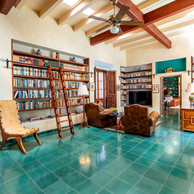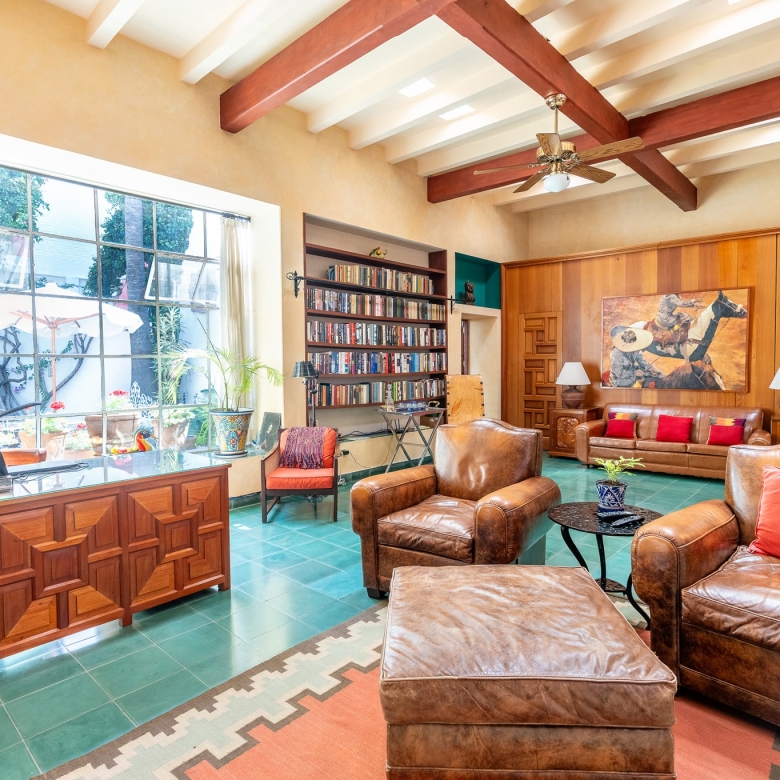 Built on an oversized 613 m² lot, Casa Carolina features two expansive courtyards—one designed as a lush garden retreat, the other ideal for entertaining with an outdoor fireplace and a central fountain. The interiors have been meticulously maintained to preserve historic elements, including boveda ceilings, hand-fired Talavera tile from Dolores Hidalgo, and carved hardwood cabinetry with Moroccan-weave detailing. Multiple cantera stone fireplaces, terra cotta tile floors, and cantera flooring on the terraces further enhance the home’s architectural authenticity.