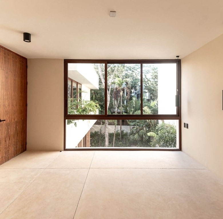 The open-concept living area seamlessly blends modern elegance with natural charm. A spacious kitchen island, premium travertine countertops, and effortless access to the private garden and pool make entertaining a delight. A lush oasis awaits outside, complete with a sparkling pool for cooling off under Tulum’s warm sun.