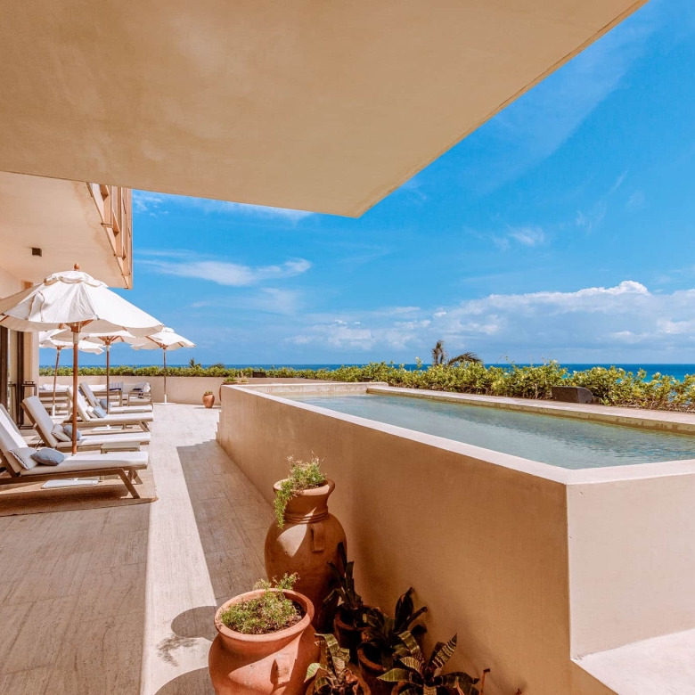 The expansive outdoor terraces take full advantage of the Riviera Maya’s tropical climate. They feature a pool and a generously sized living and dining area, all perfect for al fresco gatherings or simply unwinding to the sound of the waves. The direct elevator access enhances privacy and convenience, while high-end finishes throughout the home add an extra layer of sophistication to this remarkable property.