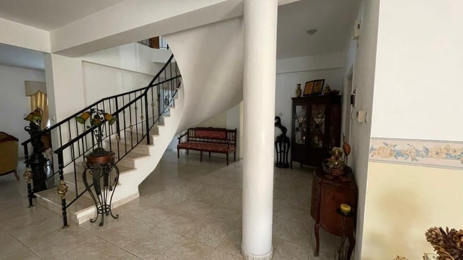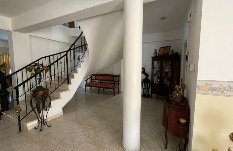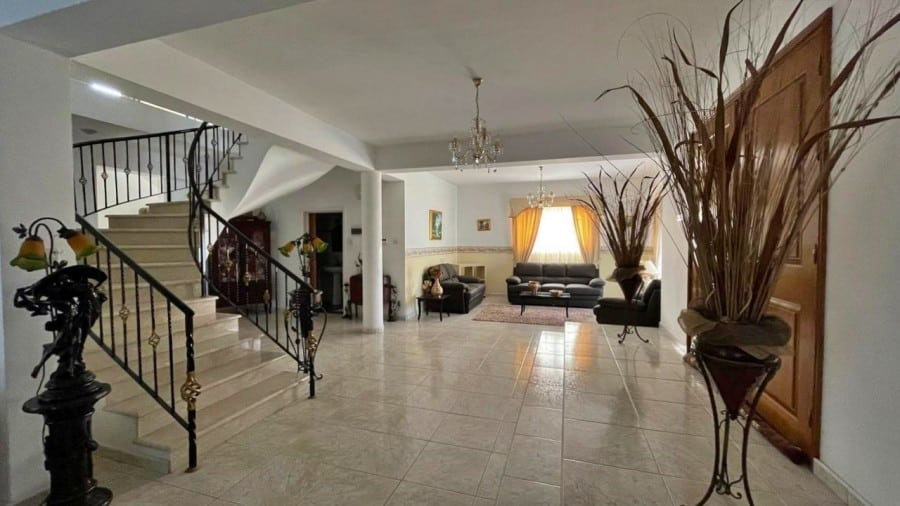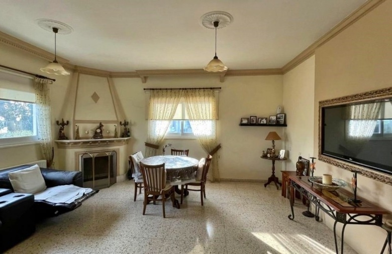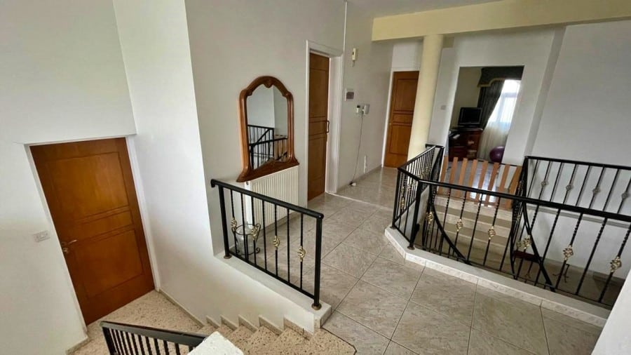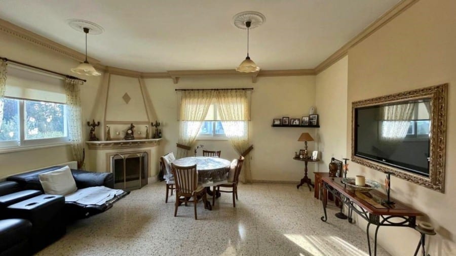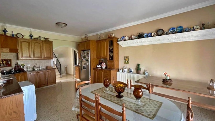 a unique 3-bedroom villa nestled in the tranquil village of Anafotida, offering stunning views of both mountains and the sea. Situated near Agglisides village, the property provides easy access to essential amenities such as schools, banks, and supermarkets, and is conveniently located near major cities like Larnaca, Limassol, and Nicosia. The beach is just a 10-minute drive away. The villa is set in a peaceful, residential neighborhood, ensuring a safe and quiet environment.The home features three spacious bedrooms, a living room, and a separate kitchen, with an additional small kitchen for added convenience. A guest toilet, a staff room, a gym, and a second living room on the upper floor with a fireplace and yet another kitchen complete the layout. The property also includes a bathroom, ample covered parking, and expansive covered verandas connected to all rooms.The large yard is a green oasis with a beautifully landscaped garden filled with trees and palm plants, creating a serene outdoor space. Additionally, the backyard has a plot where further construction is permitted, offering potential for expansion.