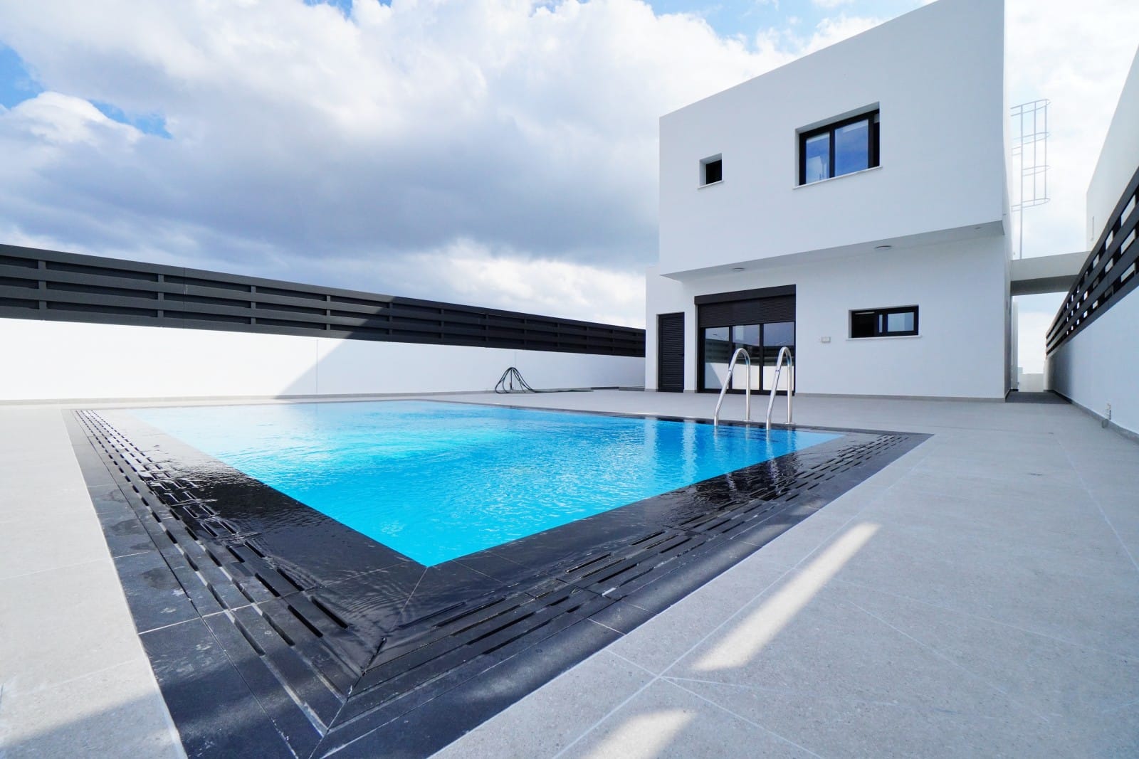 A brand-new 3-bedroom villa designed for luxury and comfort, featuring a large overflow pool and thoughtfully planned spaces for modern living in the area of Krassias. The open-plan living and dining area is complemented by a perfectly positioned kitchen, designed to maximize space while an elevated sitting area offers stunning views of the pool. A guest toilet is conveniently located on the ground floor. On the upper floor, you’ll find three spacious bedrooms, including a master suite with open wardrobes and a custom-designed ensuite bathroom with elegant stone elements. A large family bathroom and a separate laundry area add to the home’s functionality. One of the bedrooms enjoys access to a private outdoor space, offering the potential for a tranquil sitting area overlooking the open landscape. The property also boasts a large covered garage and a fully enclosed private outdoor area for enhanced privacy. Additional features include state-of-the-art electric shutters and surveillance system, ensuring security and peace of mind. This beautifully crafted villa is a perfect blend of style, privacy, and modern elegance, ideal for a refined lifestyle.