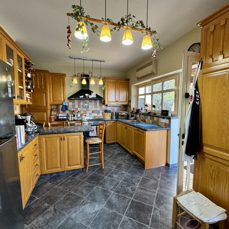 This charming Mediterranean-style property, located in the desirable area of Ag. Tychonas, offers a unique blend of elegance and comfort. Built on two levels, the house boasts a spacious open-plan living and sitting room with a cozy fireplace, perfect for family gatherings. The separate kitchen and dining area lead out to a large patio, BBQ area, and mature gardens, ideal for outdoor entertaining. The ground floor also includes a study/guest room with an ensuite bathroom and a convenient laundry room. Ascend the wooden stairwell to the first floor, which comprises three double bedrooms with fitted wardrobes and a family bathroom. The master bedroom features ensuite facilities, ensuring privacy and luxury. From the upper floor, enjoy stunning views of Ag. Tychonas village and the sea, offering a serene and picturesque backdrop.