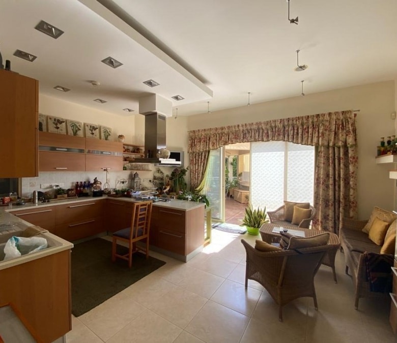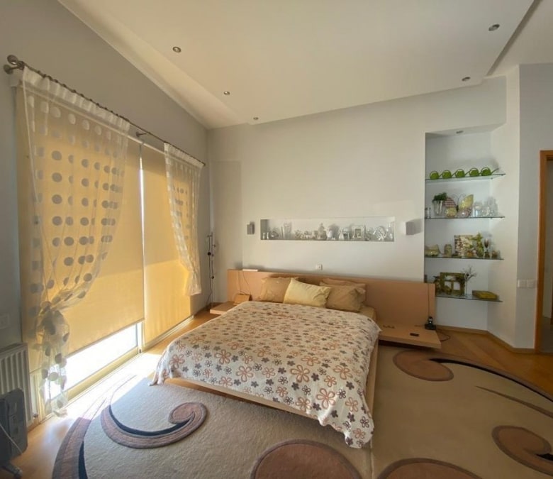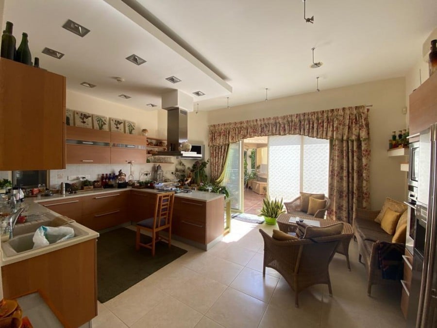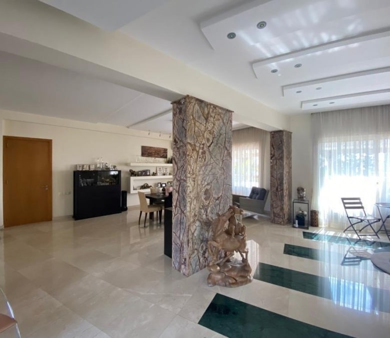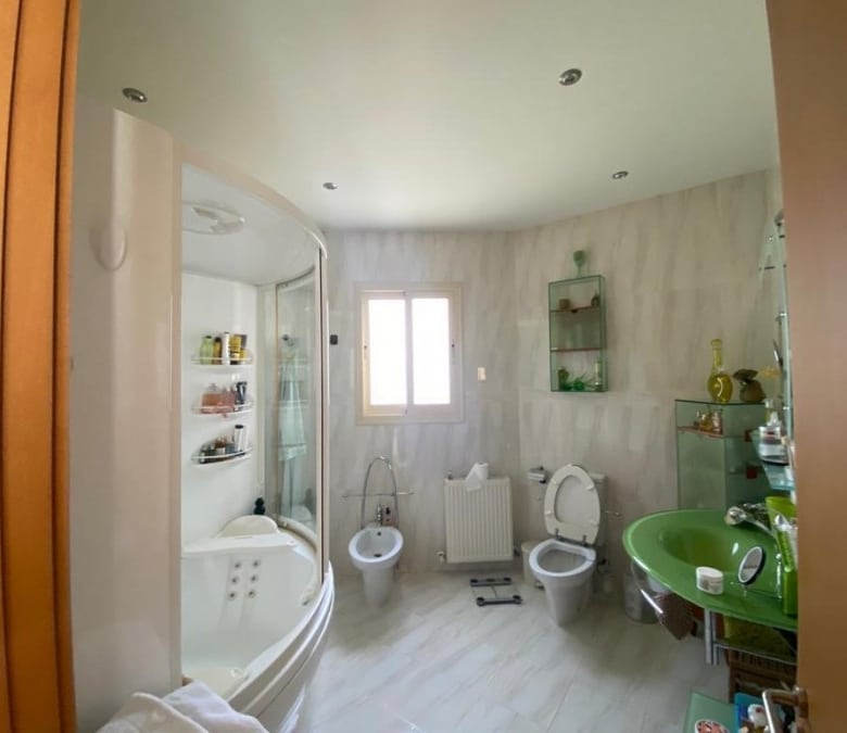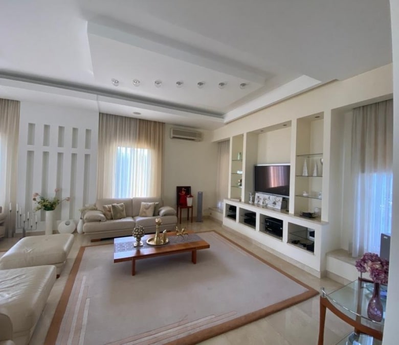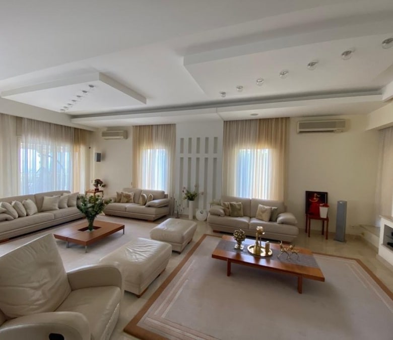 For sale a 5 bedrooms villa with panoramic sea view in Kalogiri, Limassol. It has total covered area 571 m2. The house consists of basement – 206 m2 – living room, kitchen-dining room, additional kitchen, laundry room, guest bathroom, first floor is 157 m2, 4 bedrooms, 4 wc, living room, billiard room with a fireplace – 60 m2, basement – garage 148 m2, garage, boiler room, pantry, sauna with bathroom, maid’s room with bathroom. Covered verandas – 62 m2, uncovered verandas – 144 m2, barbecue area with a terrace. There are also smart home system, video surveillance system, solar panels for electricity generation, and water heating, watering in the garden from an artesian well.