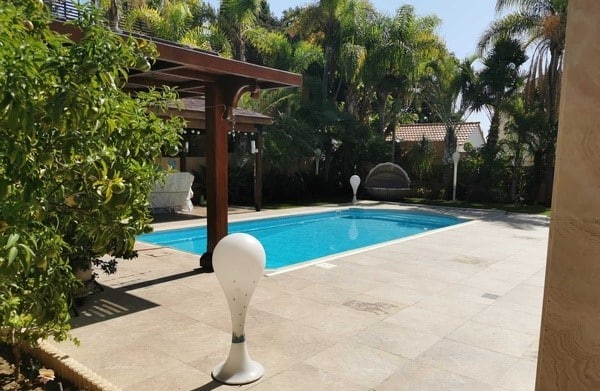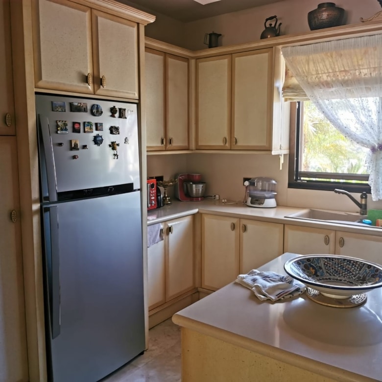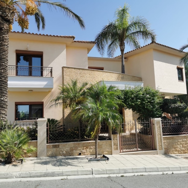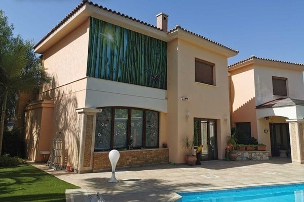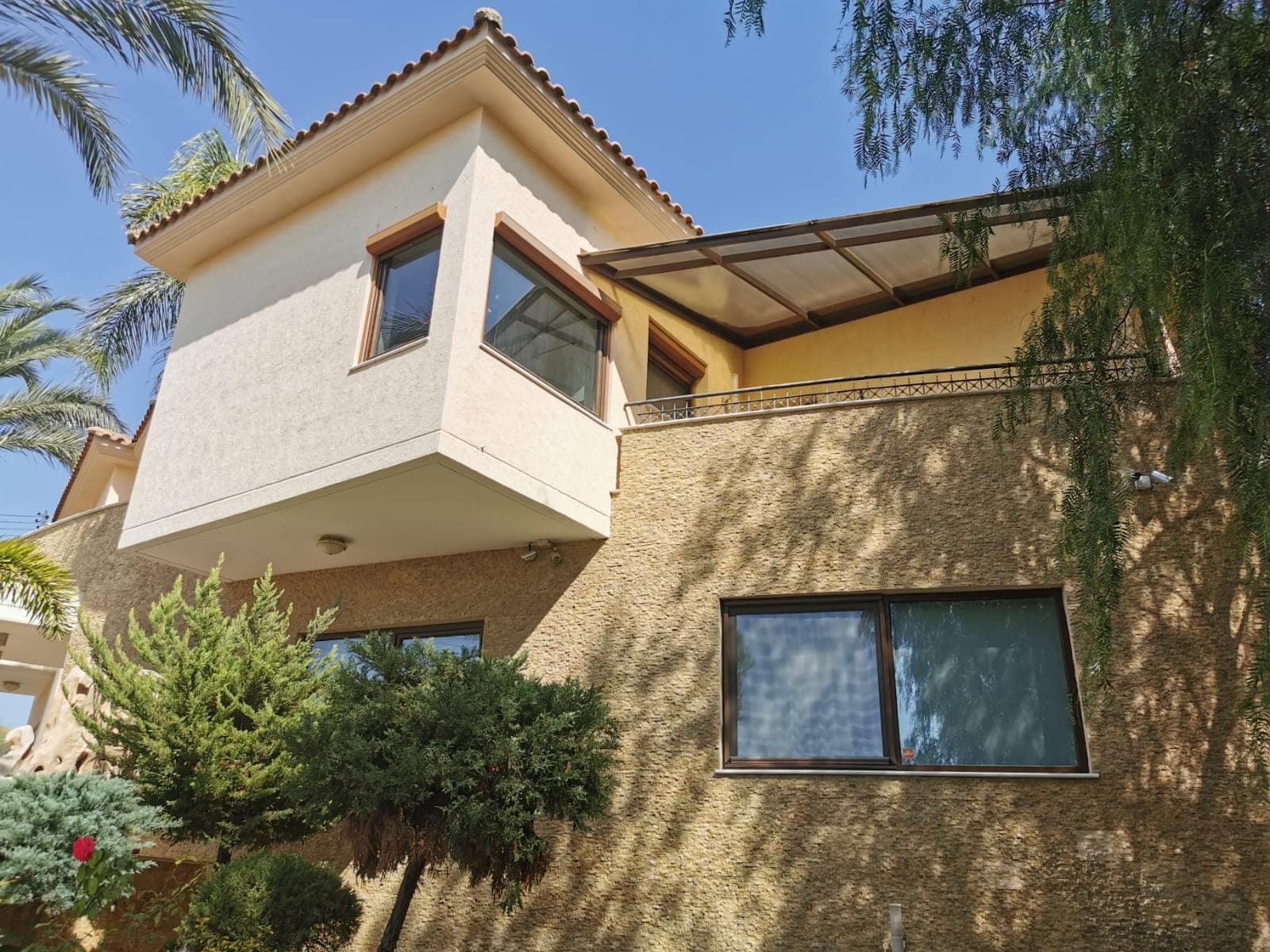 This luxurious 500 sq m villa and 1000 sq m plot in Cyprus is situated on the hills overlooking Limassol with the gorgeous city and sea views. The hills of Kalogiri-Mesovounia are the most prestigious area of Limassol. This is a three-level house with 5 bedrooms which come with 5 bathrooms, a spacious living room, a large kitchen and dining area, a bright play area for your children, and on top of that – a Telco elevator. Next to the house, there is a compact purposed-built guest house with an independent power and water supply, an underfloor heating system and air- conditioner, and a separate entrance. A staff area is located in the basement of the house and has a separate entrance, an individual kitchen, and a bathroom with a shower unit. This area is also equipped with a heating system and an air-conditioner. This is a customized project which is finished with the most expensive and luxurious materials: Venetian plastering, marble floor, with an effective staircase, hardwood door frames, and stain glasses from Italy – for inside decoration. The outside decoration of this house includes graffito and natural stones. You can enjoy the view on the surroundings from two balconies covered with the high- quality’s polycarbonate canopies.