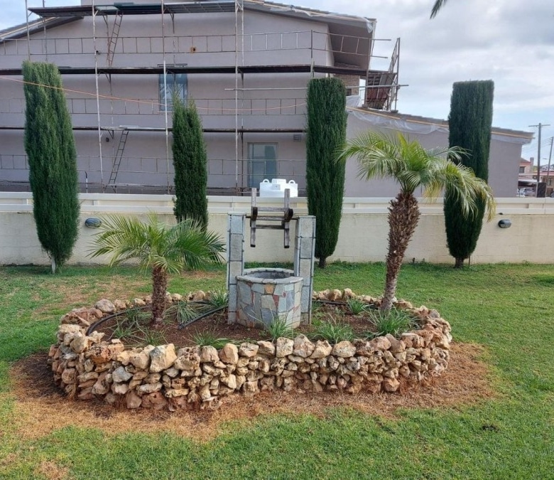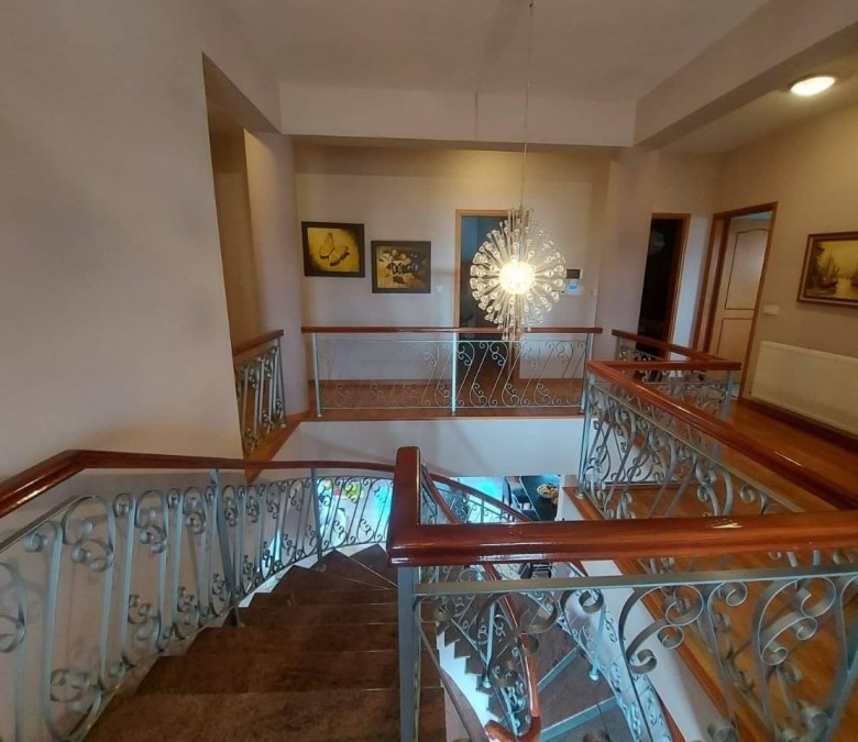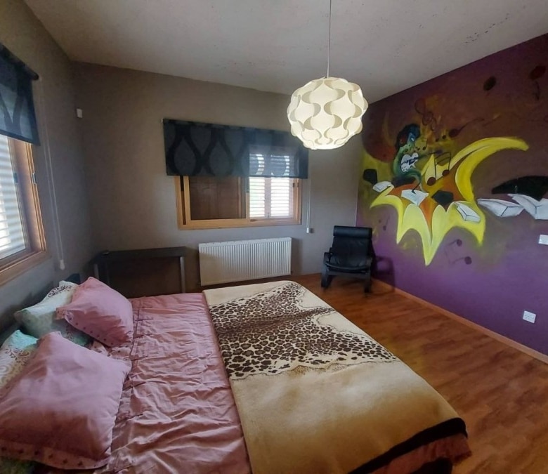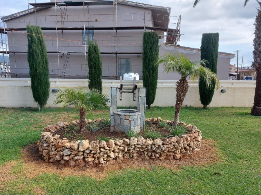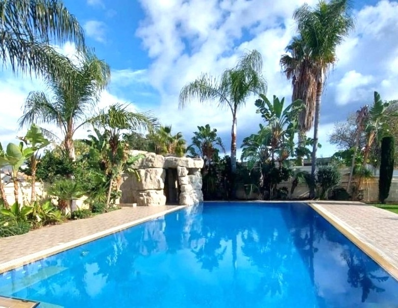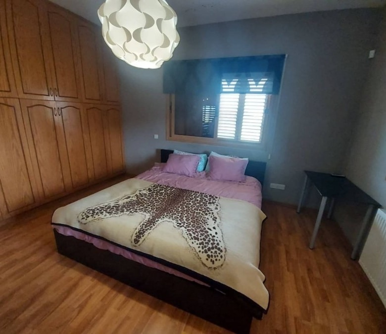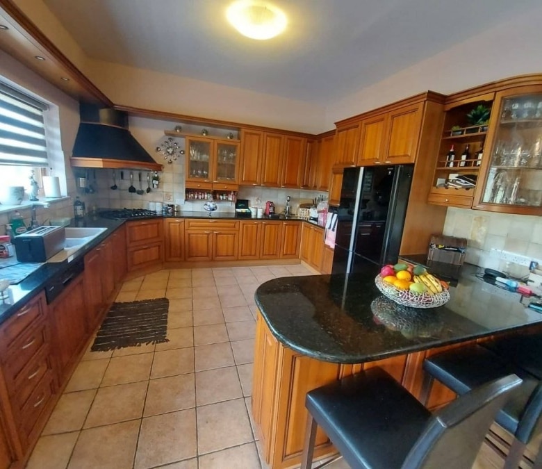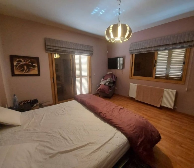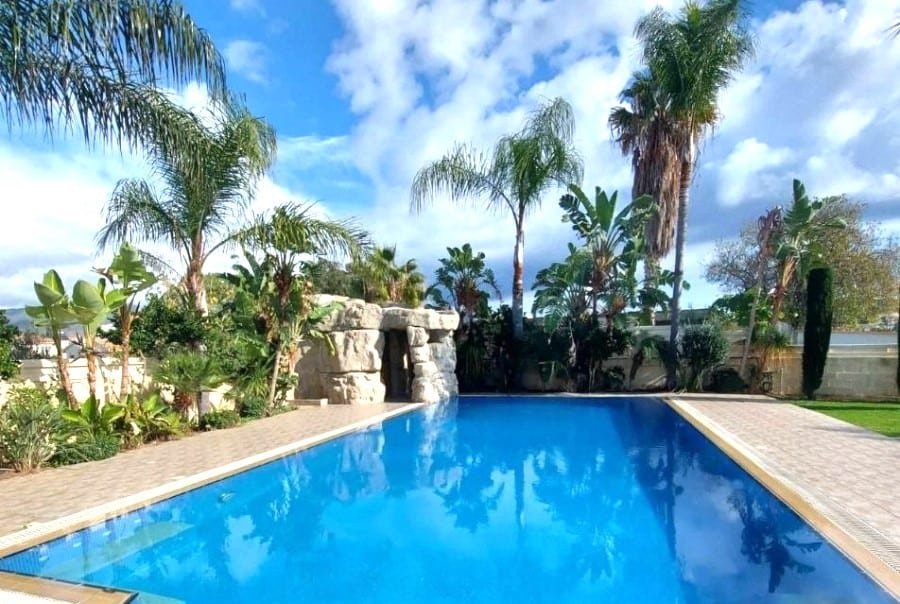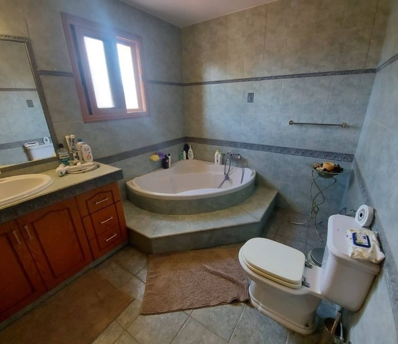 4-bedroom house with a private pool, fountain and garden with trees. Furnished. Air conditioning in all rooms. Central gas heating. Fireplace in the living room. There are 2 bathrooms in total, 2 additional bathrooms. Attic for storage. Barbecue area. Waterfall by the pool 7×12 with salt water. Garage for two cars. Electronic gates. Security system. Located in the Parekklisia area, a 10-minute drive from the center of Limassol.