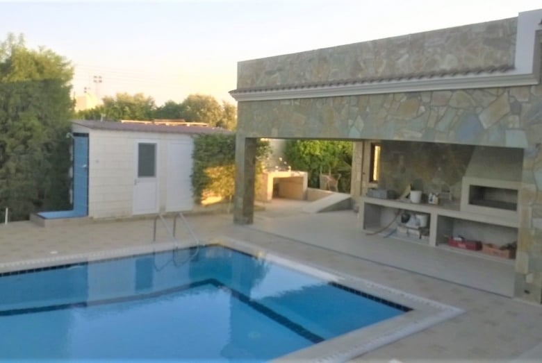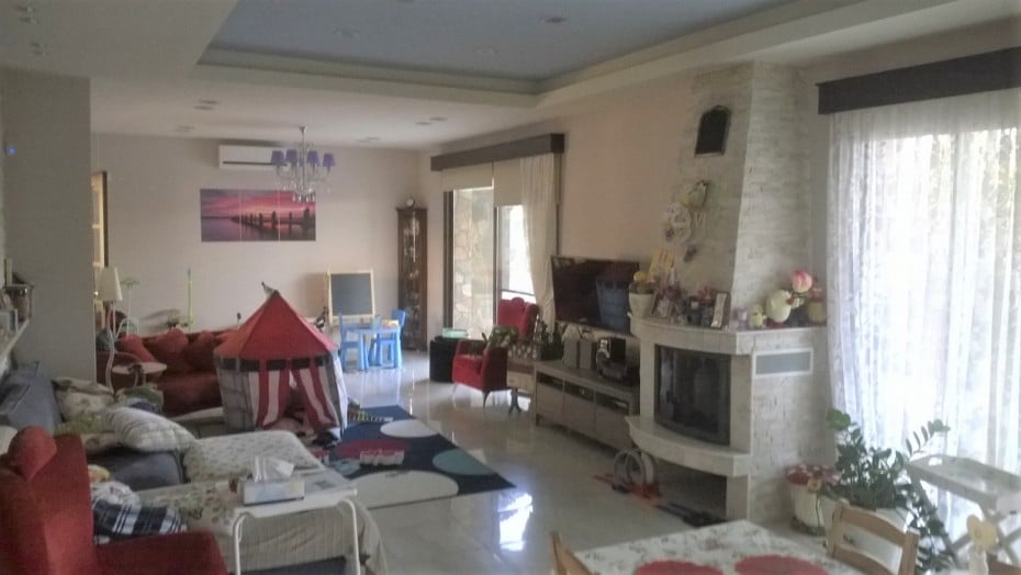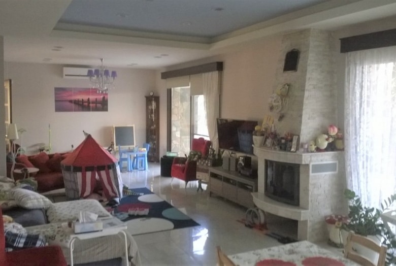A 4 bedroom detached house for sale in Dali, Nicosia with an extra room which is currently being used as an office. It is located only a 15 min drive from the town of Nicosia, 20-30 min drive from Larnaca, 40 min drive from Ay. Napa and a 40 min drive from Limassol. There is a private swimming pool with shower, changing room, barbecue area, dog house and WC outside. There is also a big attic of 70sqm approximately with storage room, shower and WC while the rest of the space could be used as a playroom, cinema or gym. The house consists of one big dining room, two living rooms which are open plan to a French styled kitchen and extra laundry room. There is one big bathroom and guest WC, big walking closet, a/c units in all of the rooms, floor heating (petrol), solar panels, 3 glaze windows, covered/uncovered and garage parking and mature gardens with fruit trees. Another plus is that there is space to build another house, tennis court, offices, swimming pool or even gas station.