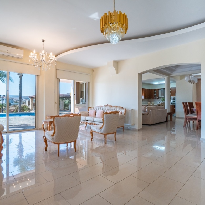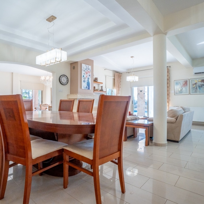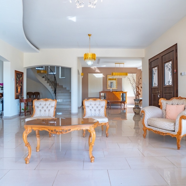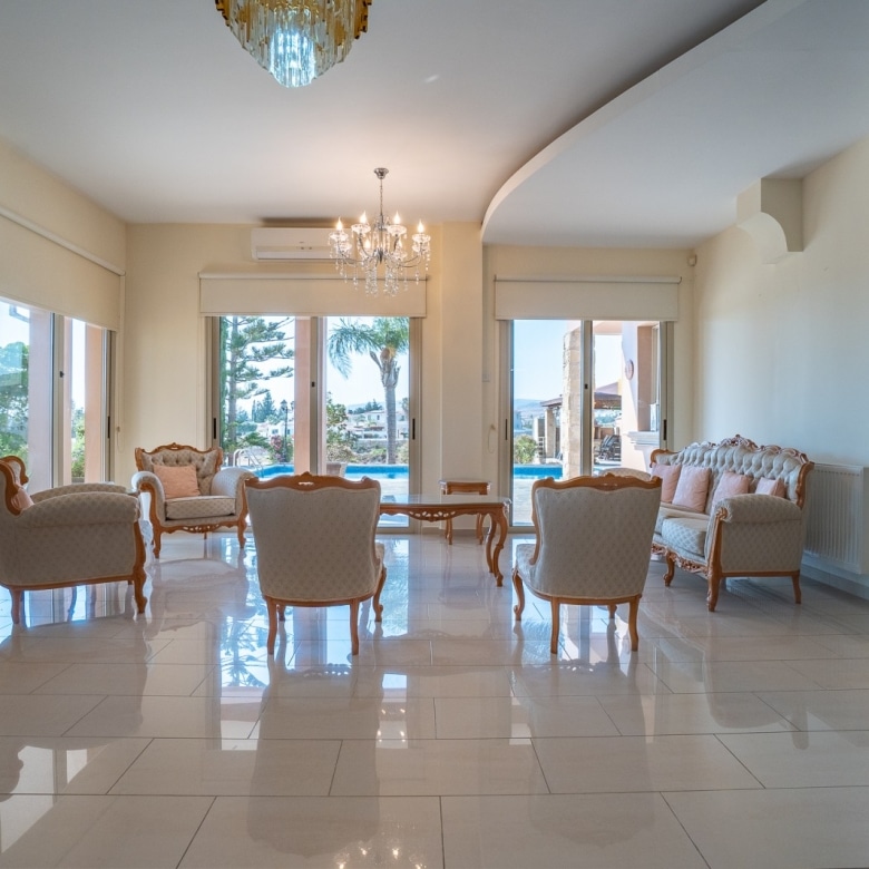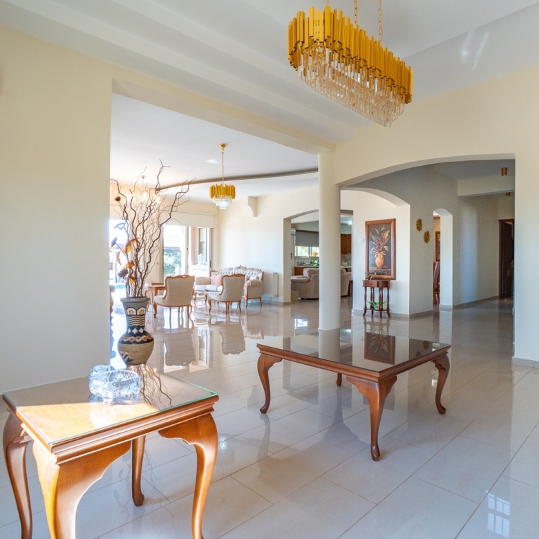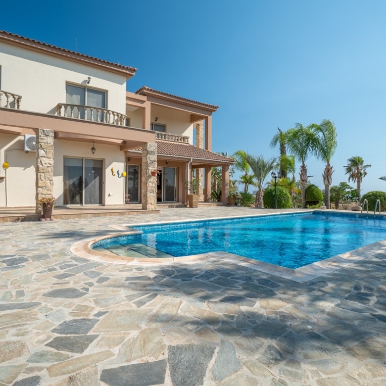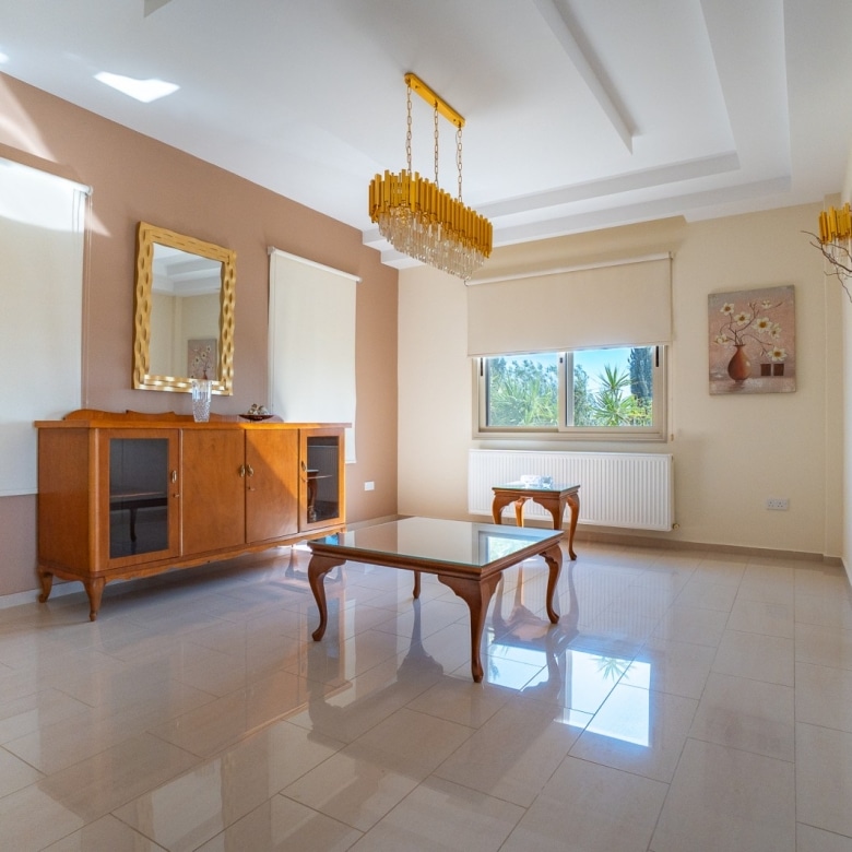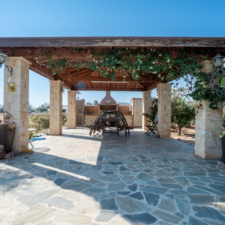 A Large luxurious Villa set in the hills of Anarita offers exclusive privacy and comfort. The villa, covering 360sqm has been built on a large plot of 3000sqm and is surrounded but mature landscaped gardens, with a large covered barbeque area and private swimming pool. As it is built on the hill is also allows for lovely views of the mountains at the back and sea views at the front. Upon entering the house you are met with two open sitting rooms either side of you and a large open kitchen in front with a connected dining area. One bedroom on the ground floor with its own bathroom give ease of living. Upstairs there is a large landing area with a small kitchenette, equipped with storage space and a washing machine. There are 3 large bedrooms on the first floor including the master bedroom with its walk-in wardrobe and ensuite bathroom.