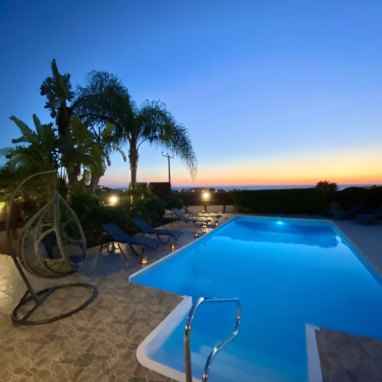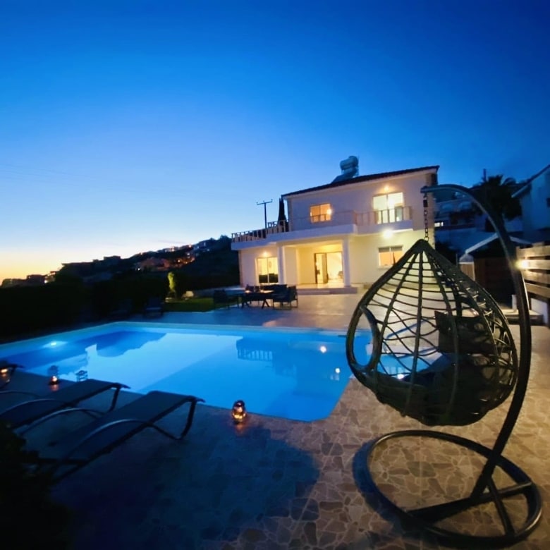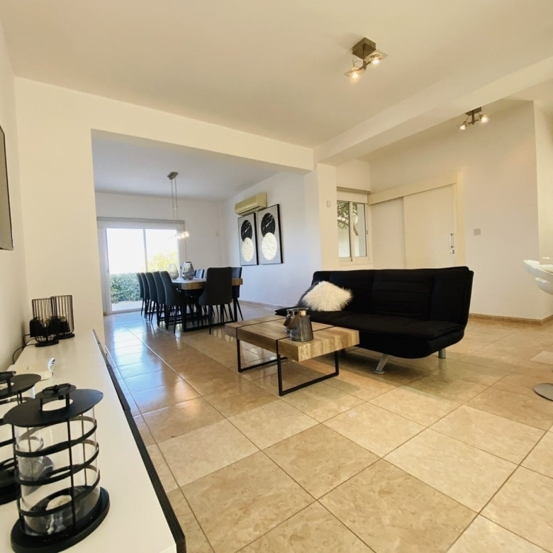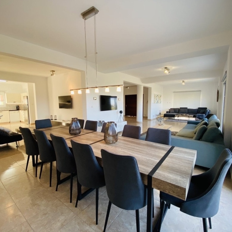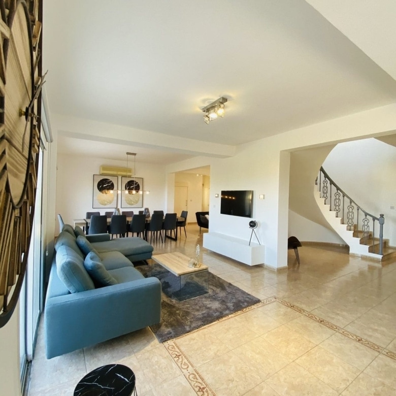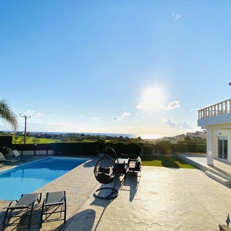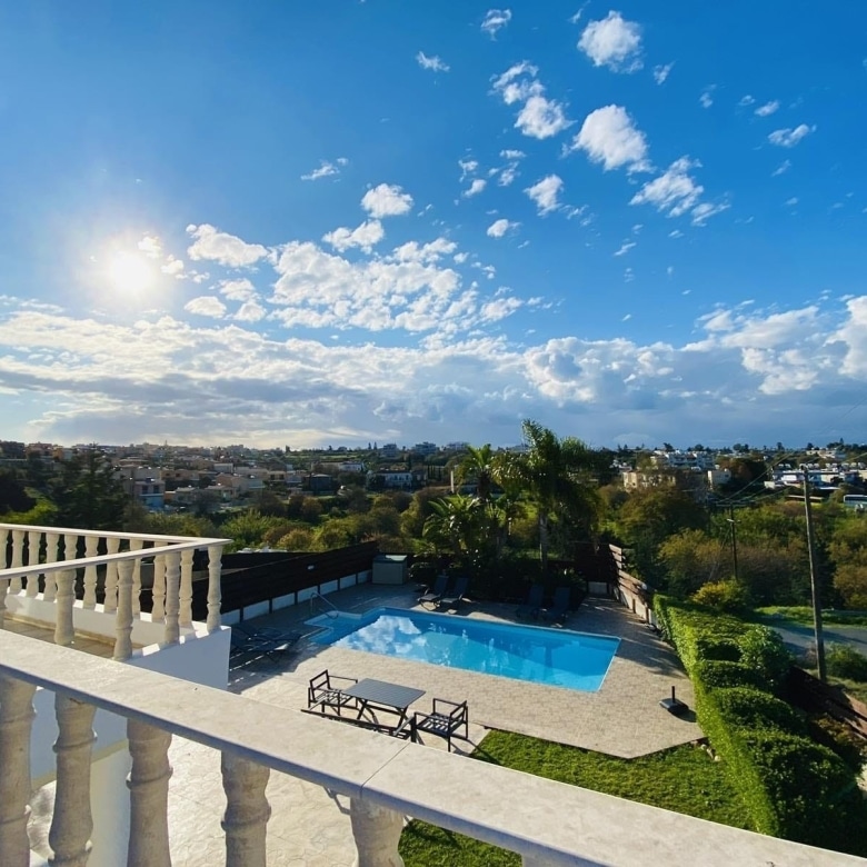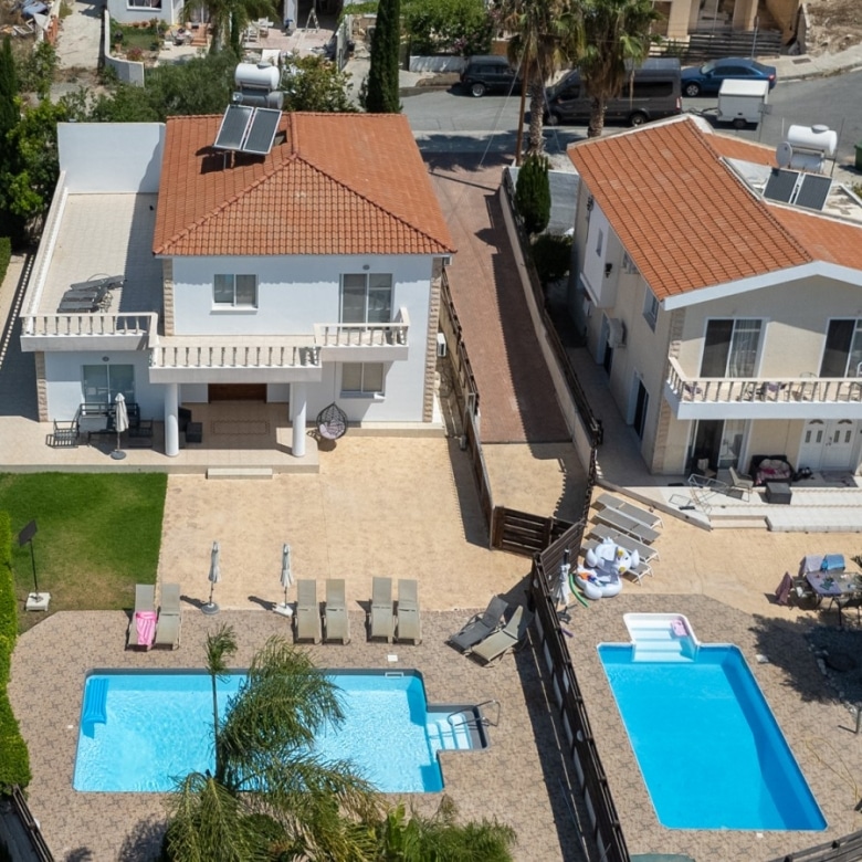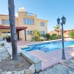 This 5 bedroom villa is located in lower Chloraka -Pafos. The entrance, dining room, 2 living rooms, kitchen, 2 bathrooms, kitchennete, & 1 bedroom(guest room) are on the ground floor while 4 bedrooms and 2 bathrooms on the 1st floor with the master bedroom en-suite & utility room on the top. The covered area of the villa is 300 square meters, the verandas 80 square meters while the plot is 800 square meters. The villa has a private road leading to its entrance with an electric gate. It has a private swimming pool, fully fitted kitchen, laundry room, double glazed windows, air conditioning, provision for central heating, store room, fly screens, jacuzzi, pool shower, open parking. The villa has amazing sea view and Mountain View but at the same time its very close to the center of Pafos.