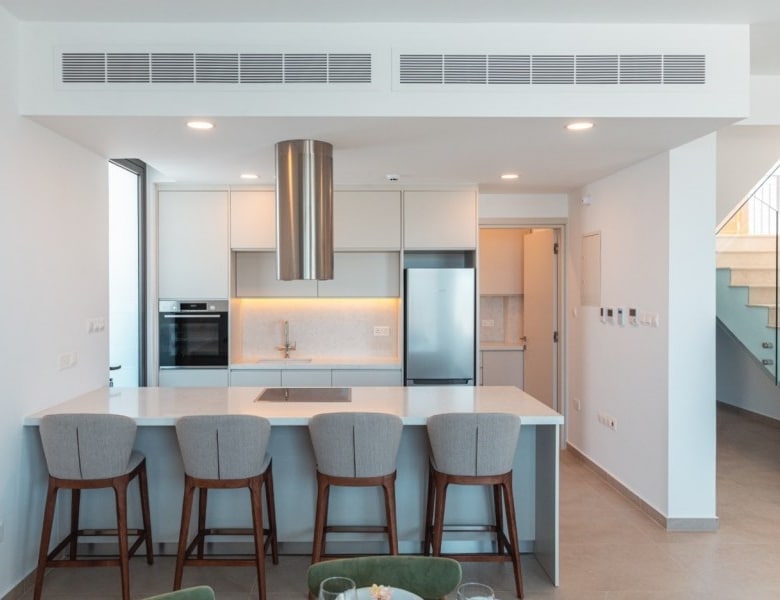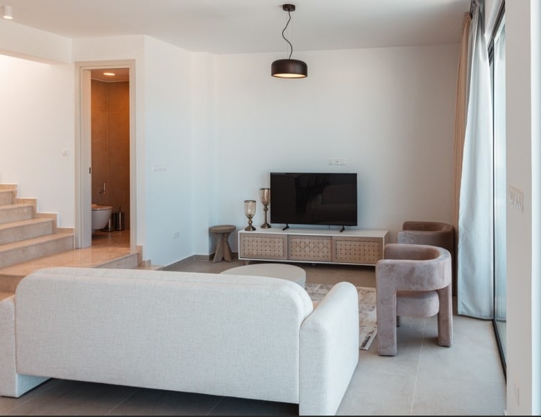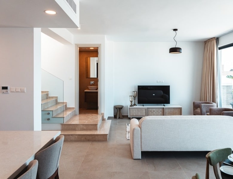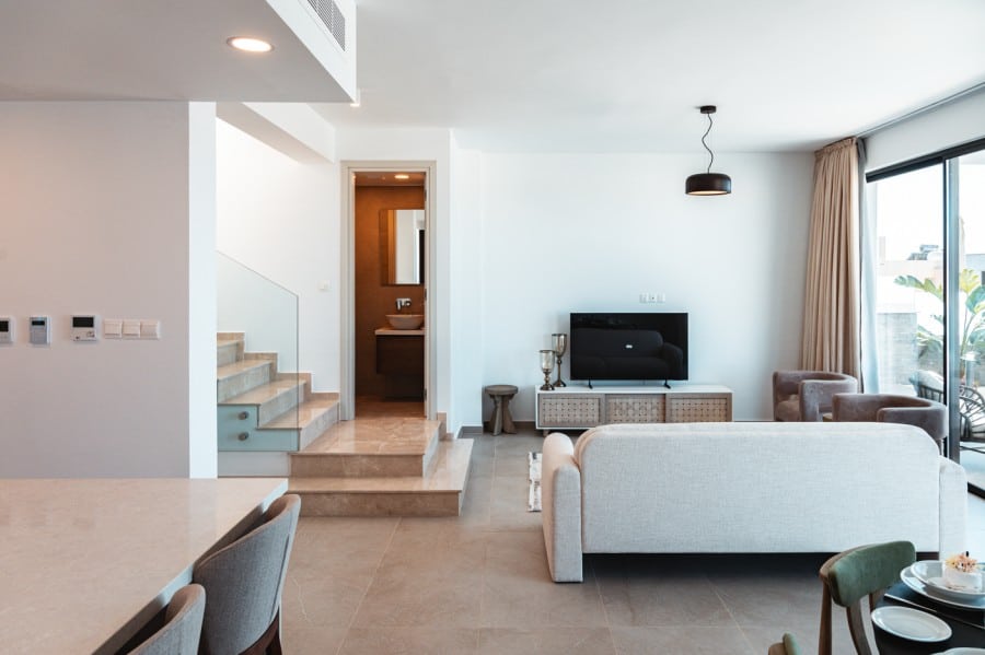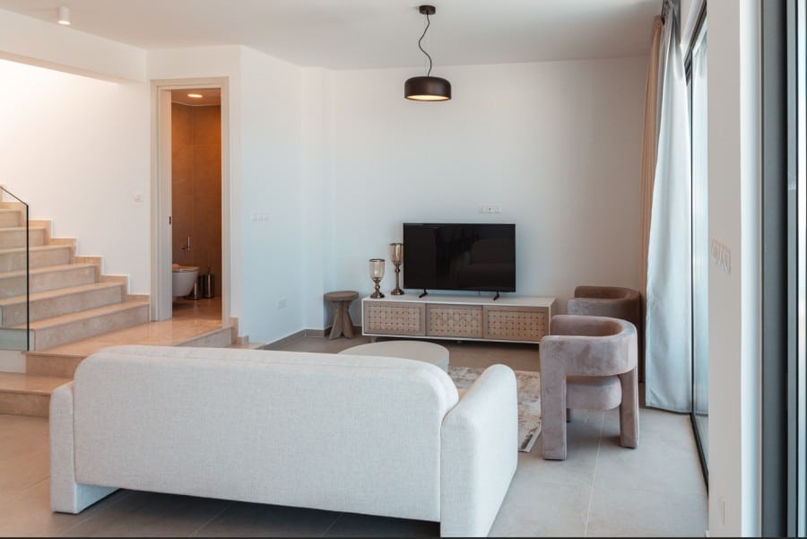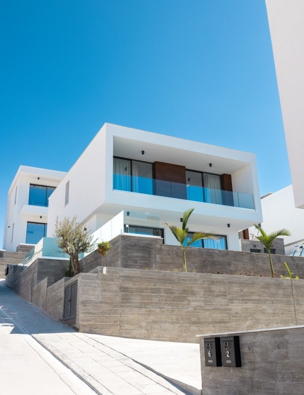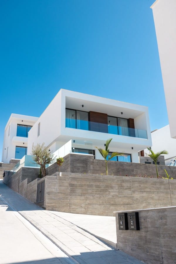 Nestled in Chloraka’s prestigious district, are 7 remarkable three-bedroom villas within a luxury complex in Paphos. With stunning sea views, these modern homes blend seamlessly with the lush Mediterranean surroundings. Just a short walk from the sea, residents can enjoy tranquility and breathtaking sunsets. Close to pristine beaches and upscale hotels, these luxurious villas epitomize seaside living. The sleek architecture features clean facades and minimal ornamentation, harmonizing with the natural environment. Perched on a hillside, the villas maximize views of the greenery, creating a peaceful atmosphere. This modern complex provides a range of amenities, including nearby restaurants, shops, schools, and supermarkets, ensuring convenience for residents. Every detail has been meticulously designed, incorporating modern materials like glass, aluminum, and concrete. Expansive windows bathe the interiors in natural light, accentuating the carefully chosen color palette that blends with nature. With spacious layouts and high-end finishes, each villa offers privacy and luxury. From warm wood flooring in the bedrooms to exquisite Italian tiles leading to a private terrace and infinity pool, no detail has been overlooked. Built with sustainability in mind, these sea view villas feature energy-efficient cooling, thermal insulation, and upgraded aluminum.