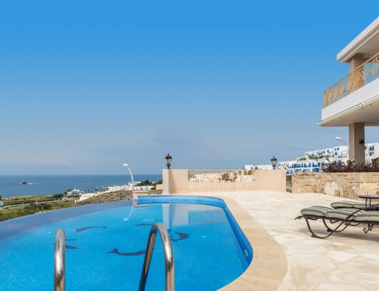 An amazing 4-bedroom 5 bathrooms luxury villa with stunning sea views is located on a gently sloping hillside in Chloraka on the outskirts of Paphos. The villa is just 300m from the sea and the nearby luxury beach hotels, in an exclusive coastal area, within walking distance of the shops and nightlife. The project is a special project of fabulous plots and individually designed villas.