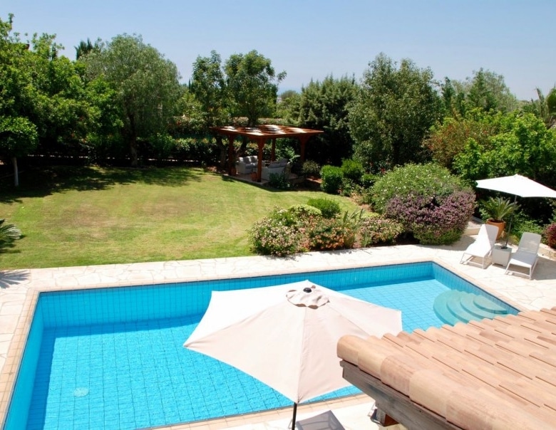 A very rare opportunity to acquire a stunning, spacious property situated in the Western Plateau of this world-renowned 5 Star Resort, within walking distance to the amenities. As you walk down the path in the midst of the beautiful terraced landscaped gardens and through the front door, there is an open plan living room and dining area with patio doors looking out onto the poolside terrace area, the pool and exquisite rear gardens. There is a modern kitchen with breakfast bar with a door leading to the drive and also a large understairs storeroom. The first double and twin bedrooms are both located on the ground floor level, are spacious and both have patio doors that open out to the outside terrace and garden. These bedrooms share a bathroom with a walk-in shower. Stairs lead to the lovely master bedroom suite which is a beautiful double aspect room with its own private balcony and en suite bathroom (with large walk in shower). There is also a large roof terrace which is accessed from the first floor landing that looks out down the ravine and sea in the distance. In the rear garden there is a lovely lawn with a seating area underneath a wooden pergola, benefitting from day-round sunshine because the garden is south-facing. There is an outside kitchen area with a pizza oven, sink and gas BBQ as well, together with a large covered verandah leading from the lounge and dining room.