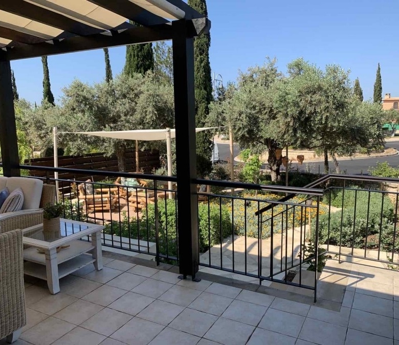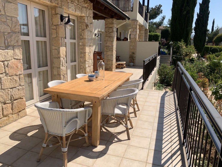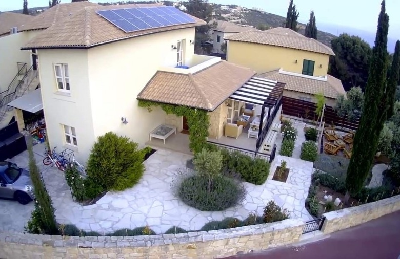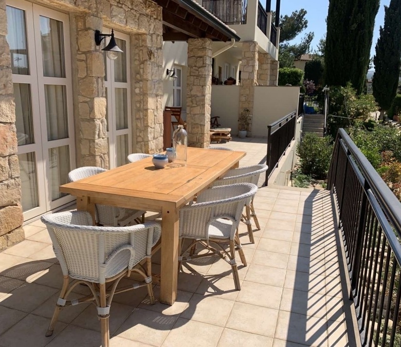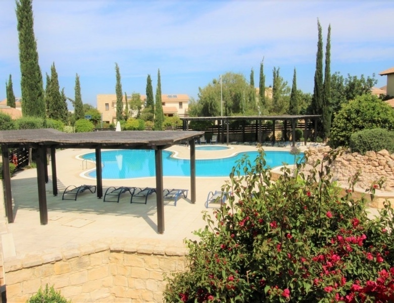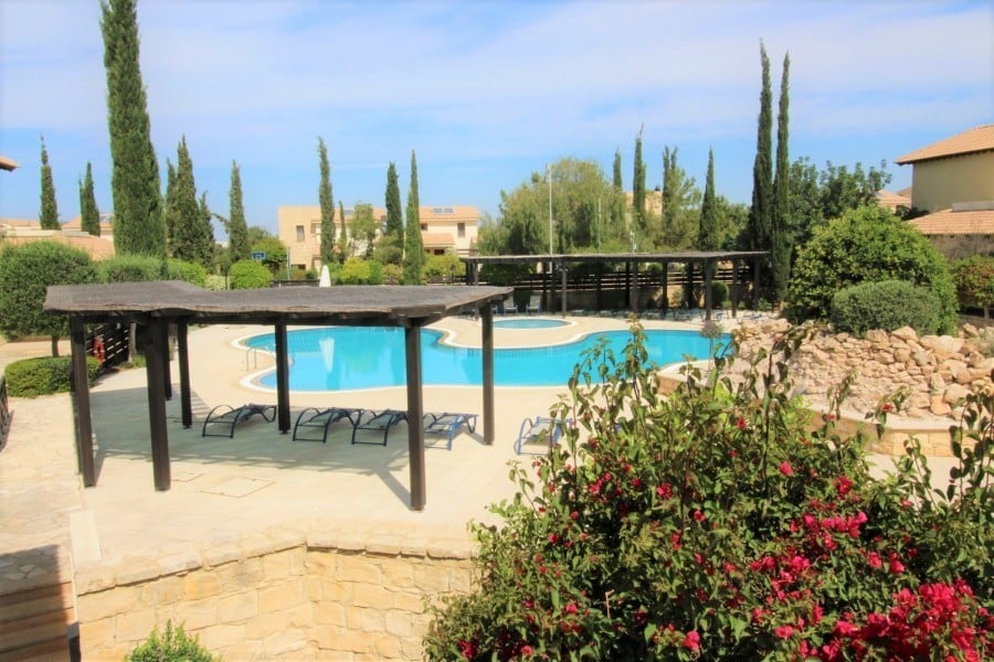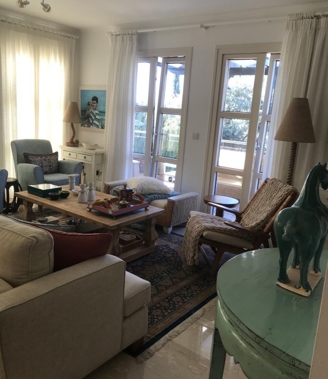 Ideally located walking distance from the Village square located on the west end of Adonis Village at Aphrodite Hills with a large yard mature garder, beautiful landscaped, large deck with a fish pond, automatic Irrigation system. The villa includes 450W photovoltaic. Ac on all rooms, tv room with fireplace upstairs. There are two entrances to the villa. The entrance to the property itself is surrounded by mature landscaped gardens filled wit indigenous flowers and trees. In addition the property boasts access to a large communal pool. The kitchen, which is separate from the living/dining area, is fully equipped with all electrical appliances, including microwave, dishwasher, washing machine, fridge/freezer and oven with hob extractor hood and build in microwave. The kitchen also boasts an additional dining area The master bedroom is located on the second floor, parquet floors and fresh doors with a balcony looking out over the resort. A large marble staircase leads up to bedrooms upstairs. Bedroom two is a double room decorated in modern, bold tones. There is a grand wooden double bed, side tables with lamps, fitted wardrobes and French doors leading to the upstairs terrace. The communal pool is just a few steps away, as is the Village Square with its shops and restaurants, Spa and golf clubhouse.